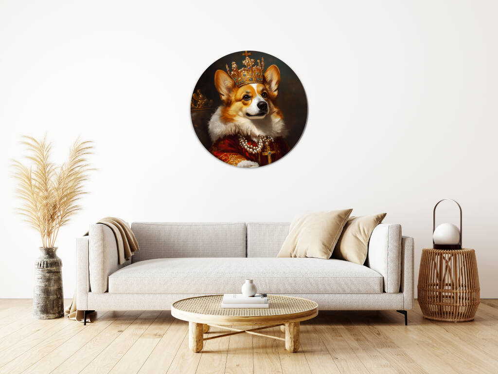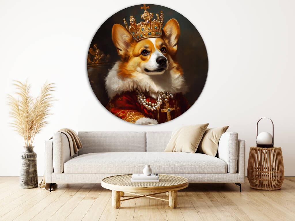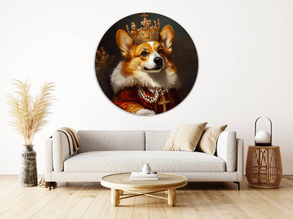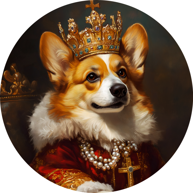 Een koninklijke uitstraling en speelse charme komen samen in Corgi Queen. Dit majestueuze kunstwerk toont een elegante corgi, gekleed in een weelderige rode mantel met gouden borduursels en luxueuze witte bontdetails. Haar koninklijke allure wordt versterkt door een schitterende kroon, rijk versierd met edelstenen en een imposant kruis. De parelkettingen en het sierlijke gouden kruis aan haar hals voegen een extra laag van vorstelijke grandeur toe.