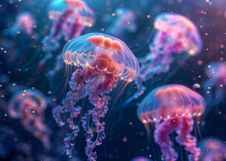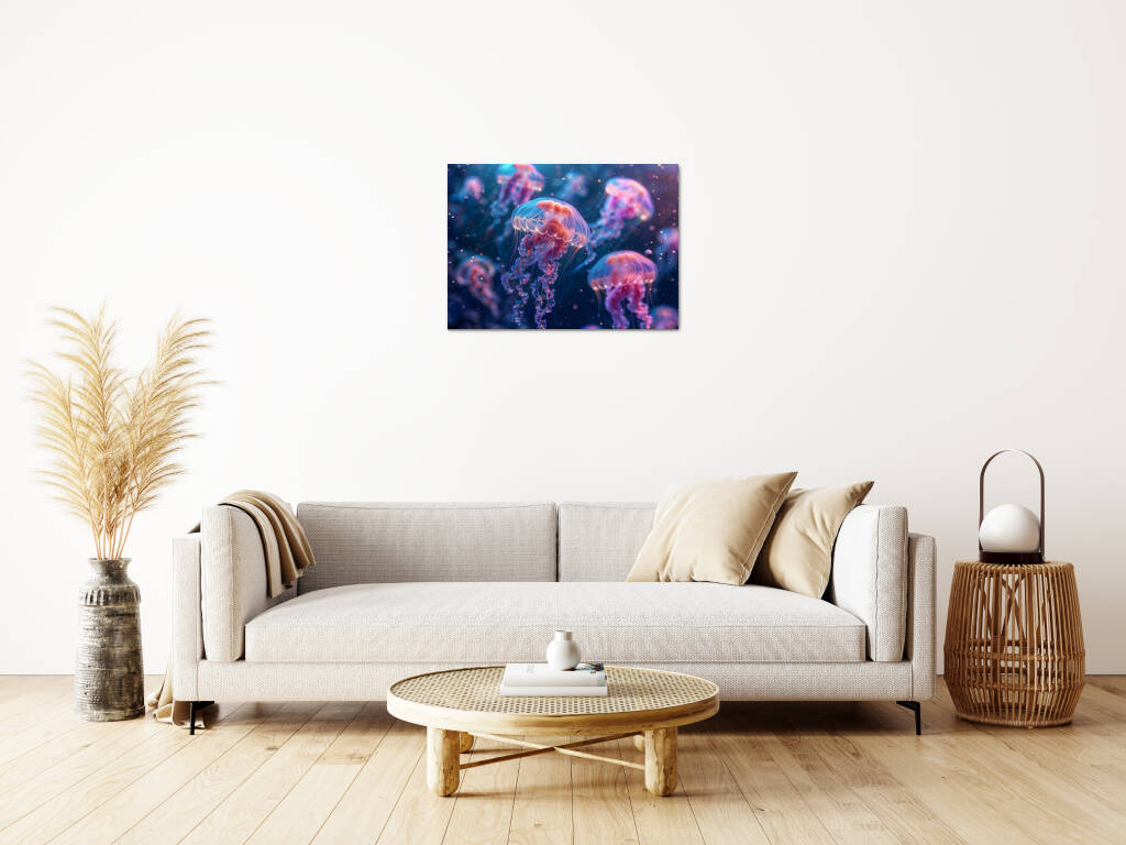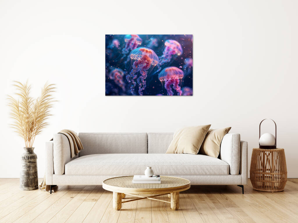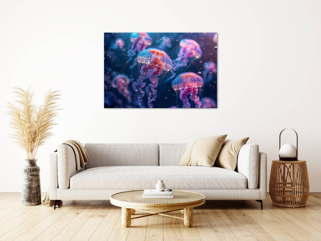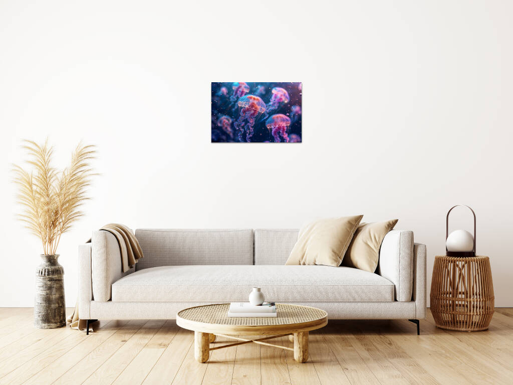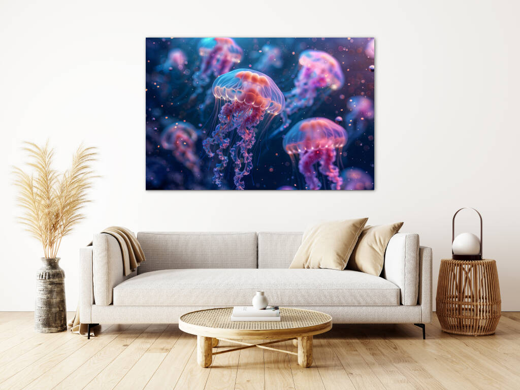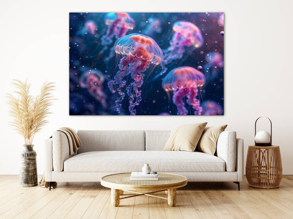 Moon Jellyfish is een betoverend tafereel dat de serene elegantie van deze zachte zeebewoners vangt. De kwallen zweven gewichtloos door het diepe blauw van de oceaan, hun doorschijnende, koepelvormige lichamen gloeien zachtjes in tinten van lila, roze en lichtblauw. Hun delicate tentakels dansen sierlijk mee met de stroming, als zwevende linten die fonkelen in het gefilterde licht. De achtergrond vervaagt in een dromerige waas van bubbels en waterdeeltjes, wat de illusie wekt van een oneindige, mysterieuze onderwaterwereld. De compositie straalt rust en verwondering uit, alsof je zelf door de diepten zweeft tussen deze magische wezens.