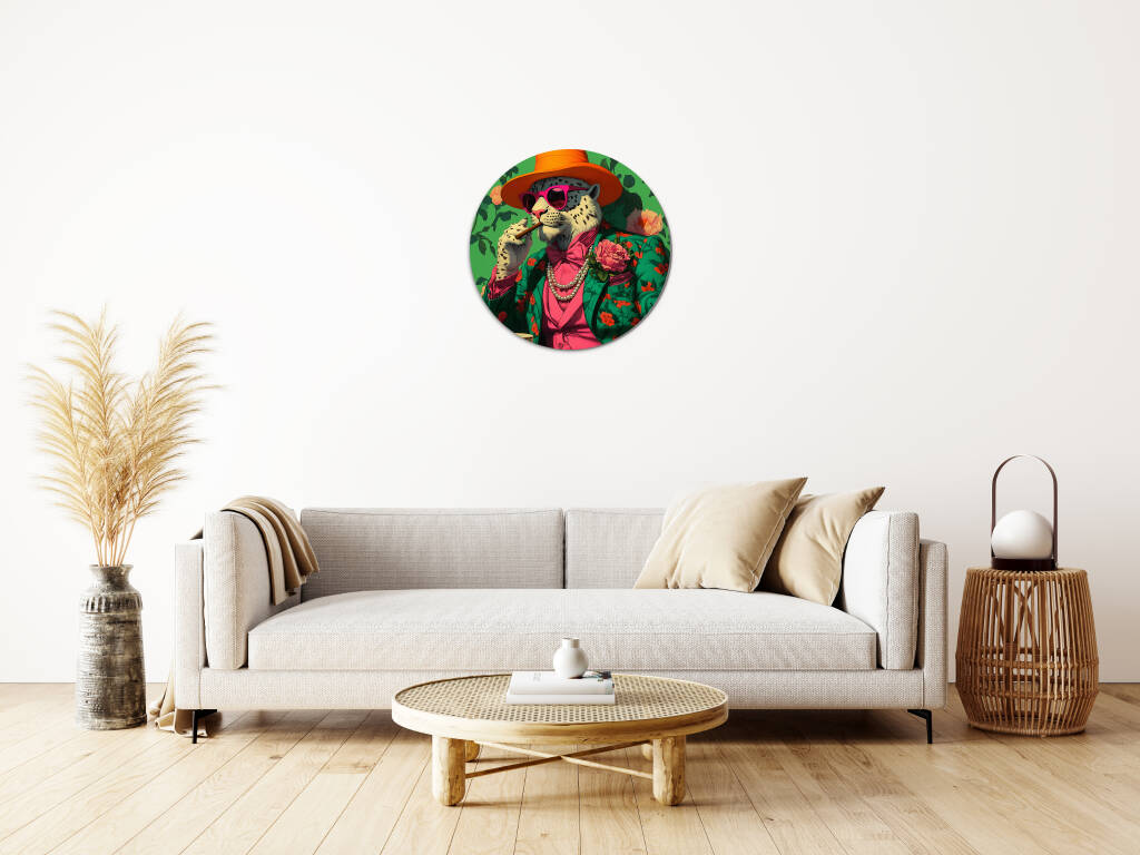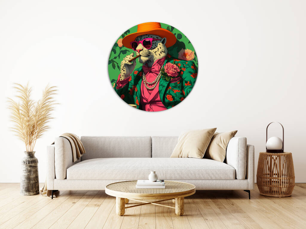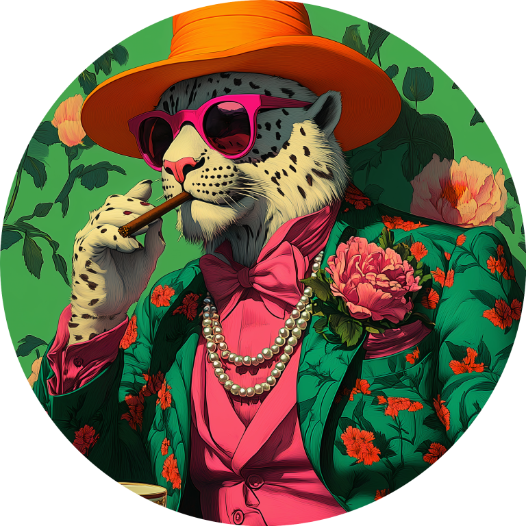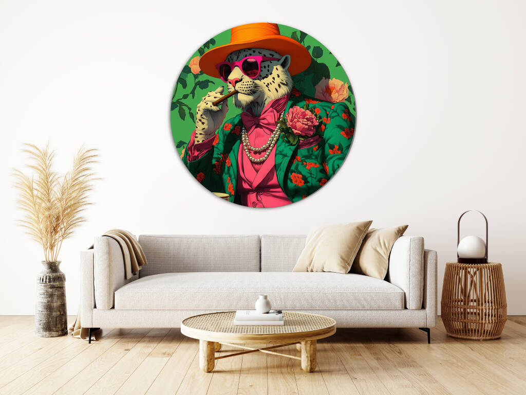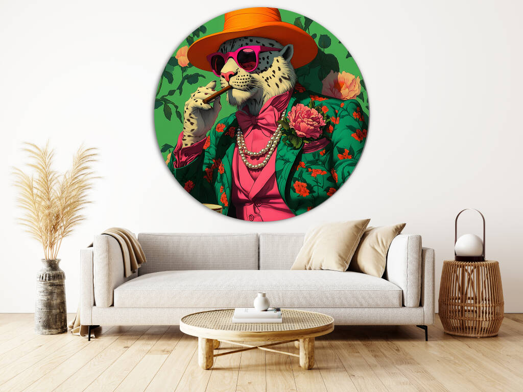 Hustler presenteert een charmante en humoristische scène waarin een stijlvolle luipaard geniet van een verfijnde theepauze te midden van een weelderige bloemental. Gekleed in een felroze vest, oranje hoed en trendy zonnebril straalt dit katachtige karakter pure elegantie en zelfvertrouwen uit. De levendige kleuren van de bloemen en het speelse contrast tussen wilde natuur en geciviliseerde manieren creëren een vrolijke, satirische sfeer. Dit eigentijdse kunstwerk brengt humor en kleur in elke ruimte en nodigt uit tot een glimlach.
