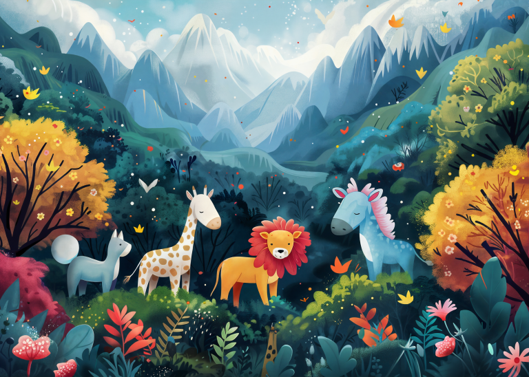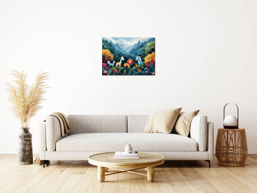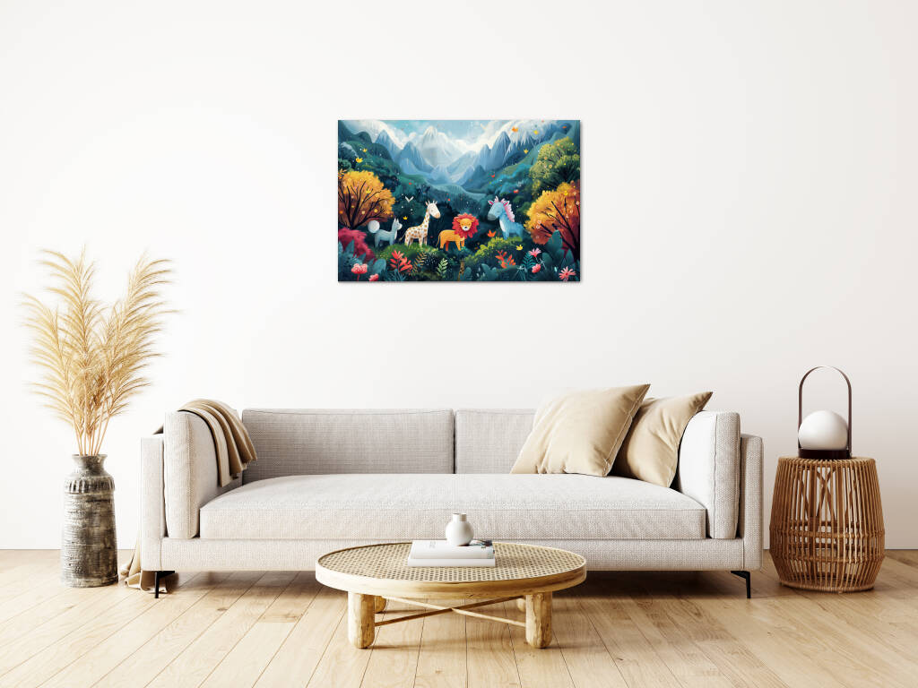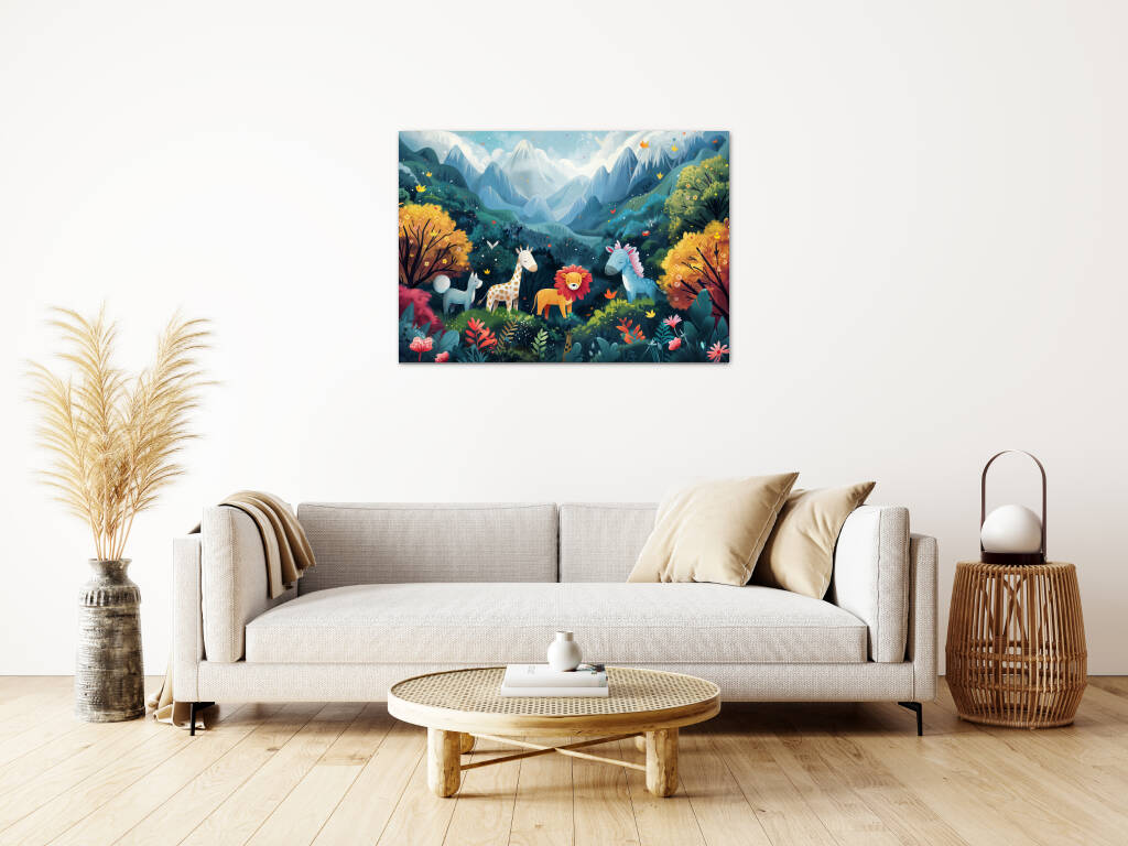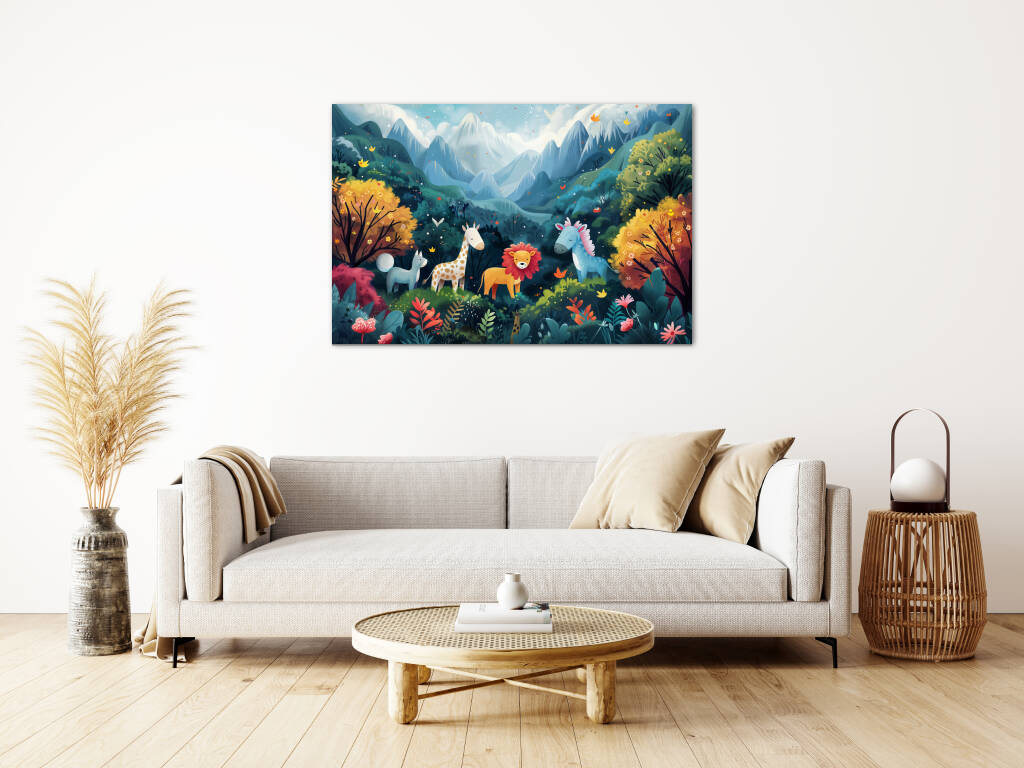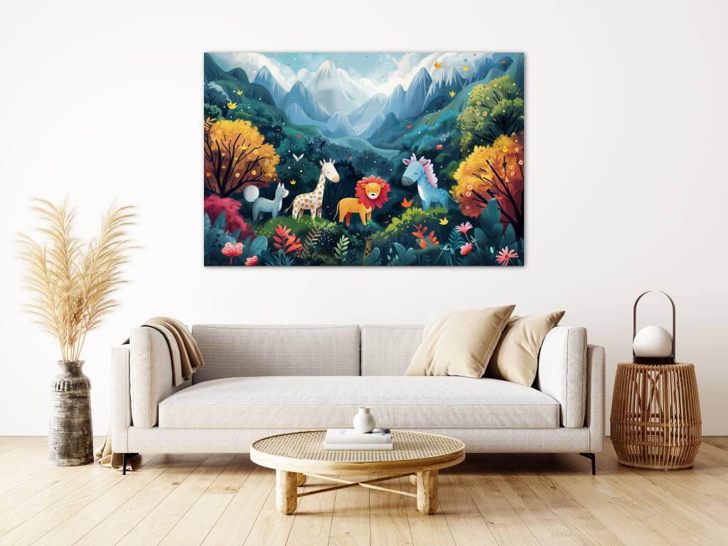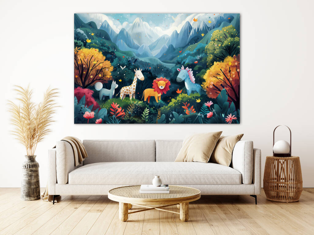Animal Jungle toont een levendig, sprookjesachtig oerwoud waar schattige dieren samenkomen te midden van een kleurrijk, weelderig landschap. De achtergrond bestaat uit majestueuze bergen, met een heldere blauwe lucht vol kleurrijke dwarrelende blaadjes. De jungle is een explosie van warme herfstkleuren zoals geel, oranje en rood, gecombineerd met diepe groene tinten, wat de scène zowel rustgevend als magisch maakt. Deze illustratie ademt avontuur en vriendschap, perfect voor een kinderkamer of een speelse, inspirerende ruimte.