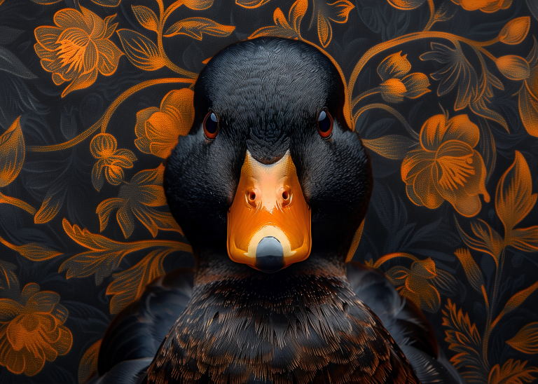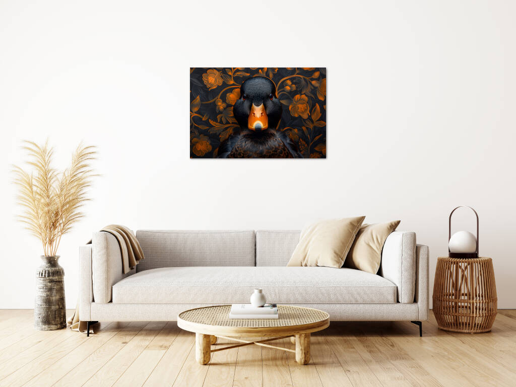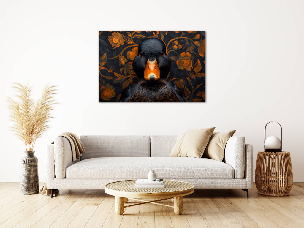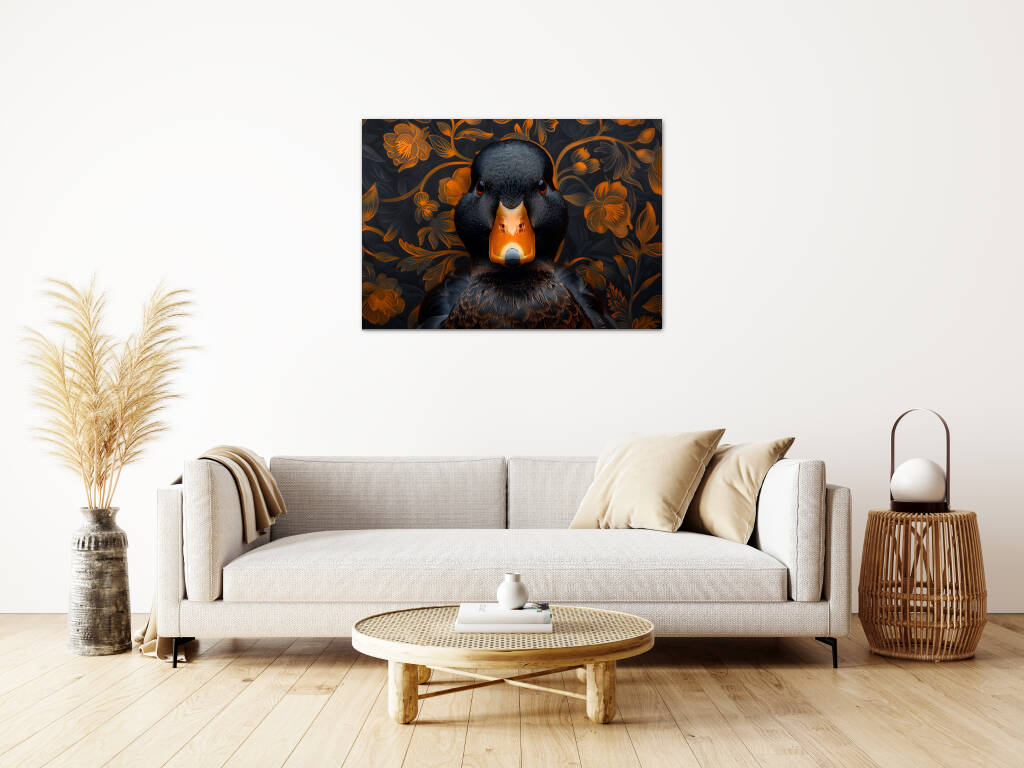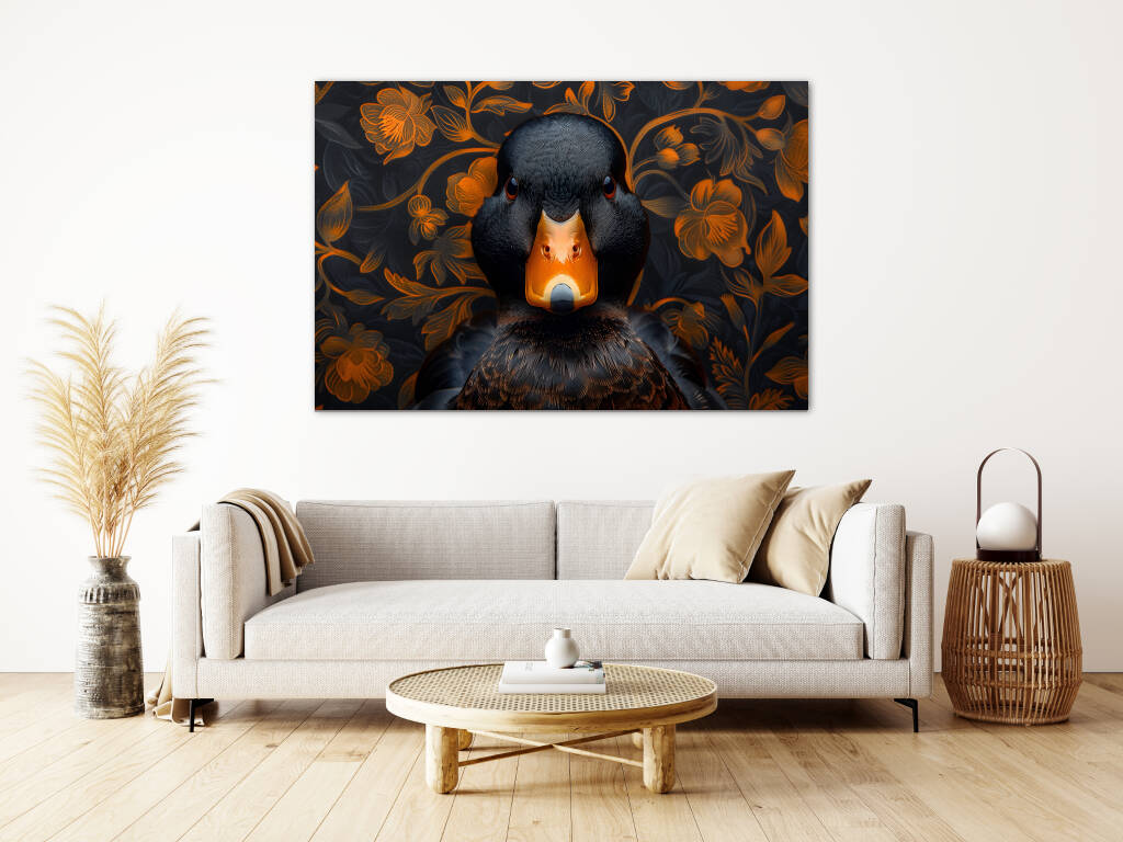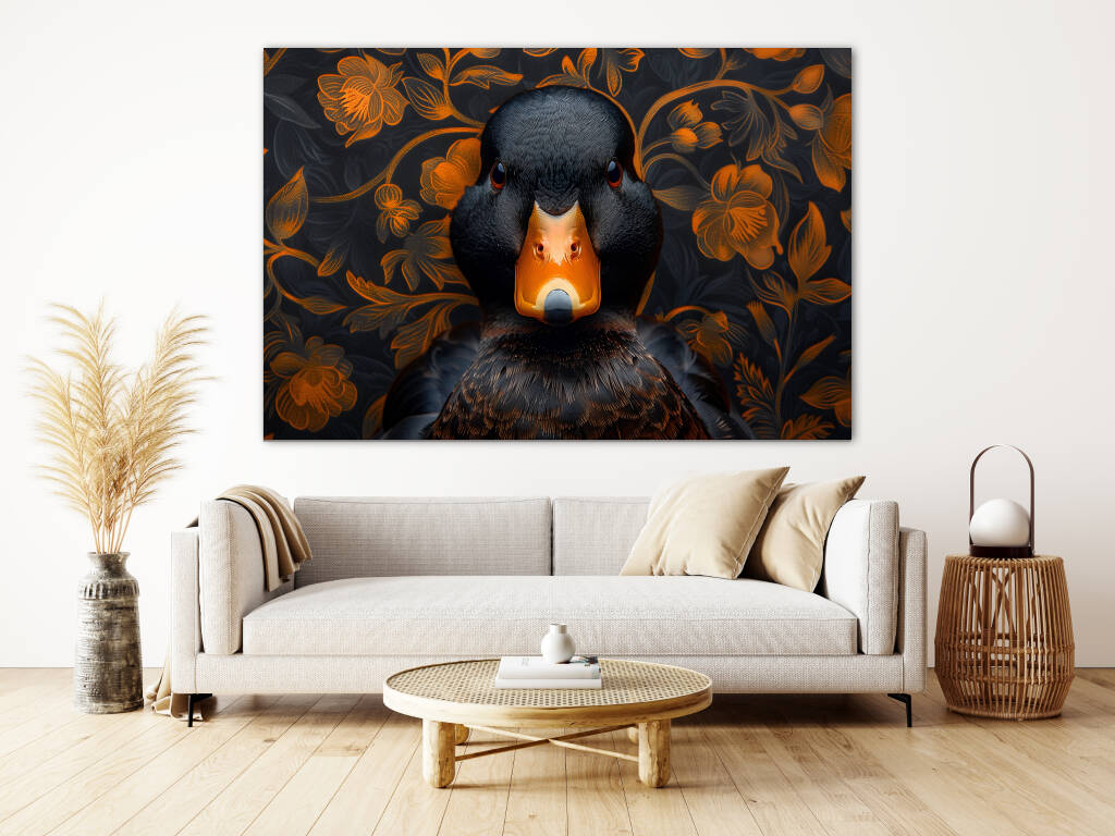 Judgy Duck is een eigenzinnig en stijlvol kunstwerk dat direct de aandacht trekt. In het midden prijkt een zwarte eend met een indringende, oordelende blik - alsof hij je recht aankijkt en zijn mening al klaar heeft. Zijn feloranje snavel vormt een krachtig contrast met het diepe zwart van zijn verenkleed. De achtergrond is rijk versierd met een patroon van oranje bloemen op een donkere ondergrond, wat een chique, barokke sfeer oproept. Deze combinatie van humor, elegantie en attitude maakt het een echte blikvanger met karakter.