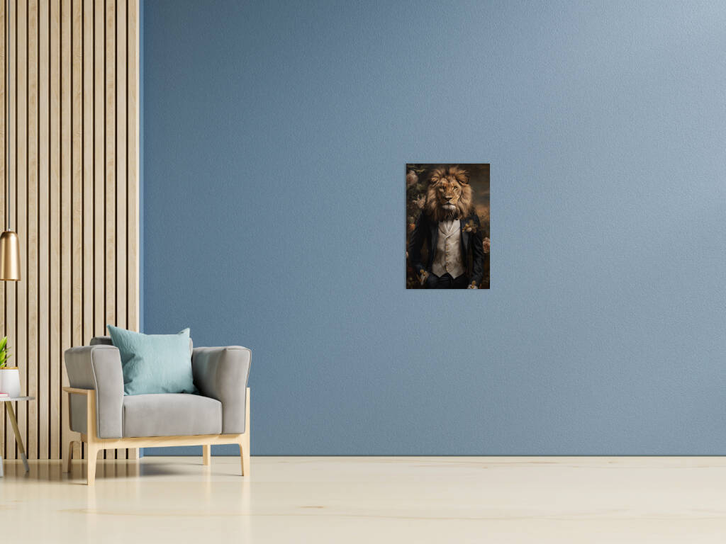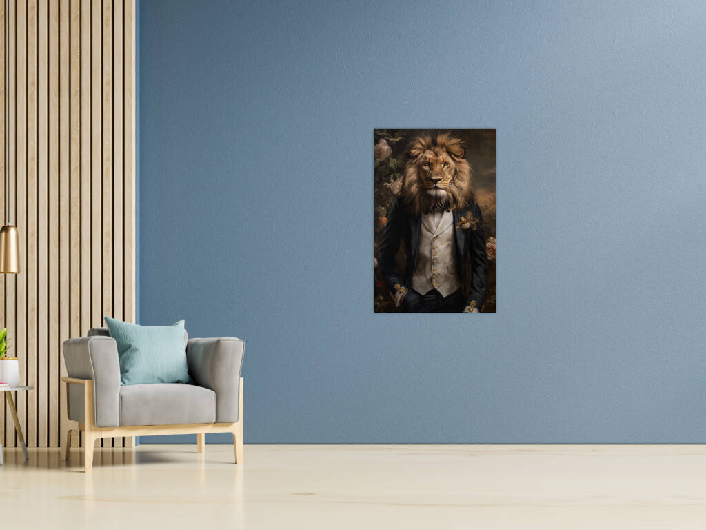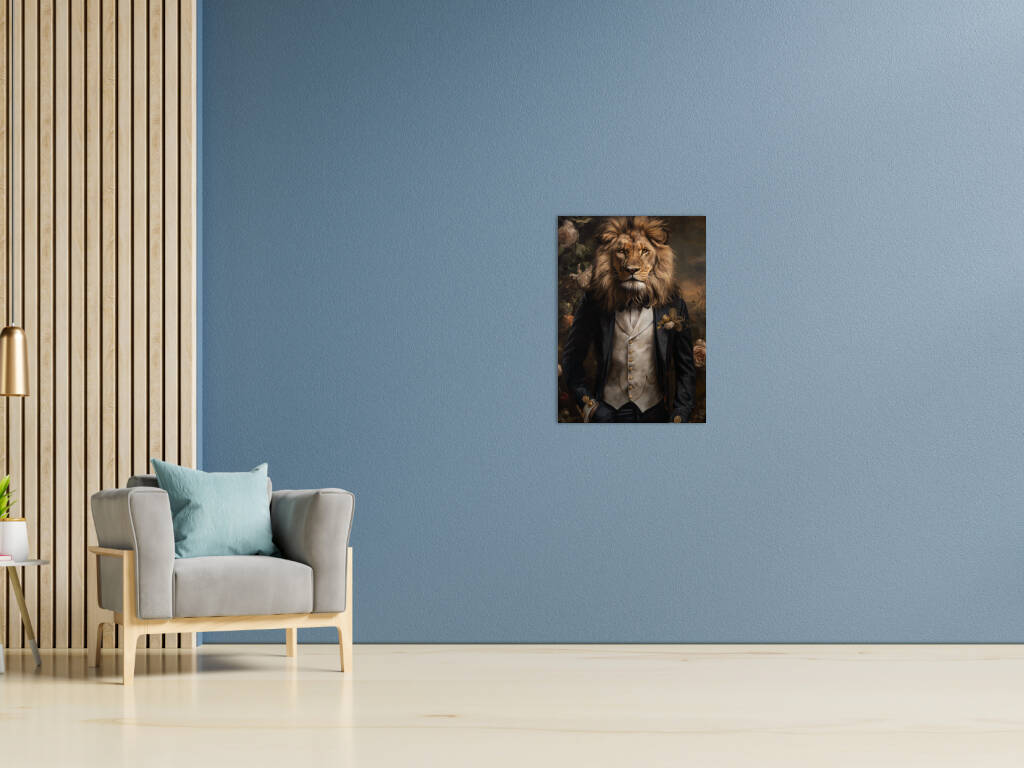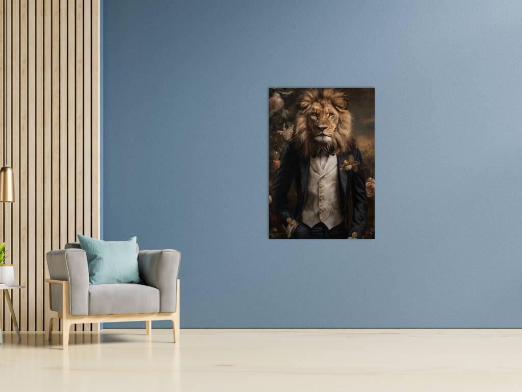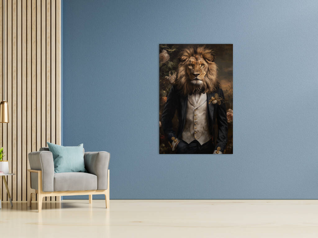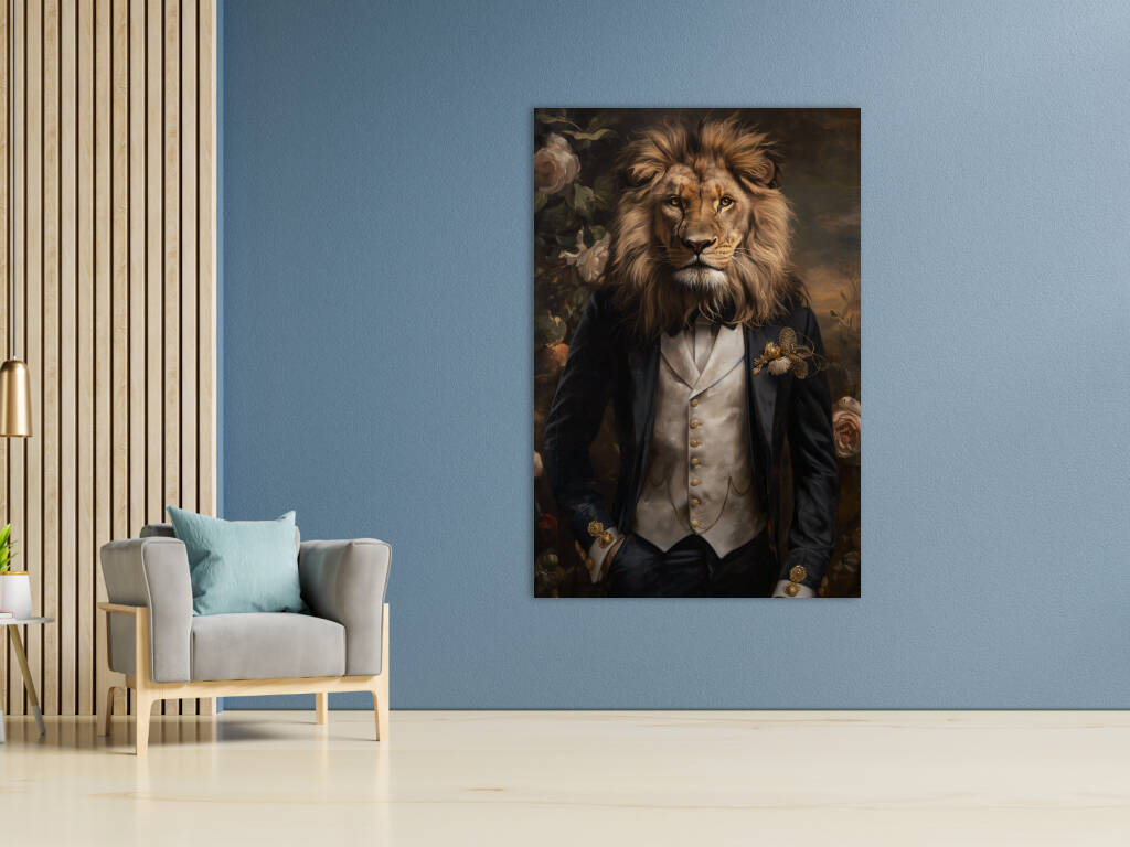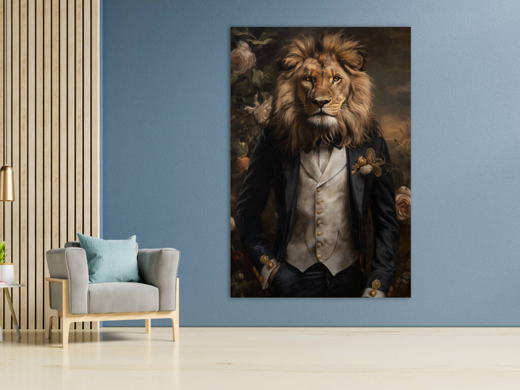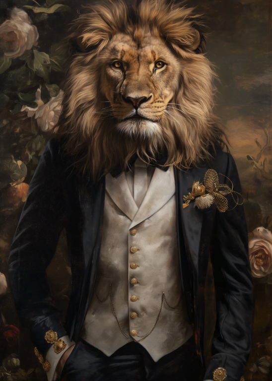 Husband of the Jungle combineert klassieke elegantie met wilde kracht door een statige leeuw in een verfijnd zwart pak met een crèmekleurig gilet en gouden accenten af te beelden. Zijn imposante manen vloeien naadloos over in het aristocratische silhouet, waardoor een intrigerend contrast ontstaat tussen de ruwe majesteit van de jungle en de verfijning van een edelman. De subtiele bloemendecoratie en de warme, klassieke achtergrond geven het geheel een tijdloze en vorstelijke uitstraling, waardoor het beeld zowel mysterieus als indrukwekkend aanvoelt.