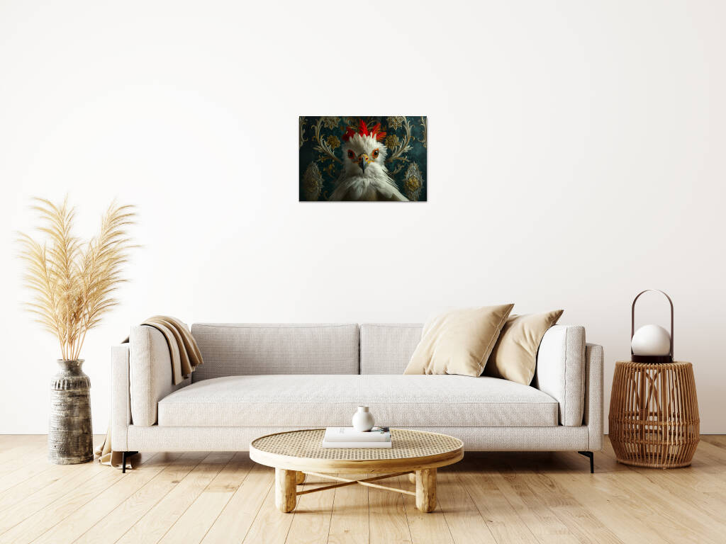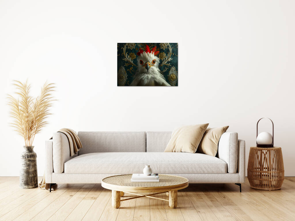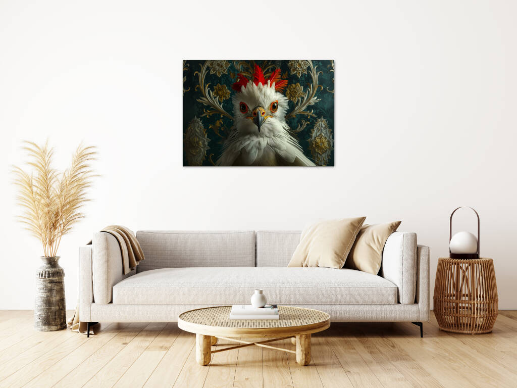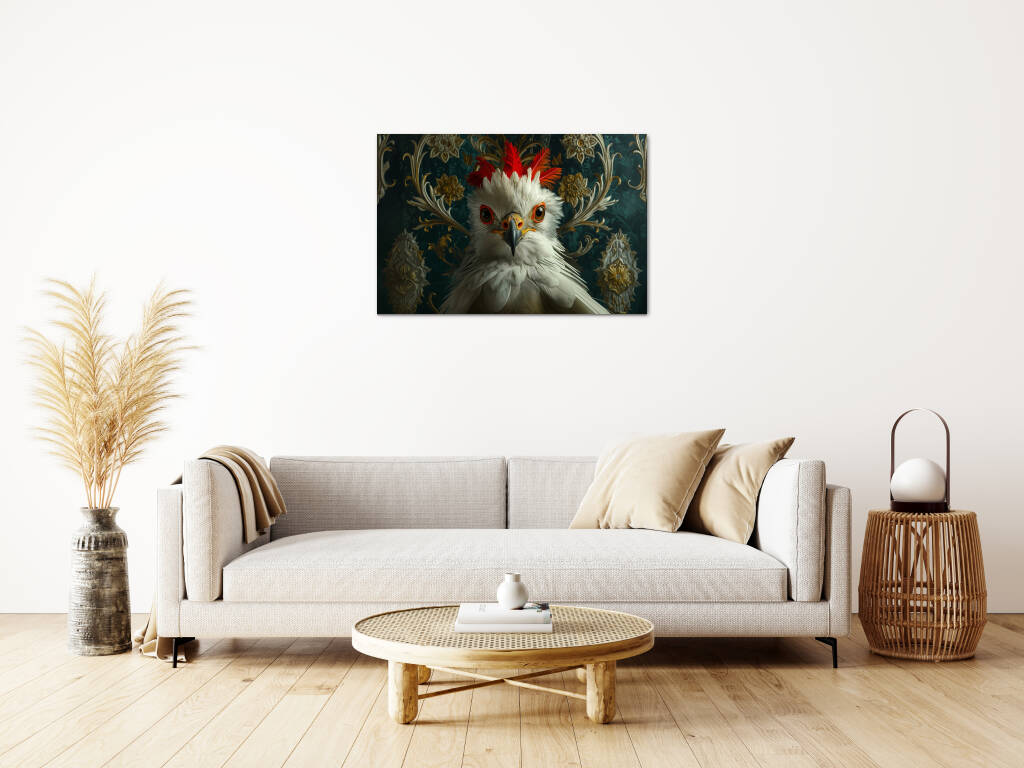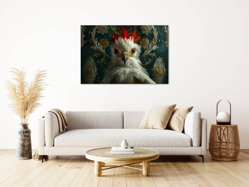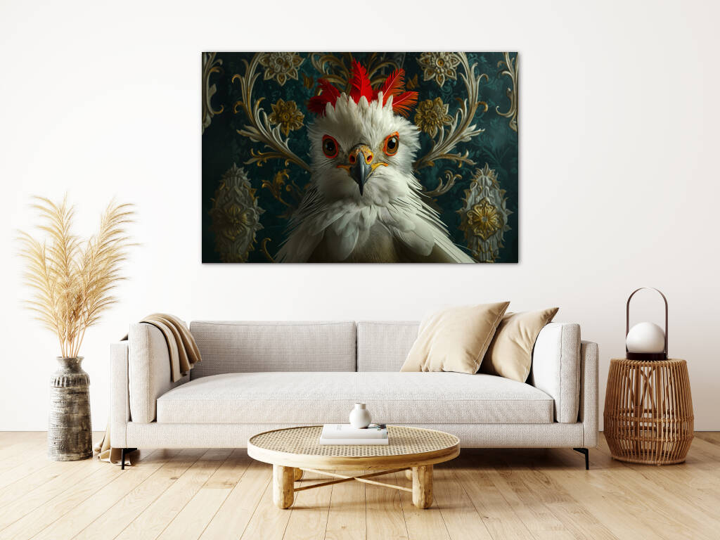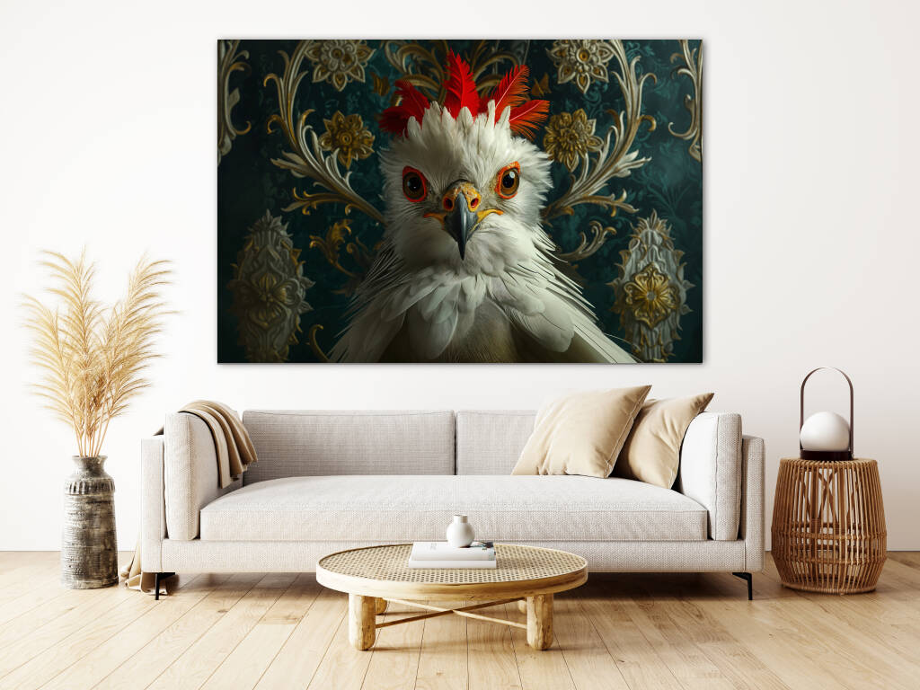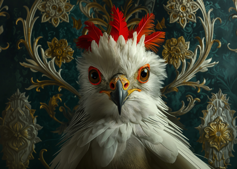 Helpful Secretary is een verrassend statig en charmant portret van een secretarisvogel met een alerte, dienstbare blik. De vogel kijkt je recht aan met grote, oplettende ogen, alsof hij klaarstaat om notities te maken of een taak op zich te nemen. Zijn opvallende rode kuif steekt scherp af tegen zijn witte en grijze verenkleed, terwijl de rijk gedetailleerde achtergrond met barokke patronen in goud en groen een gevoel van elegantie toevoegt. Deze komische en stijlvolle compositie speelt op een speelse manier met het idee van een toegewijde assistent in vogelvorm.
