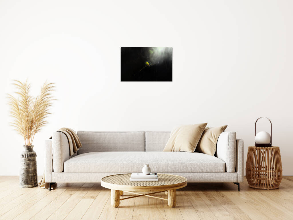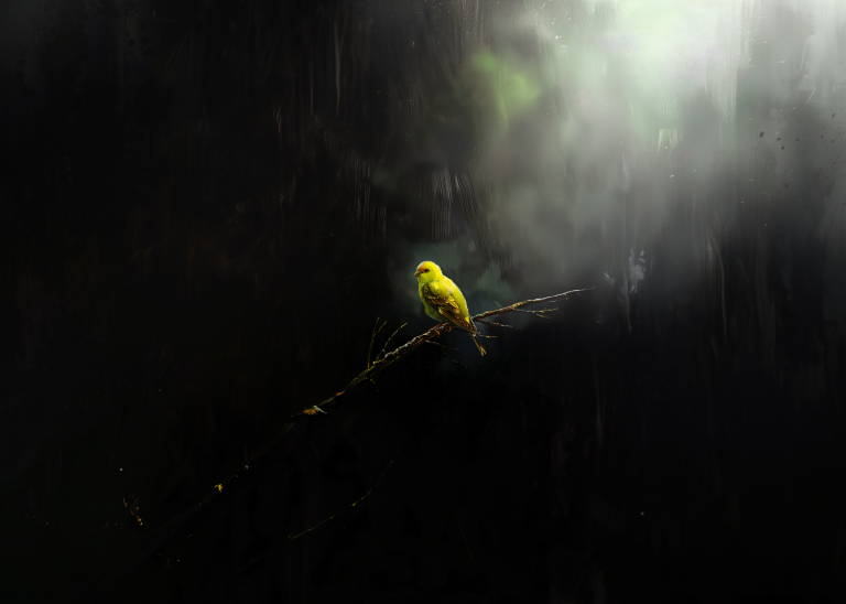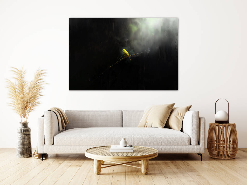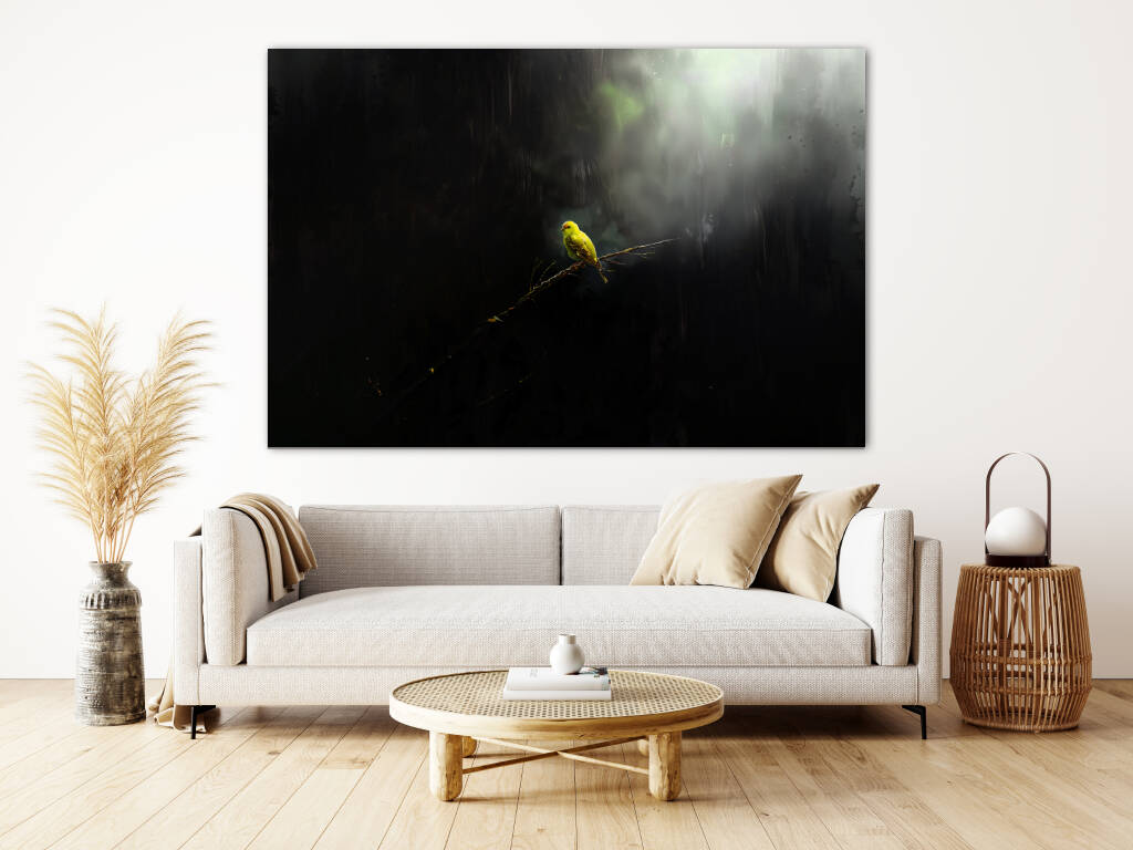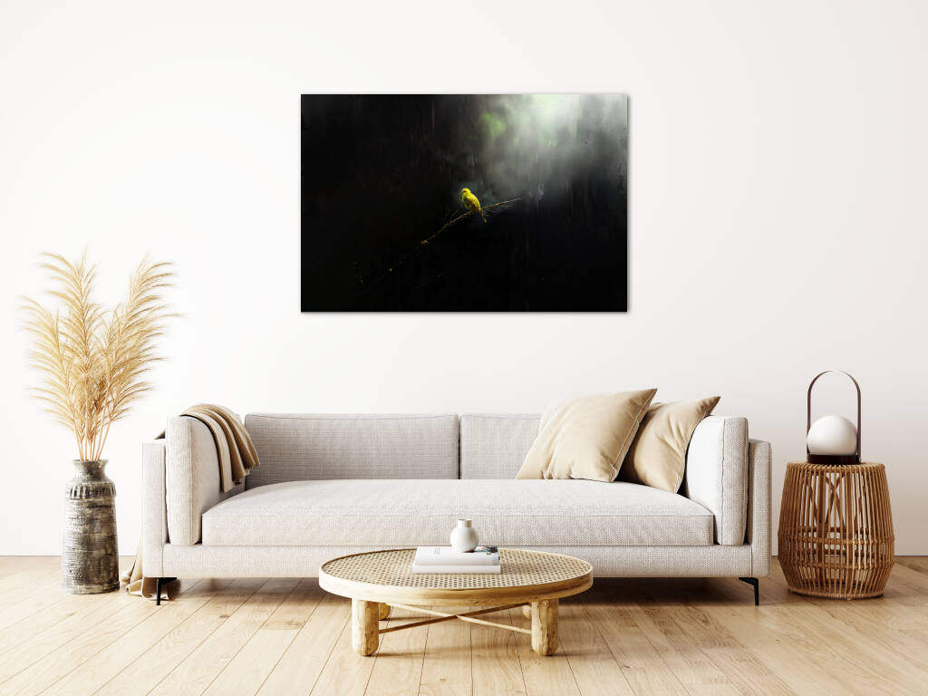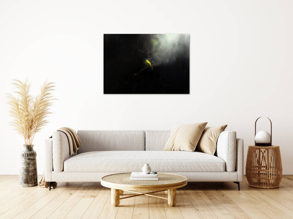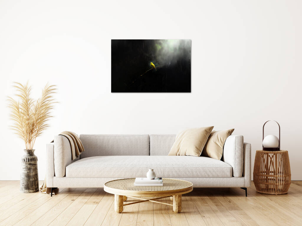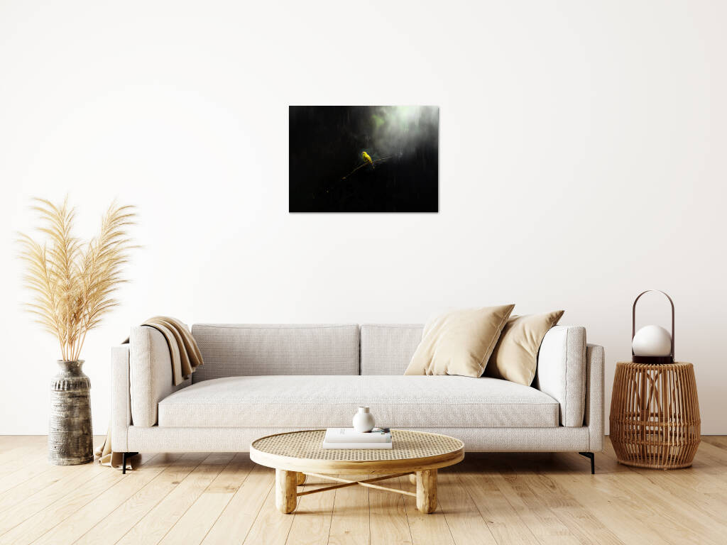Lonely Bird toont een moment van contemplatie waarin een felgele vogel rust op een kale tak, omgeven door mysterieuze schaduwen en zacht gefilterd licht. Het dramatische contrast tussen het heldere vogeltje en de donkere, mistige omgeving creëert een atmosfeer van verstilde schoonheid en melancolie. Dit poëtische beeld spreekt tot de ziel en herinnert ons aan de kracht van eenzaamheid en reflectie. Perfect voor wie houdt van emotionele diepgang en natuurlijke symboliek in hun kunst.