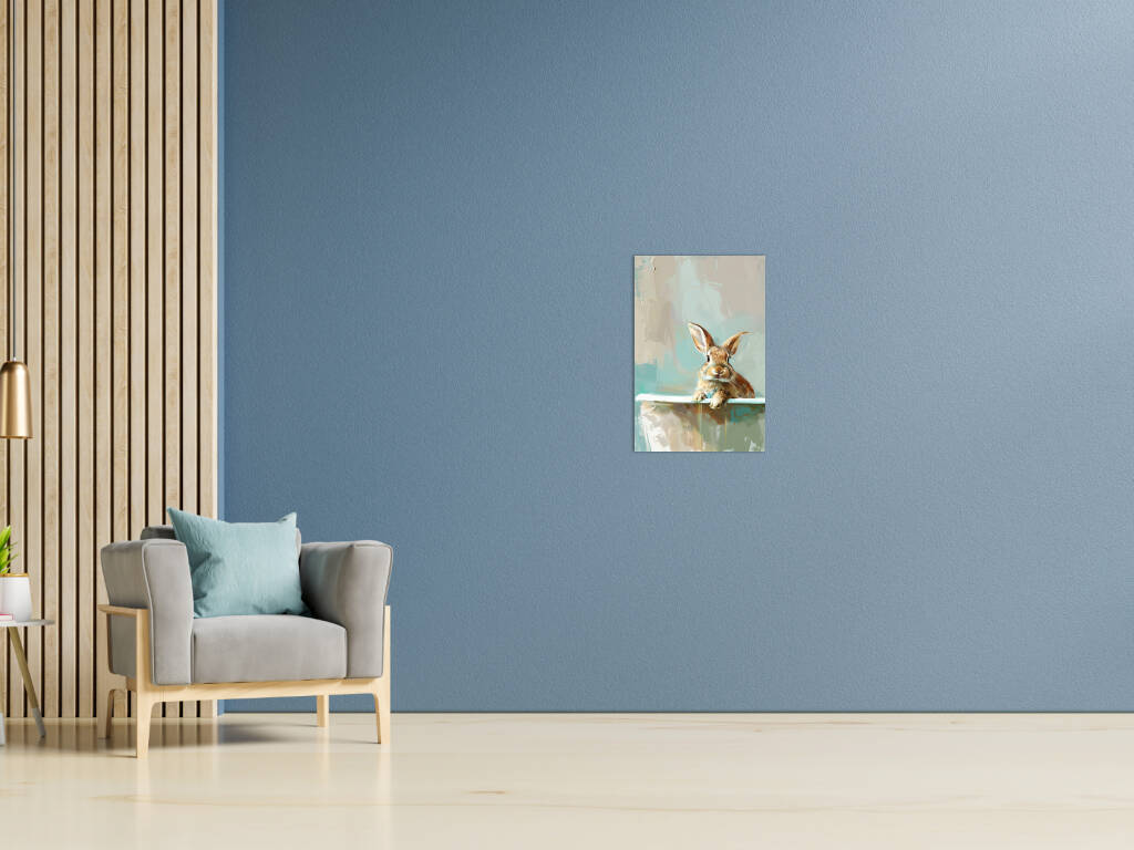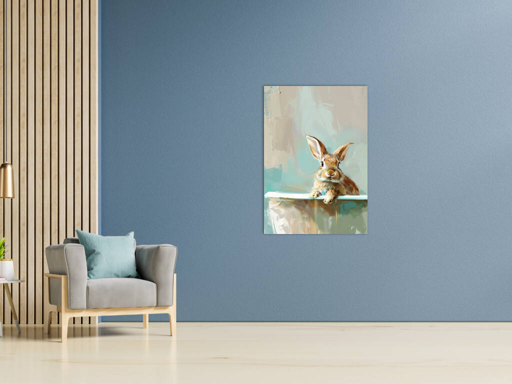 Bath Bunny presenteert een ontwapenend charmante scène waarin een fluffy konijn geniet van een moment van ontspanning. Het lieve dier zit comfortabel in een badkuip, omringd door zachte pastelkleuren die een serene en vredelievende sfeer creëren. De realistische details van de vacht en de speelse uitdrukking van het konijn geven dit kunstwerk een hartverwarmende uitstraling. Perfect voor het toevoegen van een vleugje speelsheid en warmte aan elke ruimte.