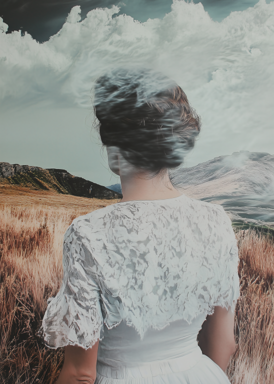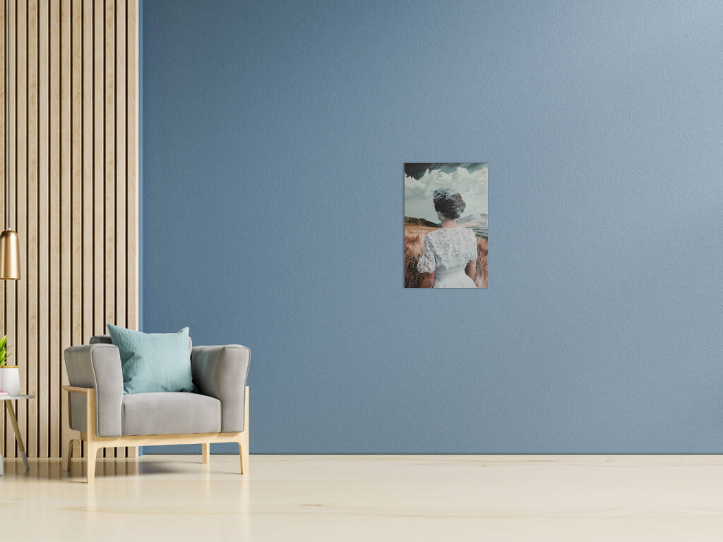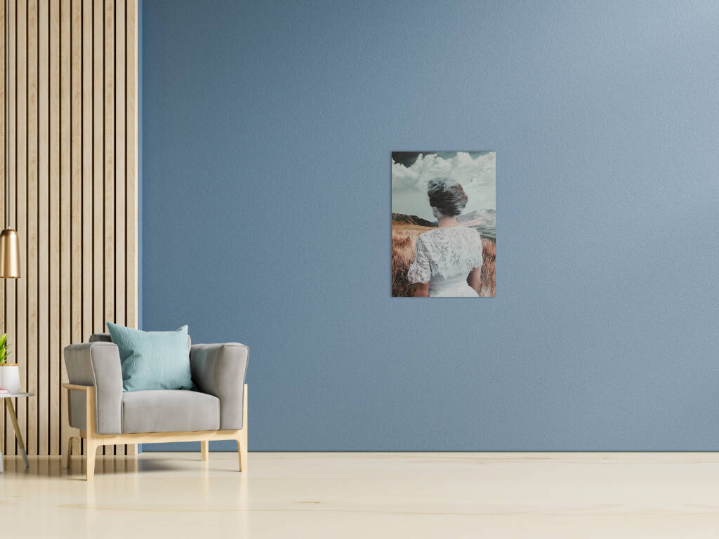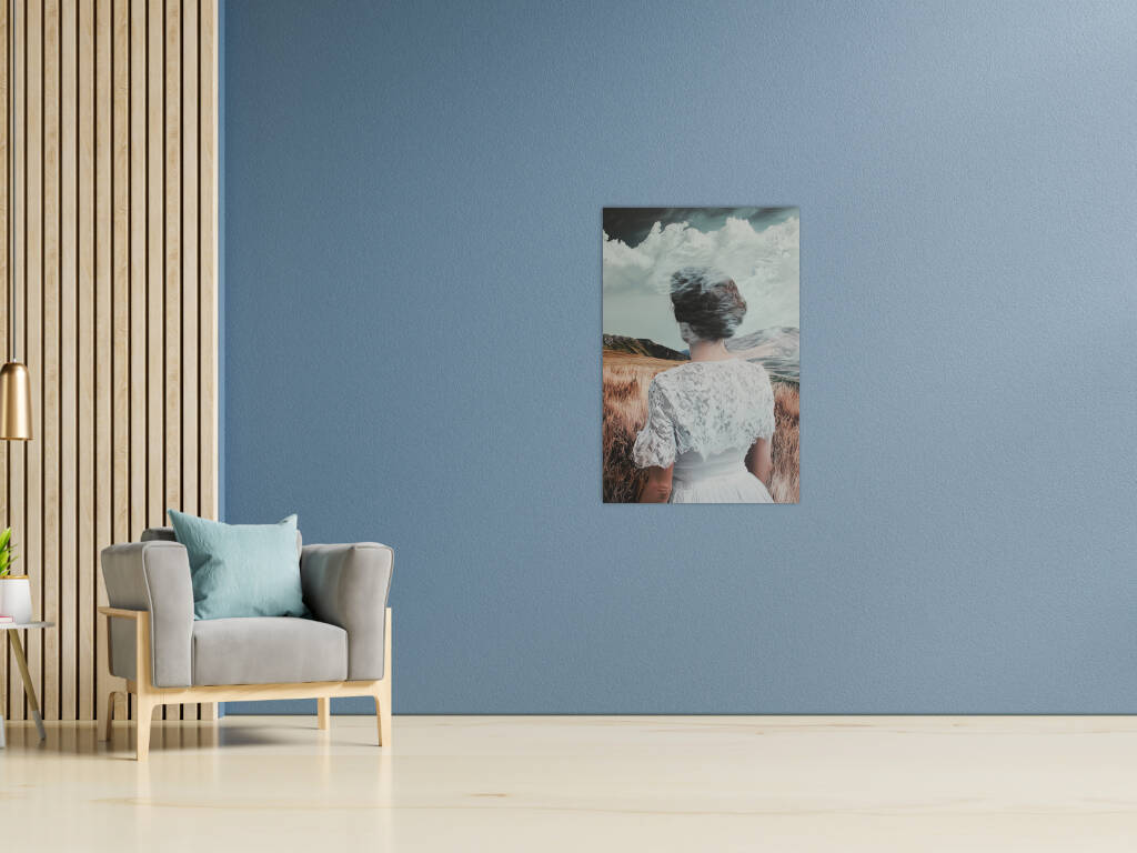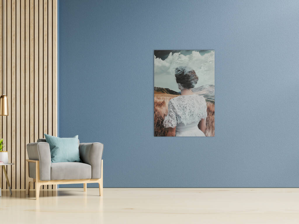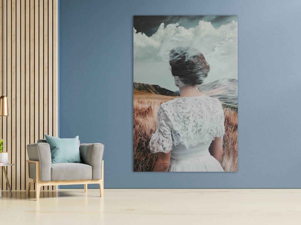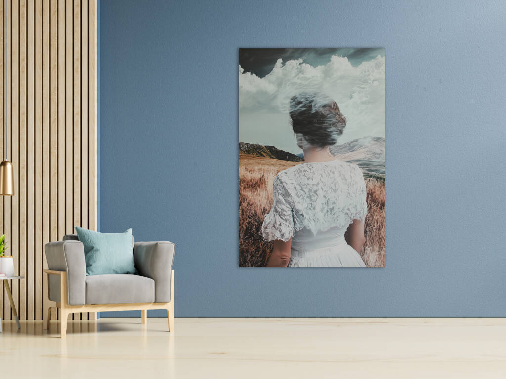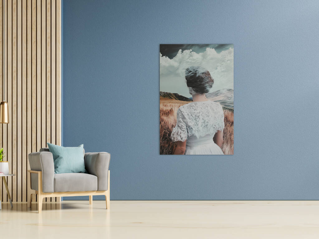 Head in Clouds toont een poëtische compositie waarin een vrouw in witte kledij zich omkeen kijkt naar een dramatisch wolkenlandschap dat letterlijk samenvloeit met haar gedachten. De surrealistische techniek creëert een dromerige verbinding tussen de fysieke en mentale wereld, waarbij de grens tussen realiteit en verbeelding vervaagt. De zachte kleuren en de romantische sfeer geven het kunstwerk een contemplatieve uitstraling die uitnodigt tot reflectie. Dit inspirerende meesterwerk symboliseert de kracht van dromen en de vrijheid van gedachten.