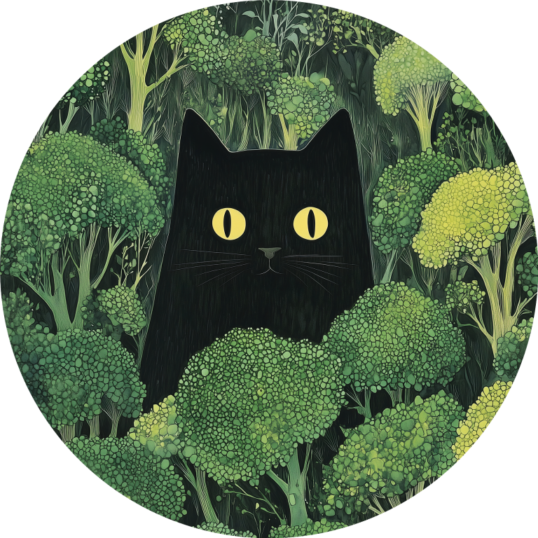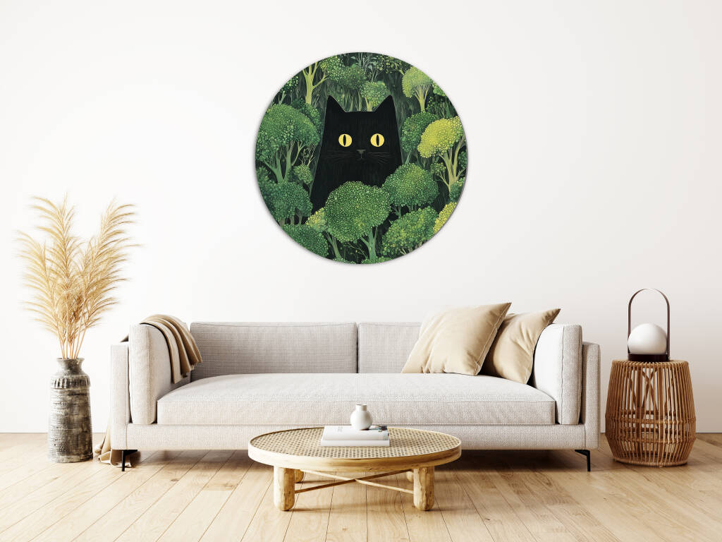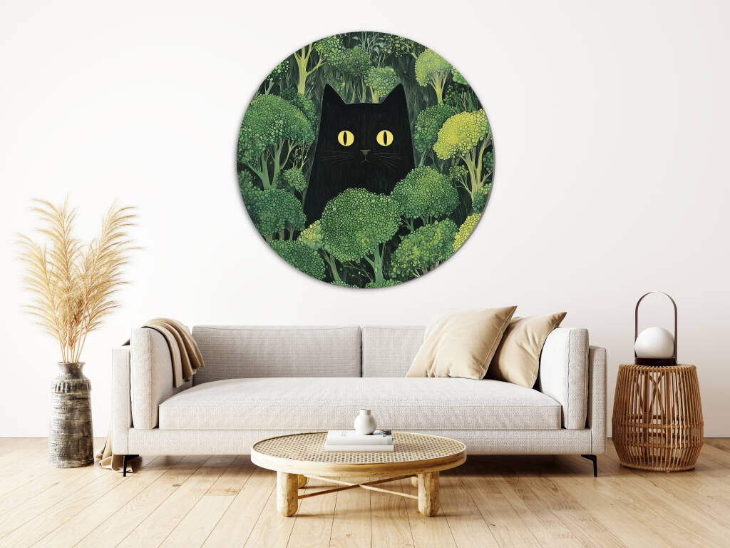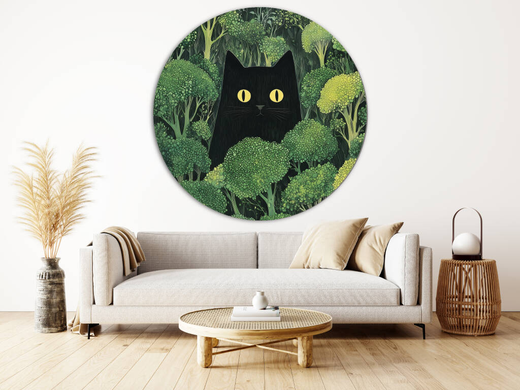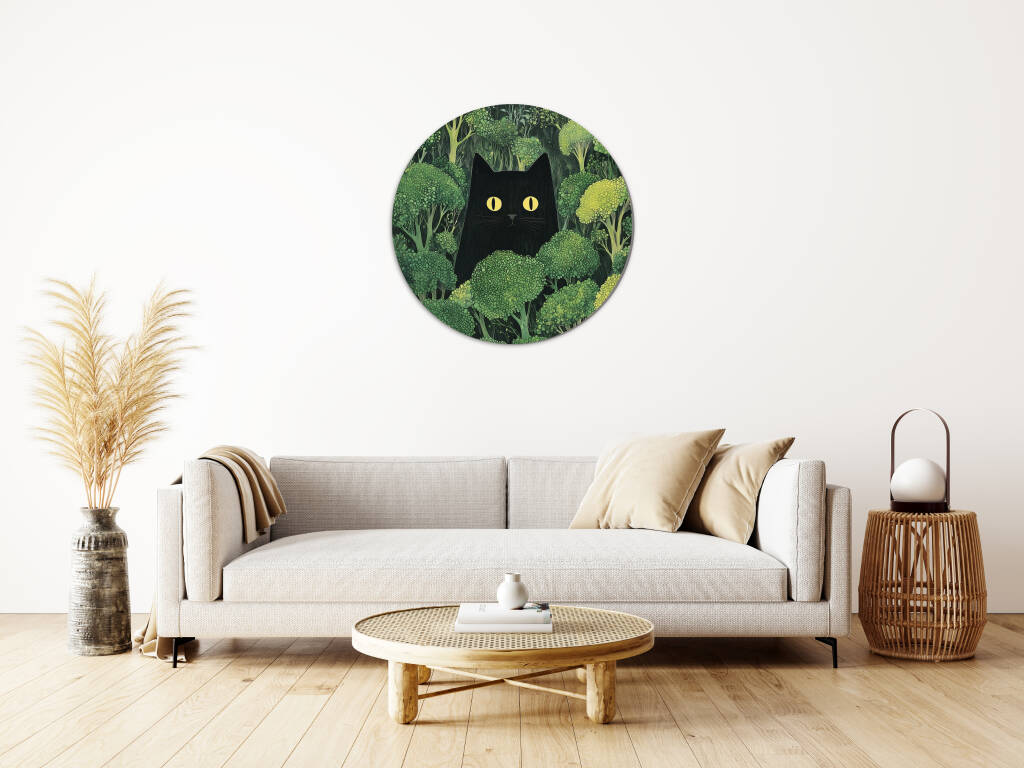 Een mysterieus tafereel waarin een zwarte kat met felle, doordringende gele ogen subtiel verscholen zit tussen een weelderig bos van broccolistruiken. De contrasterende kleuren – het diepe zwart van de kat en het levendige groen van de broccoli – trekken direct de aandacht en geven het werk een speelse, surrealistische sfeer. De kat lijkt zowel nieuwsgierig als ongrijpbaar, wat een gevoel van humor en intrige toevoegt. Het geheel straalt een delicate balans tussen natuur en fantasie uit.