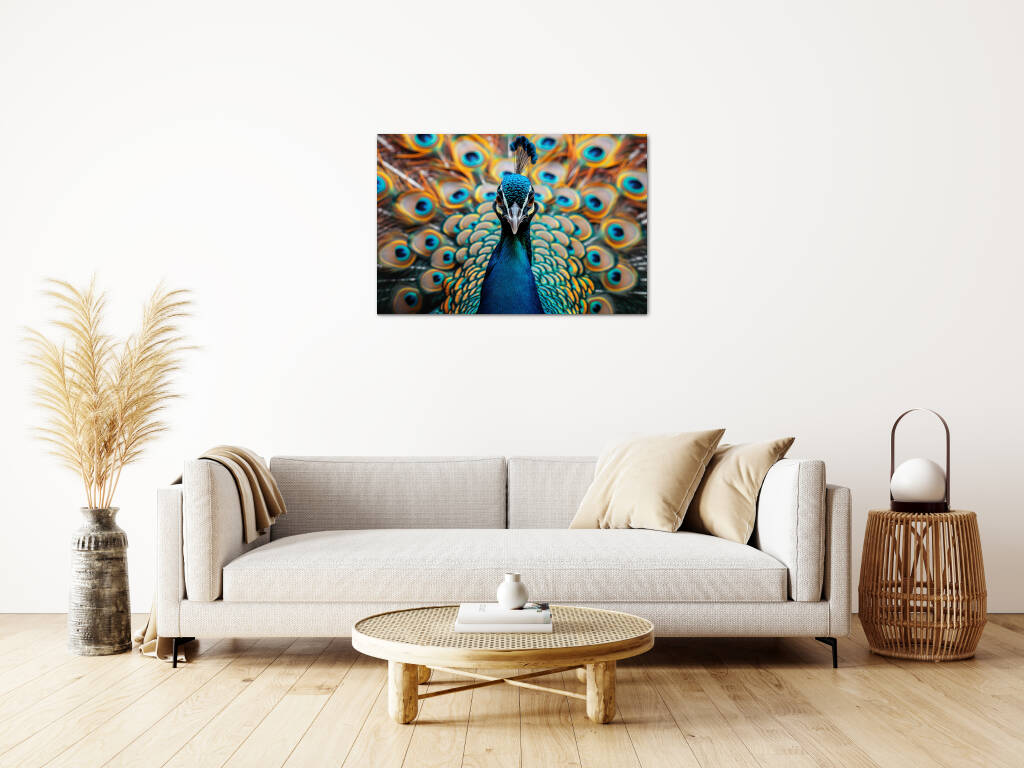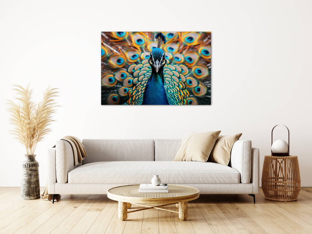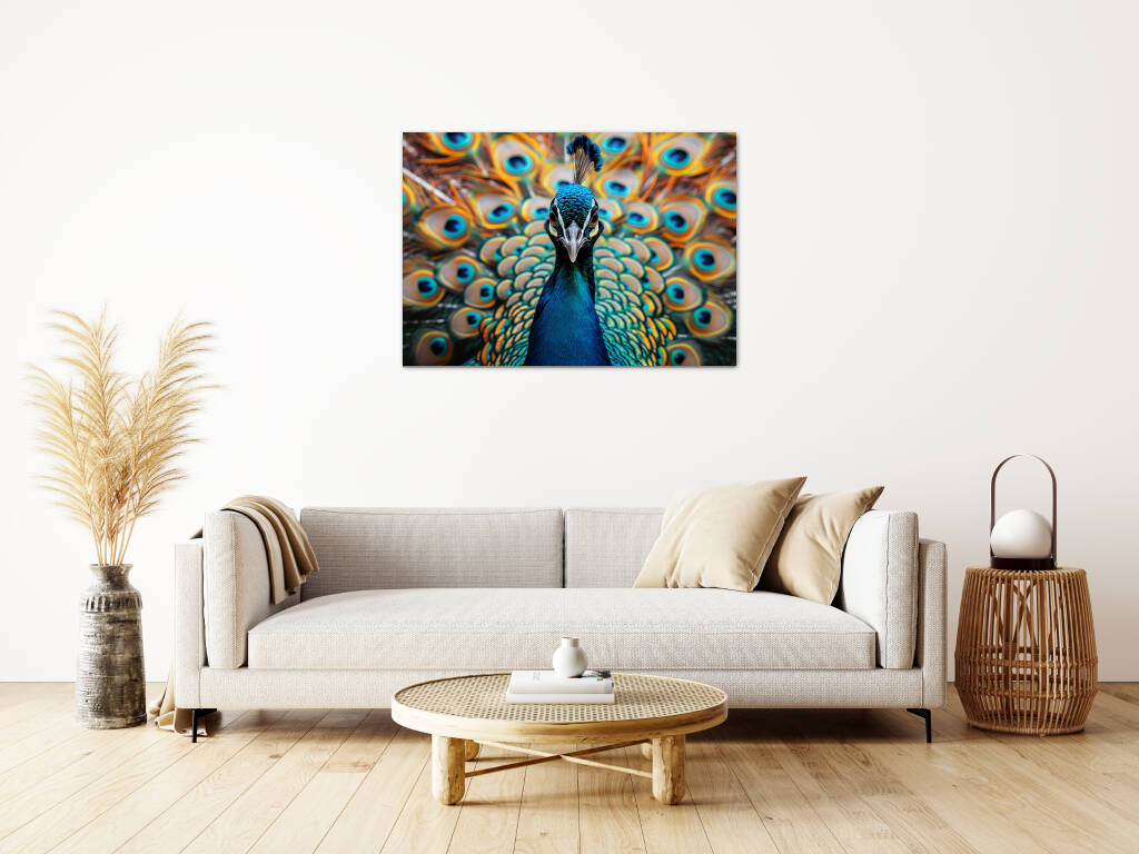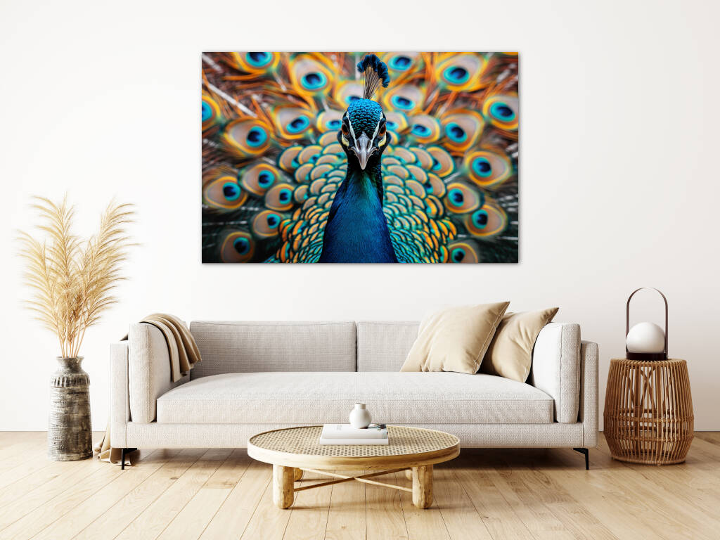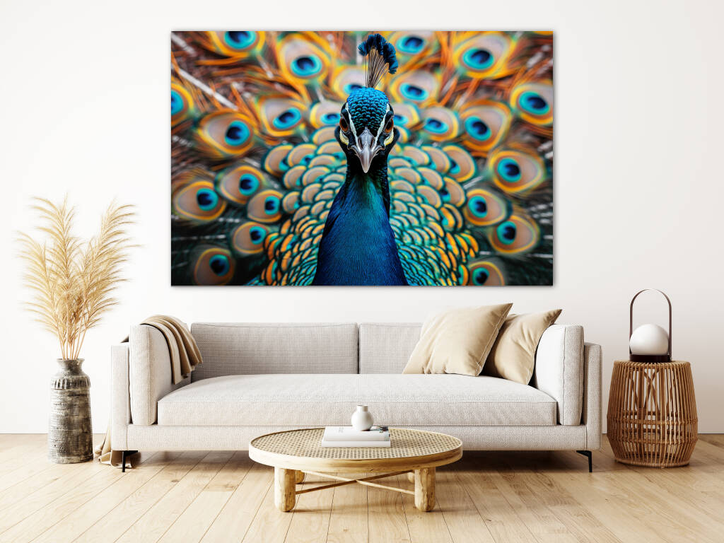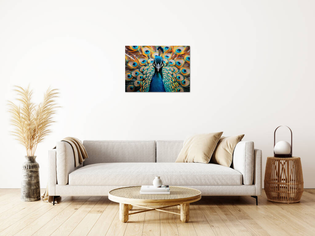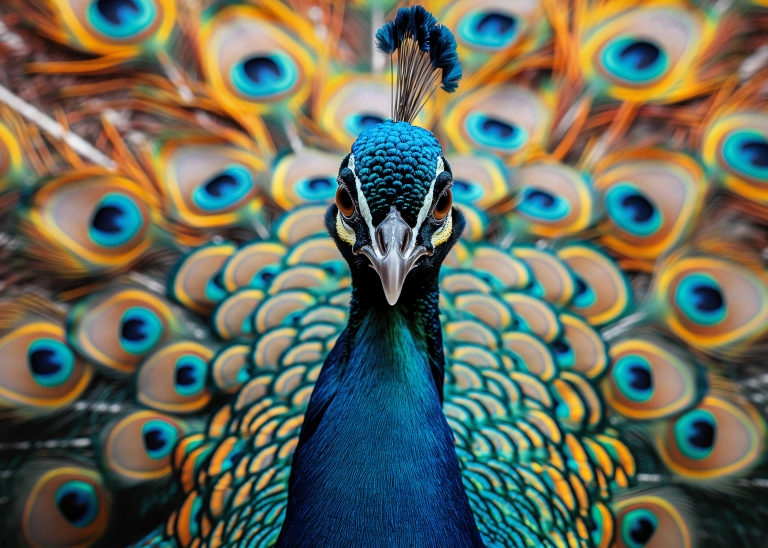 Look at Me presenteert een trotse pauw die zijn spectaculaire verenpracht tentoonspreidt in een explosie van turquoise en gouden tinten. De hypnotiserende ogen op de veren staren je aan terwijl de vogel zelfverzekerd poseert met zijn kroon van blauwe veren. Dit majestueuze portret vangt de natuurlijke ijdelheid en schoonheid van deze koninklijke vogel in al zijn glorie. Perfect voor wie houdt van opvallende natuurfotografie en de symboliek van trots en schoonheid waardeert.