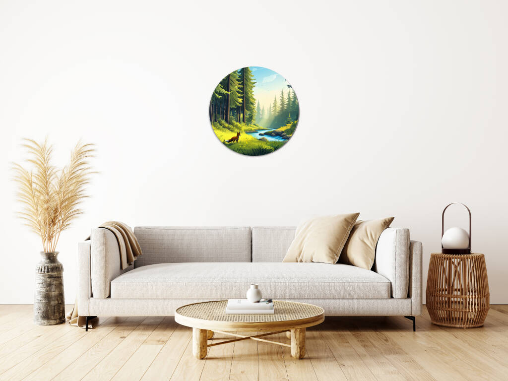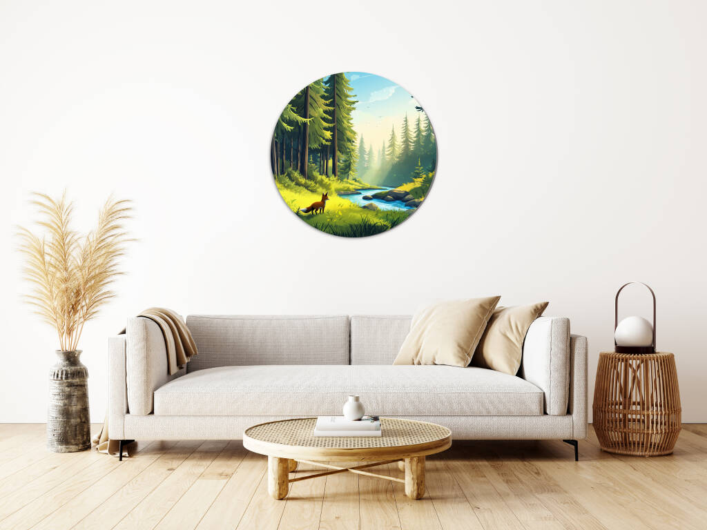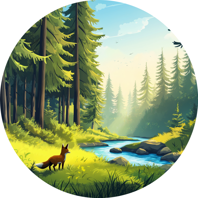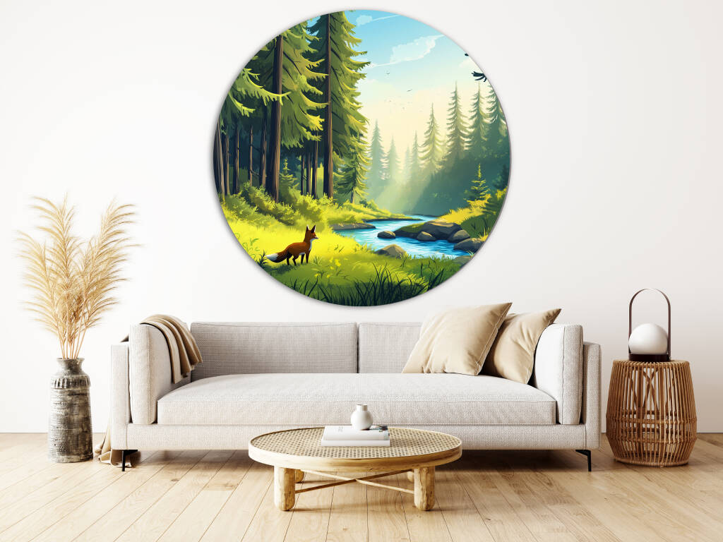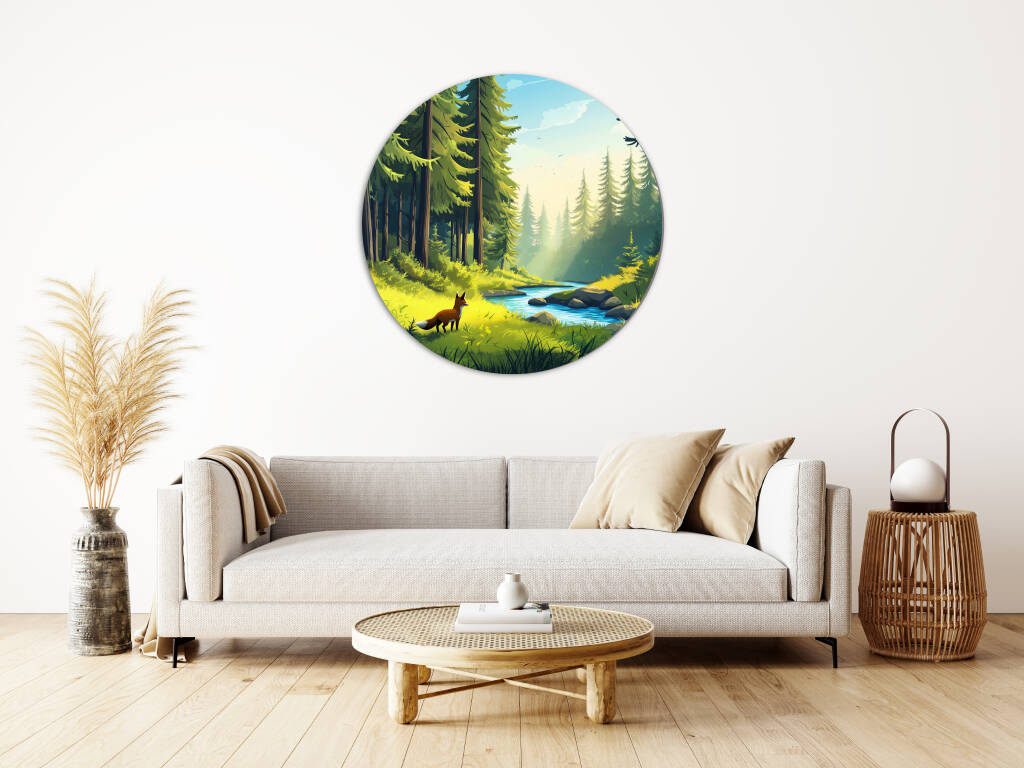 Fox Paradise toont een idyllisch boslandschap waar een nieuwsgierige vos langs een kabbelend beekje wandelt in het zachte ochtendlicht. De warme groentinten en het vredige tafereel stralen pure natuurlijke harmonie uit, terwijl zonnestralen door de dennenbomen filteren. Dit sprookjesachtige kunstwerk vangt de ongerepte schoonheid van het woud en zijn bewoners. Perfect voor natuurliefhebbers en kinderen die dromen van bosavonturen en vriendelijke dieren.