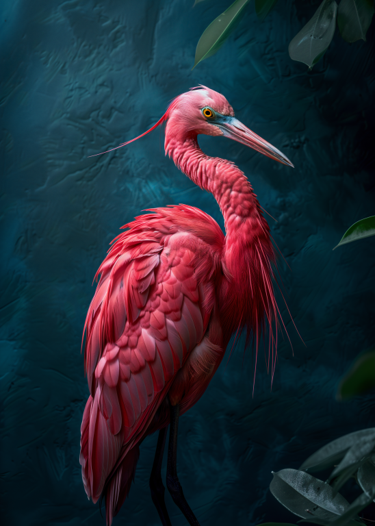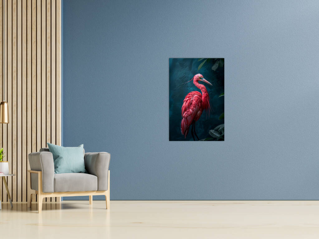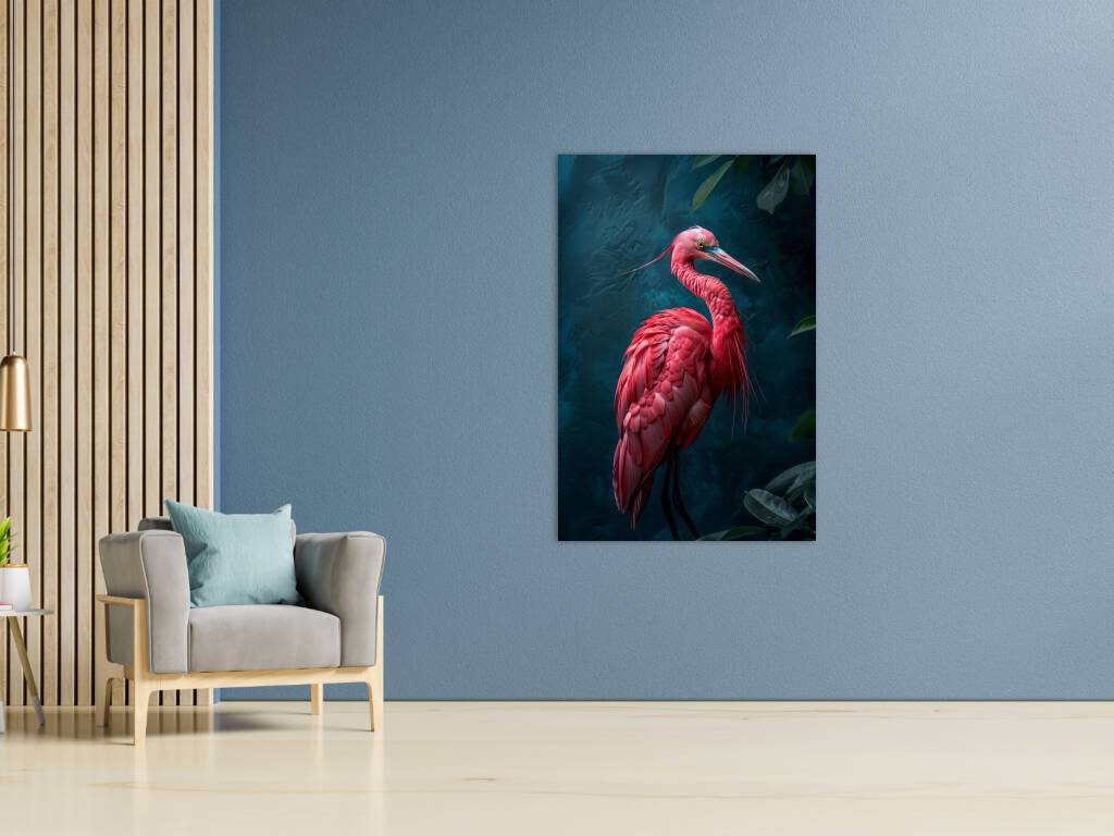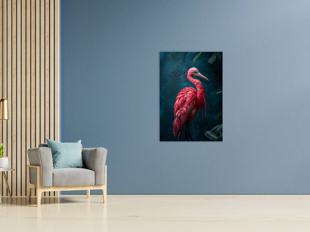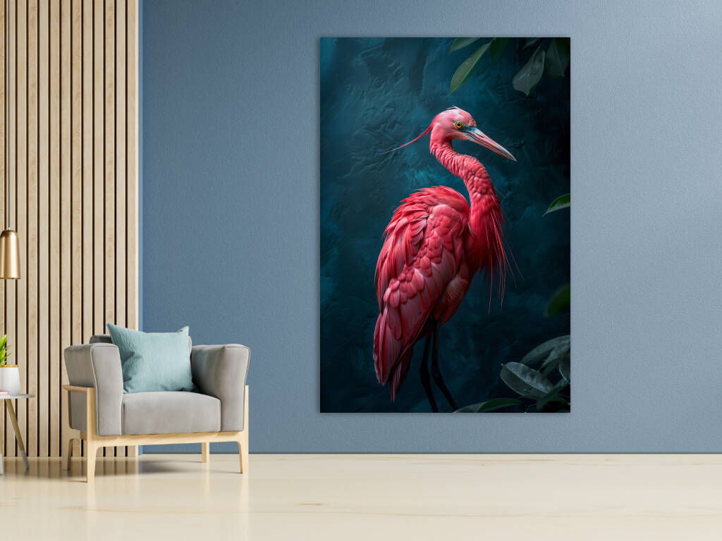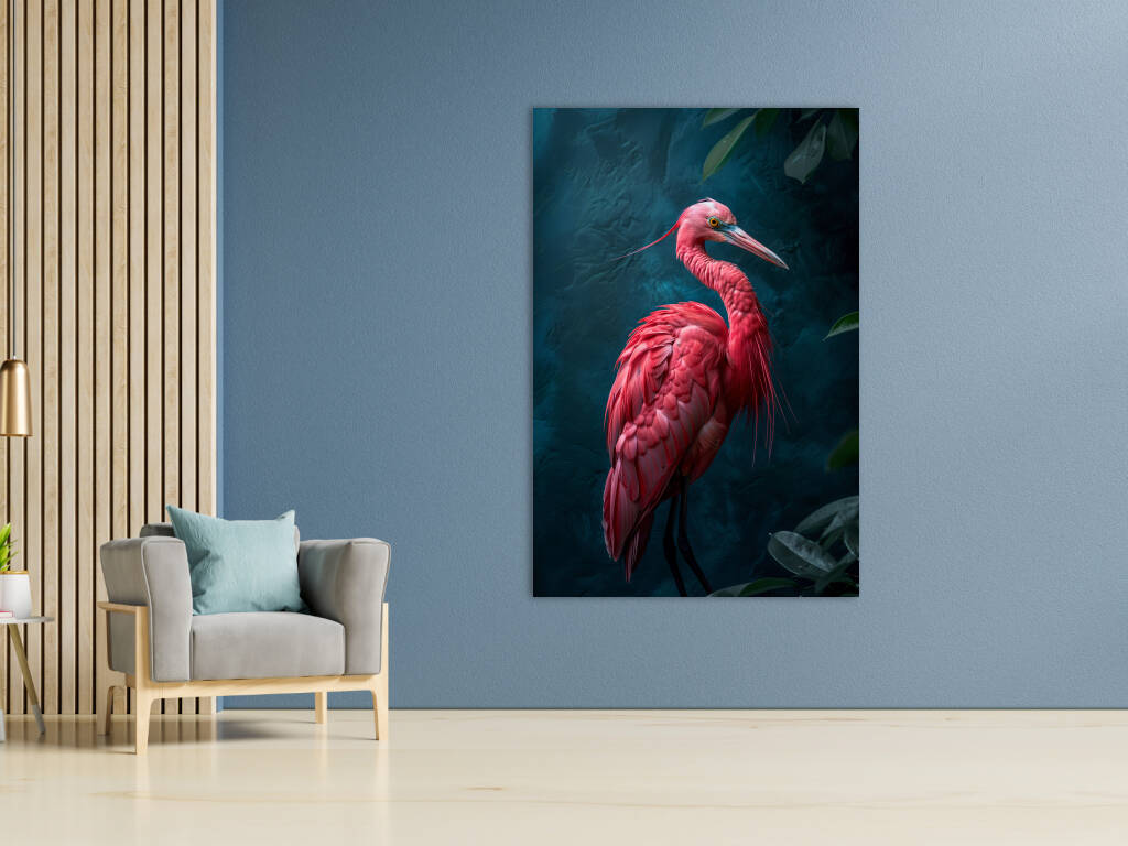 Pink Heron toont een majestueuze roze reiger in zijn volle glorie, omgeven door tropische bladeren in diepe groentinten. De intense koraalroze verentooi contrasteert prachtig met de mysterieuze donkere omgeving, waardoor elke verendetail en de elegante houding van deze prachtige vogel worden benadrukt. De hyperrealistische stijl en rijke kleuren maken dit tot een opvallend kunstwerk dat zowel natuurliefhebbers als liefhebbers van gedurfde interieurdecoratie zal bekoren.