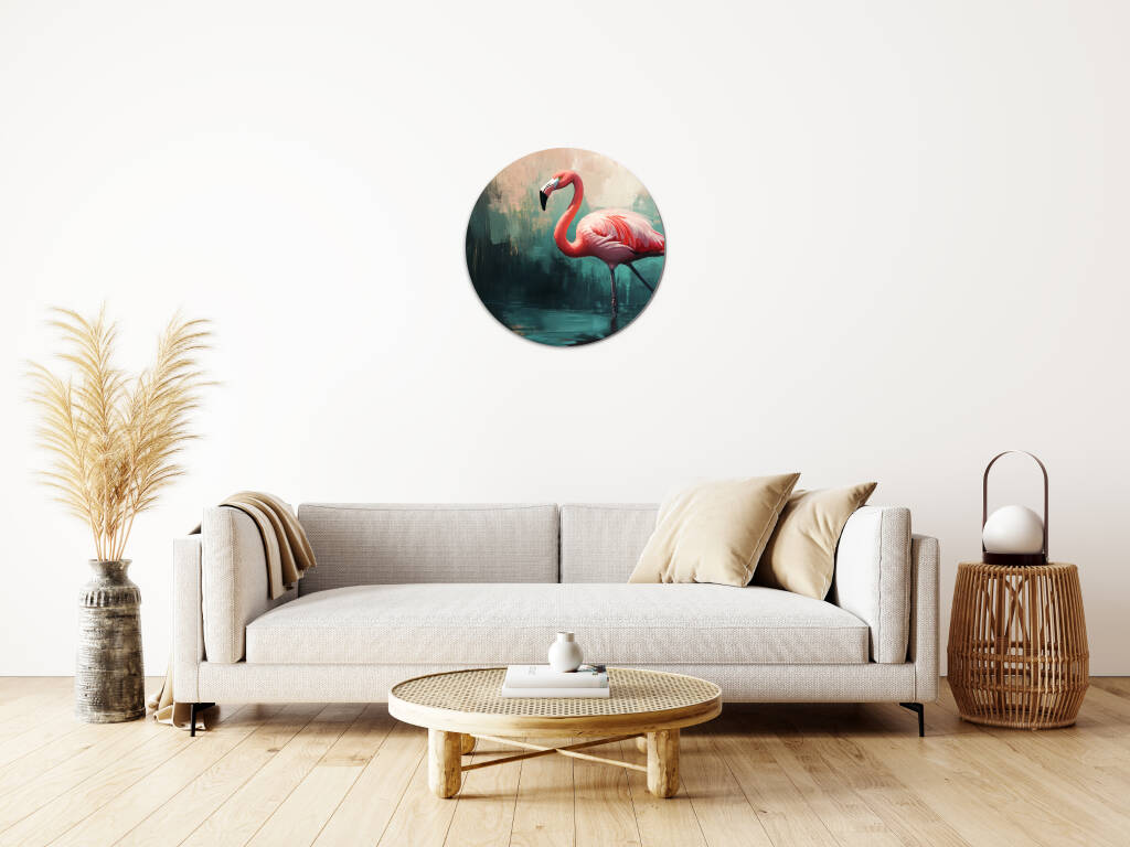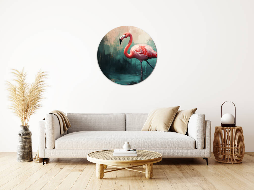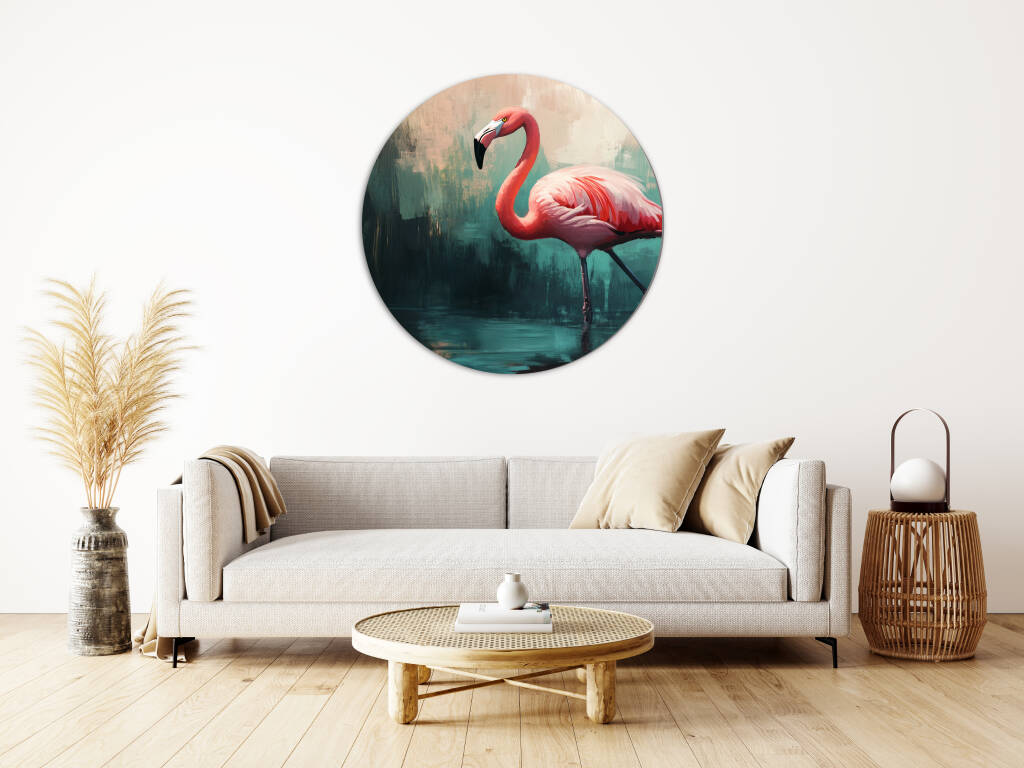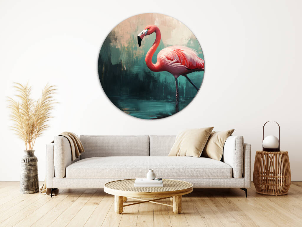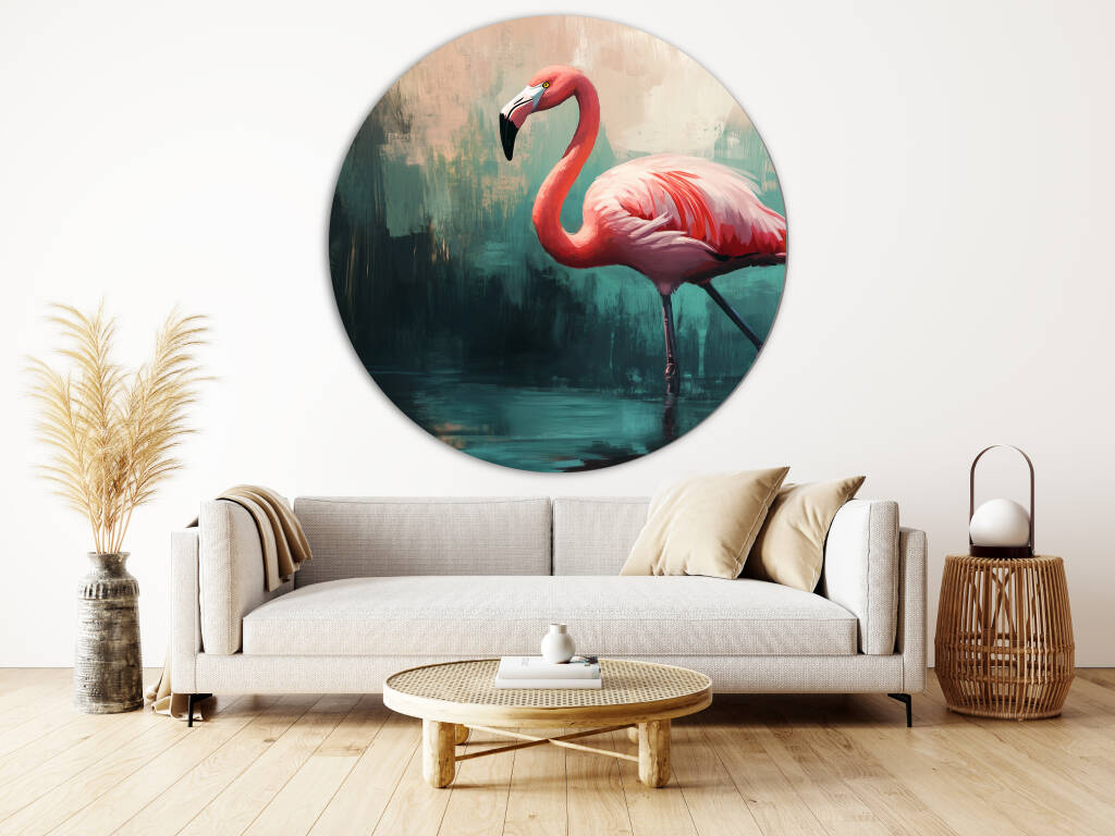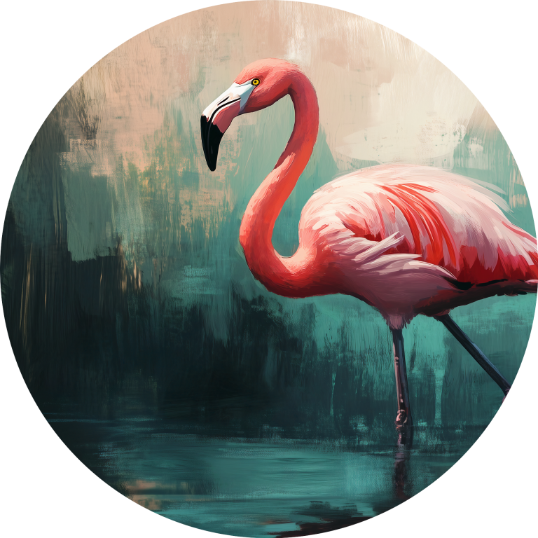 Walking Flamingo toont een elegante roze flamingo die graceus door ondiep water waadt tegen een artistieke achtergrond van verweerde turquoise en beige tinten. De expressieve penseelstreken en de abstracte kleurvlakken geven het realistische vogel portret een moderne, eigentijdse uitstraling. De zachte reflectie van de flamingo in het water en de gestructureerde achtergrond creëren een perfect evenwicht tussen natuurlijke schoonheid en artistieke interpretatie. Dit verfijnde kunstwerk brengt de elegantie van deze iconische vogel tot leven in een contemporary stijl.