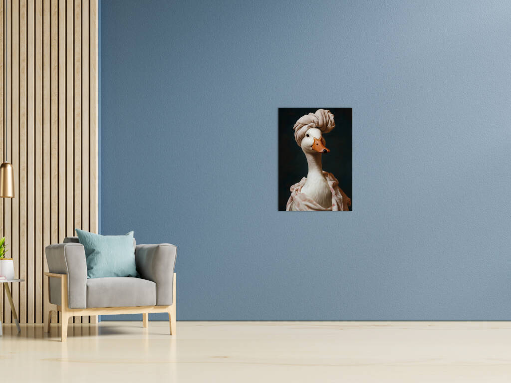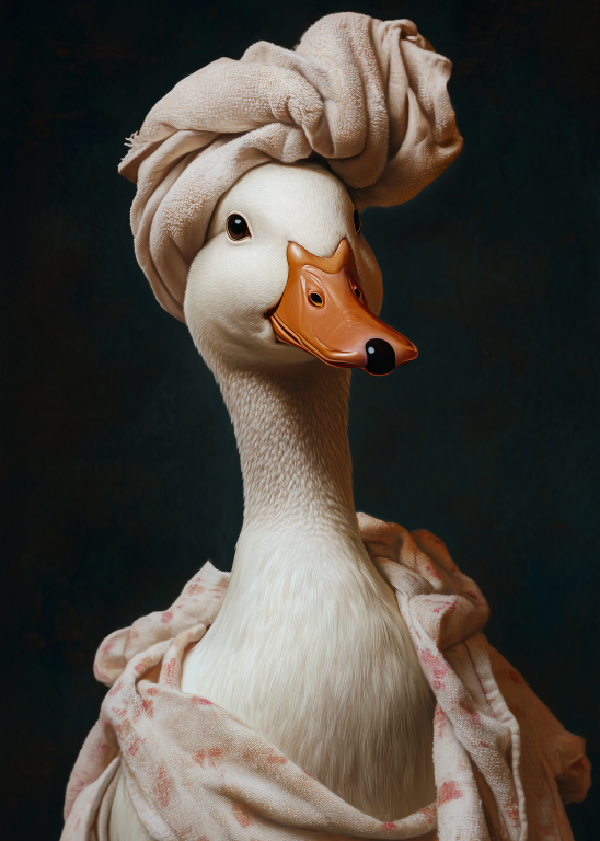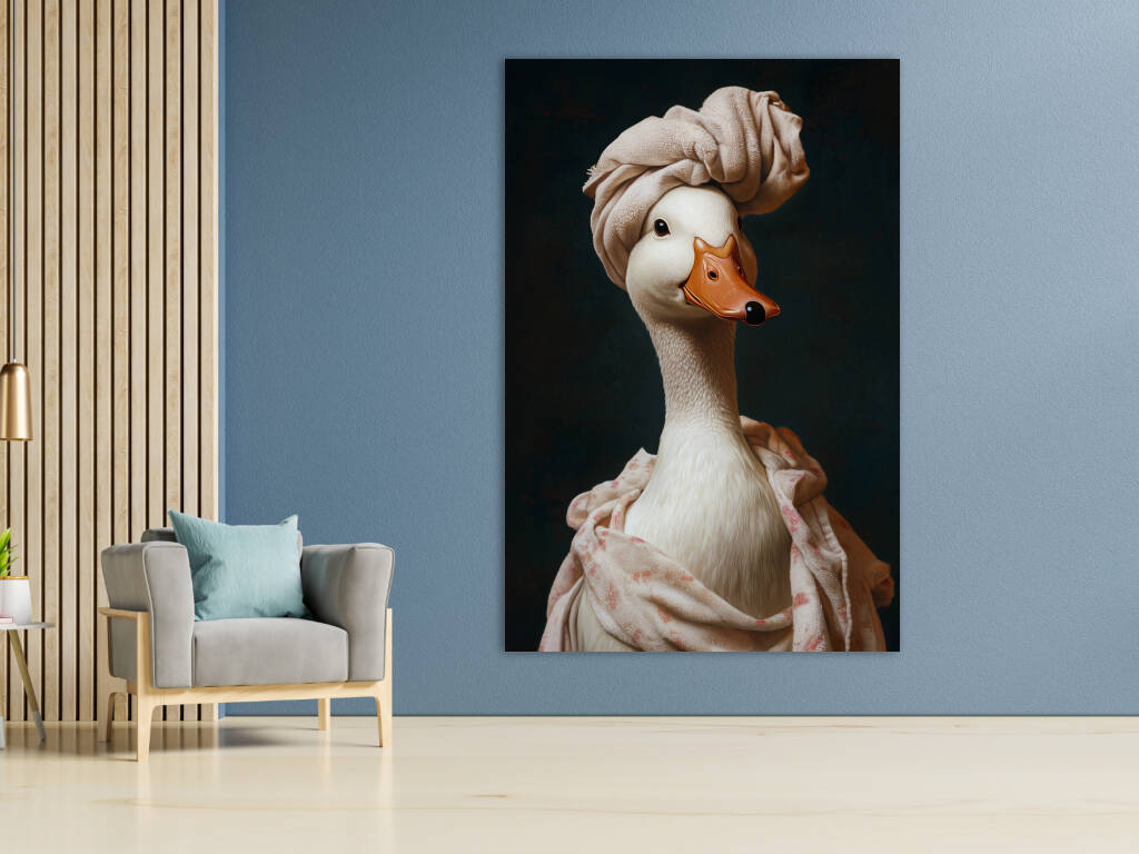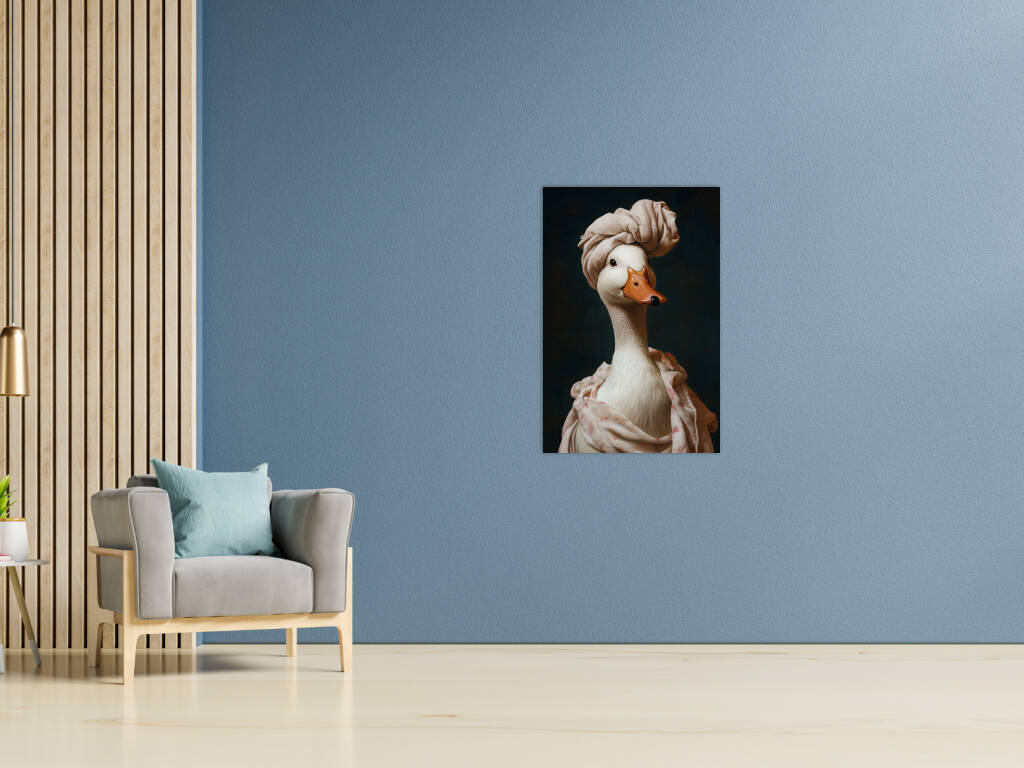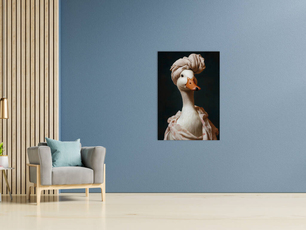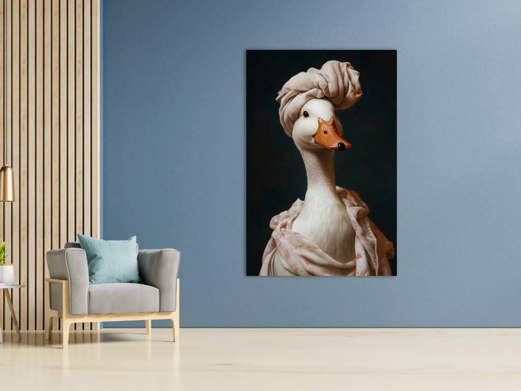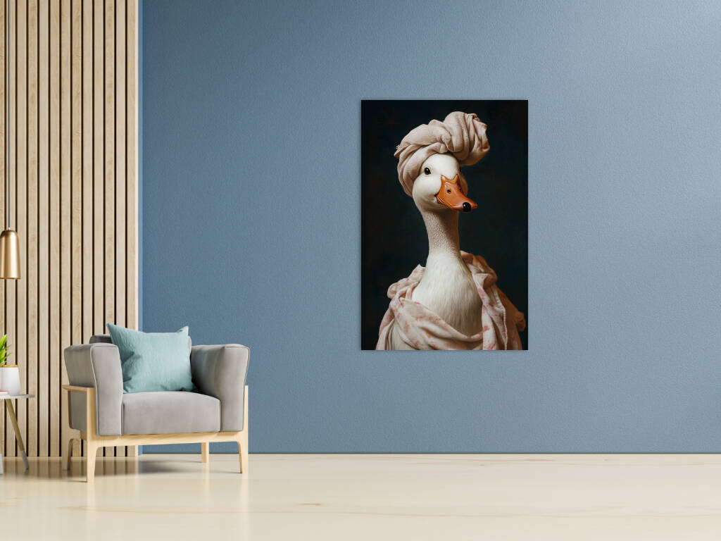 Vanity Duck presenteert een humoristische interpretatie waarin een elegante eend poseert als een klassiek portret, compleet met een luxueuze beige hoofddoek die in dramatische plooien valt. De serene uitdrukking en de verfijnde houding van de eend contrasteren amusant met haar natuurlijke eenden-eigenschappen, wat een speelse kijk geeft op klassieke portraitschilderkunst. De rijke texturen van de stof en de subtiele belichting tonen respect voor traditionele schildertechnieken. Dit charmante kunstwerk combineert humor met klassieke elegantie en brengt een glimlach in elke ruimte.