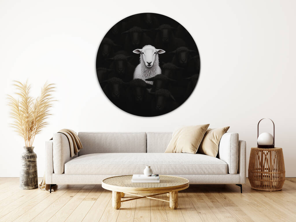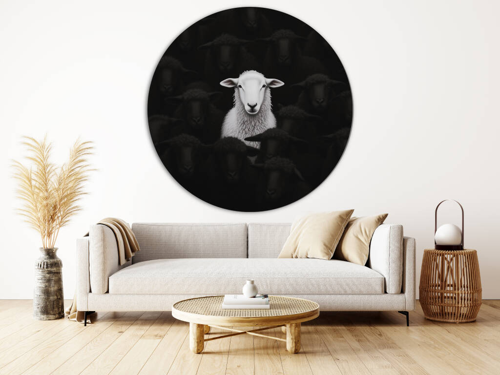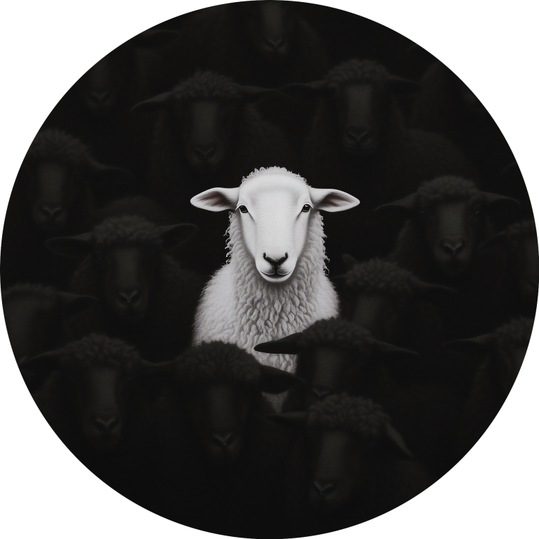 The White Sheep presenteert een betoverend moment waarin een prachtig wit schaap sereen poseert tegen een dramatische donkere achtergrond van zwarte schapen. De minimalistischer zwart-wit compositie benadrukt de natuurlijke schoonheid en individualiteit van dit bijzondere dier. Dit krachtige contrast vertelt een verhaal over eigenheid en moed om anders te zijn. Perfect voor wie houdt van betekenisvolle kunst met een vleugje humor en een boodschap van zelfvertrouwen.