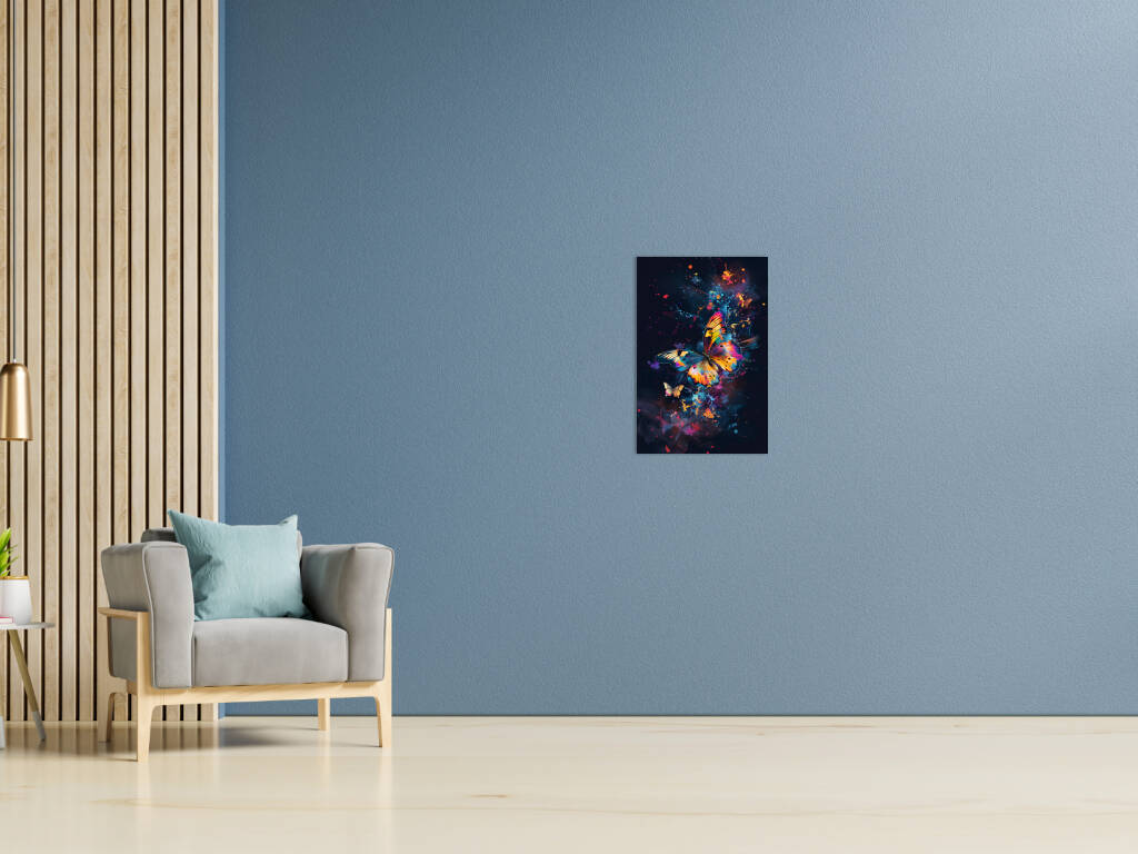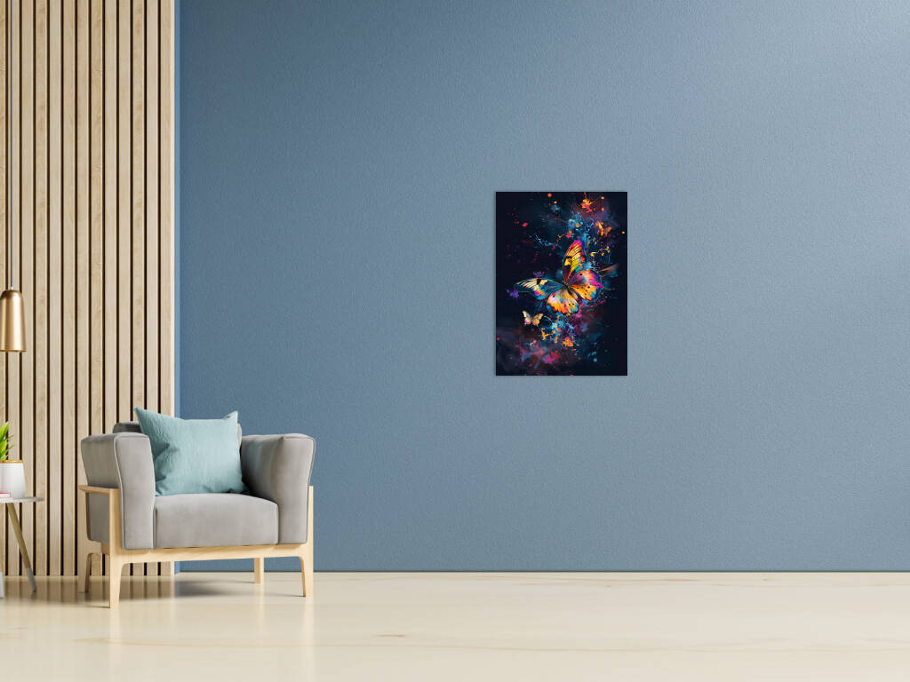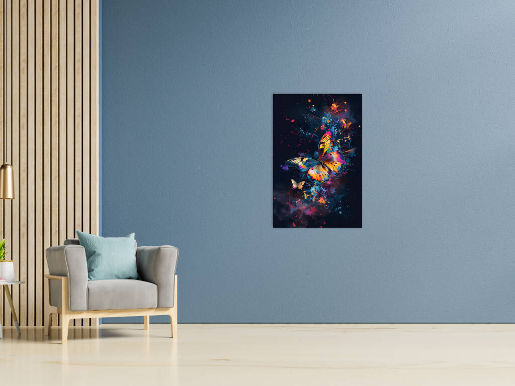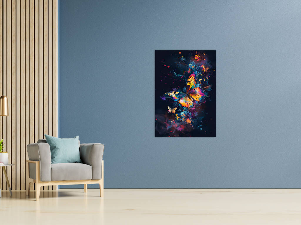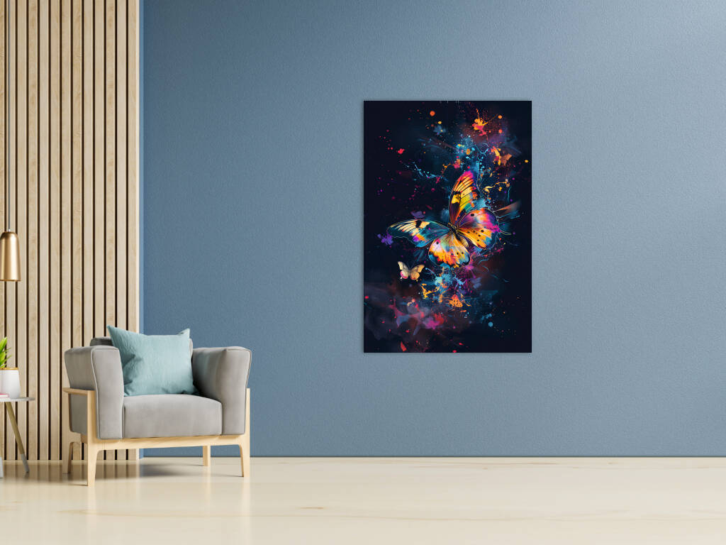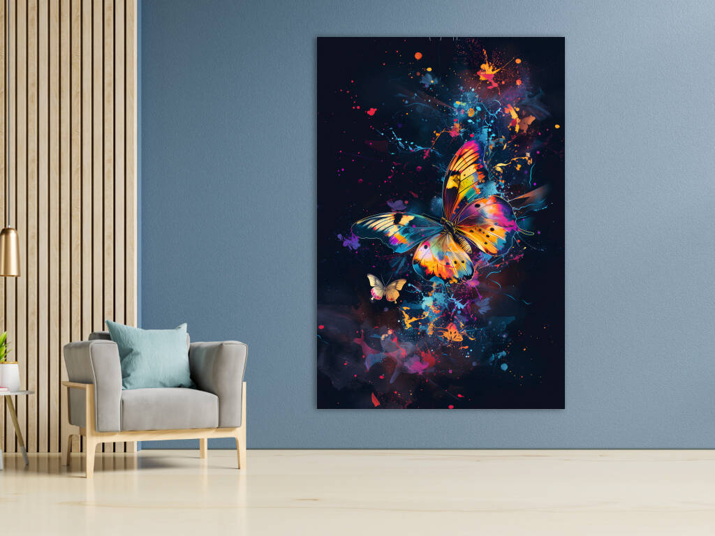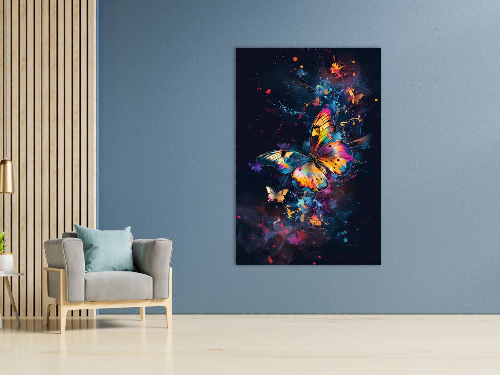 Splashful Butterfly explodeert in een symfonie van kleur en beweging tegen een diepe nachtblauwe achtergrond. Een majestueuze vlinder met vleugels in vurige oranje, elektrisch blauw en magenta zweeft te midden van een wervelwind van verfspetters en kleinere vlinders. De dynamische compositie suggereert transformatie en vrijheid, waarbij elke kleurexplosie de vreugde van metamorfose viert. Dit kunstwerk combineert natuurlijke gratie met abstracte energie, waarbij de vlinder symbool staat voor hoop en verandering. De levendige kleuren spatten als vuurwerk van het canvas, creëren een gevoel van kinderlijke verwondering en grenzeloze mogelijkheden. Perfect voor het toevoegen van een vleugje magie en optimisme aan elke ruimte, een visueel feest dat de schoonheid van transformatie viert.