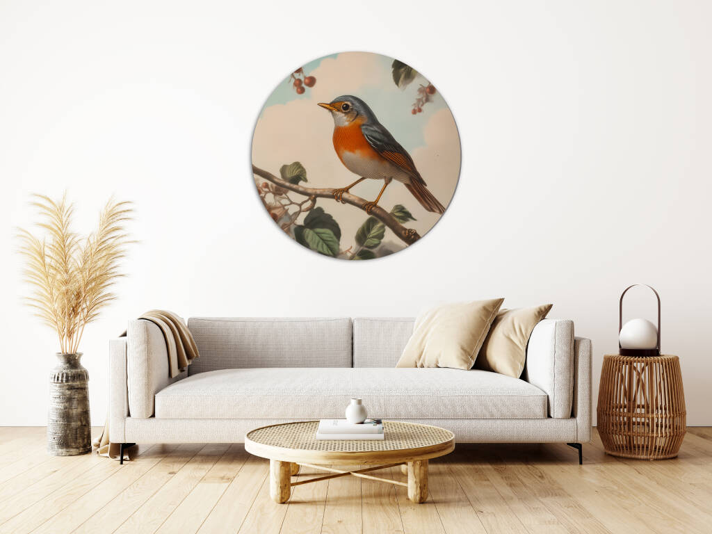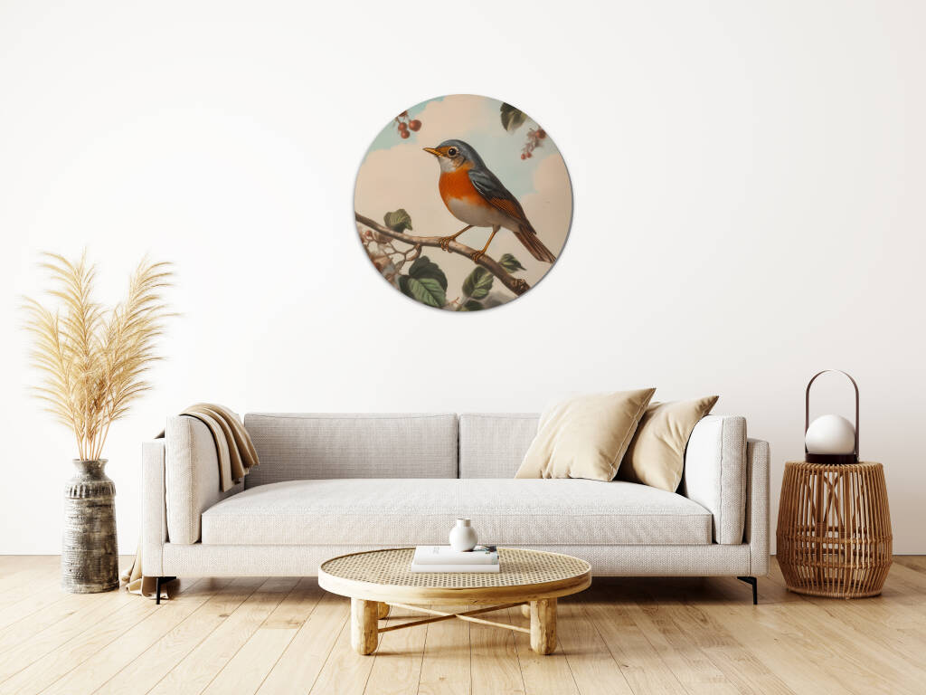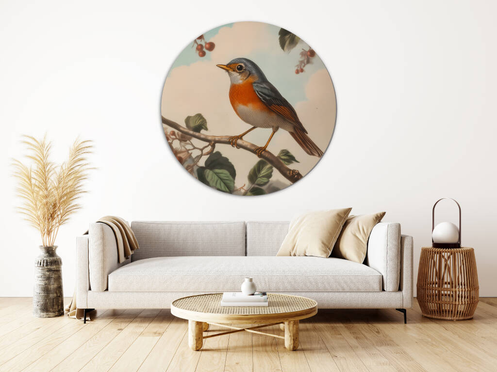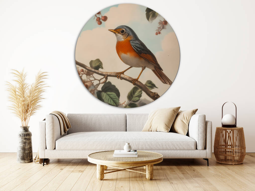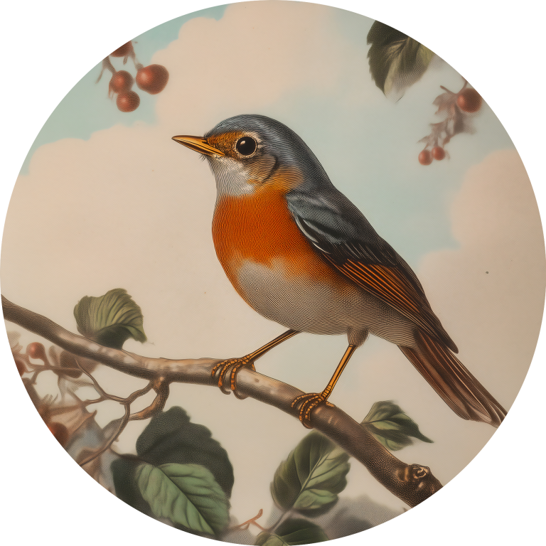 Red Robin presenteert een charmant roodborstje dat elegant poseert tussen de takken van een wilde kersenboom vol rijpe vruchten. De warme oranje borstkleur van het vogeltje contrasteert prachtig met de zachte neutrale tinten van de bladeren en de delicate besjes. Deze botanische vogelstudie in vintage stijl straalt rust en natuurlijke schoonheid uit, perfect voor wie houdt van klassieke natuurillustraties. Een tijdloze toevoeging die elke ruimte een gevoel van sereniteit en verbondenheid met de natuur geeft.