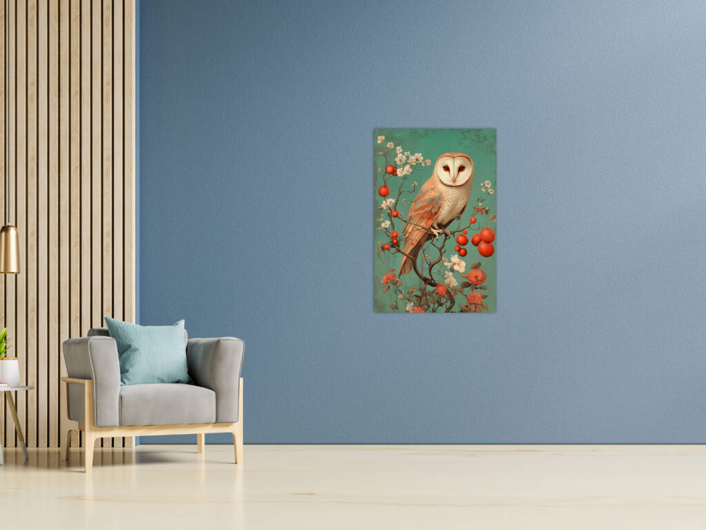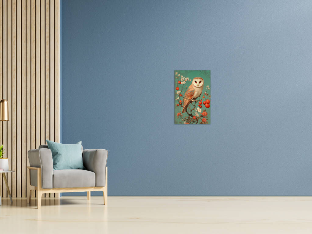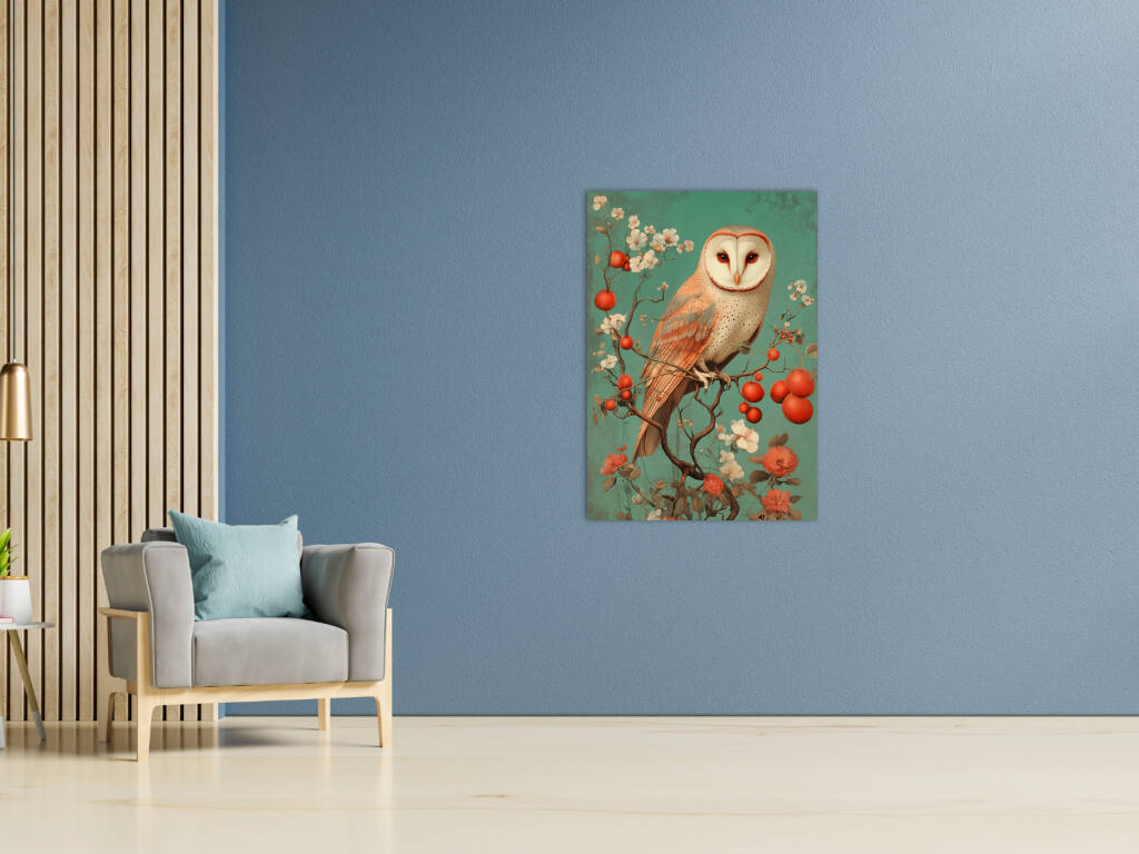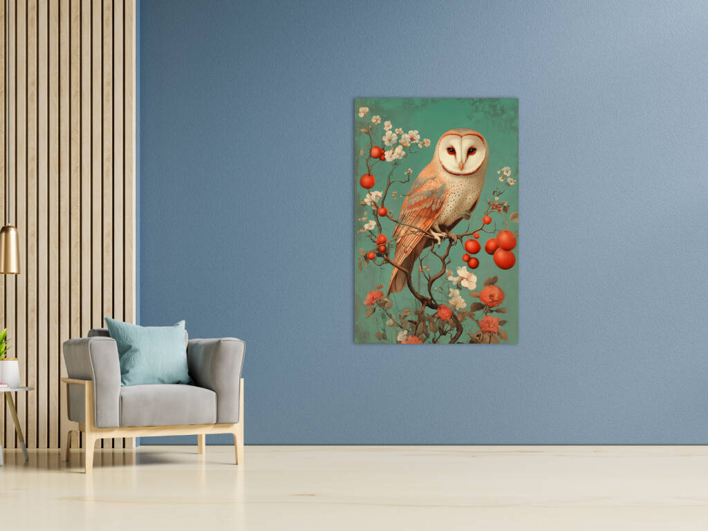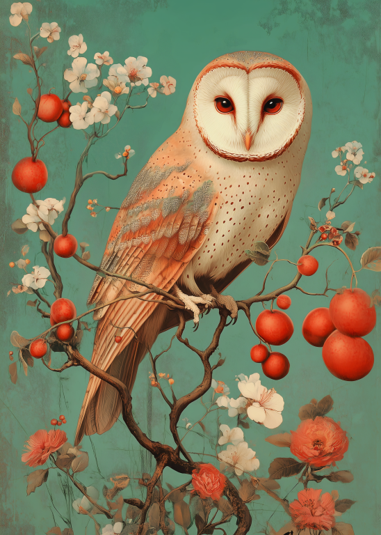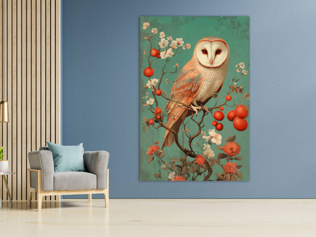Orchard Owl presenteert een betoverende kerkuil die rustig poseert tussen bloeiende appelboomtakken vol rijpe vruchten en delicate bloesems. De zachte pasteltinten en vintage botanische stijl geven dit kunstwerk een nostalgische charme die perfect past in een romantisch of landelijk interieur. De warme oranje en rode tinten van de appels contrasteren prachtig met de mintgroene achtergrond en de zachte verenstructuur van de uil. Een ontroerend beeld dat de harmonie tussen dier en natuur viert.