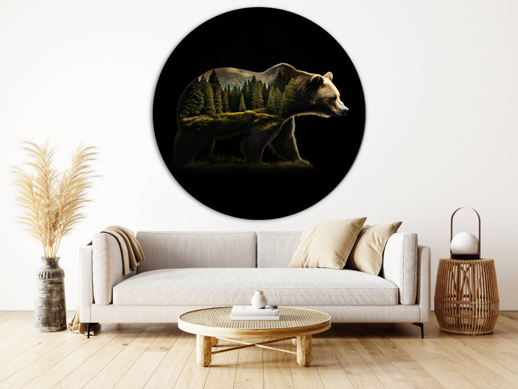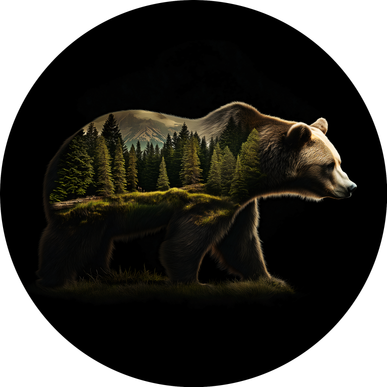 Forest Bear toont een fascinerend dubbel beeld waarin het silhouet van een beer een compleet boslandschap herbergt. De warme groentinten van dennenbomen en bergen vloeien naadloos over in de vorm van dit majestueuze dier, een poëtische weergave van de diepe verbondenheid tussen dier en habitat. Dit conceptuele kunstwerk symboliseert de onlosmakelijke band tussen natuur en haar bewoners. Perfect voor natuurliefhebbers die houden van kunst met een diepere betekenis.