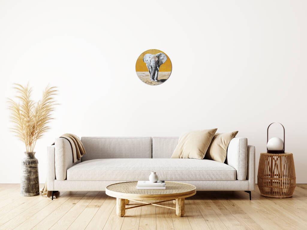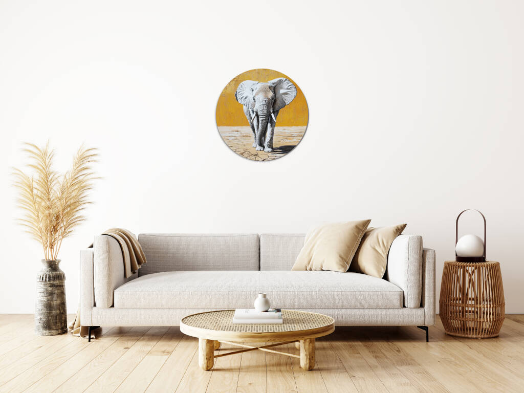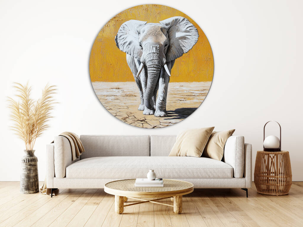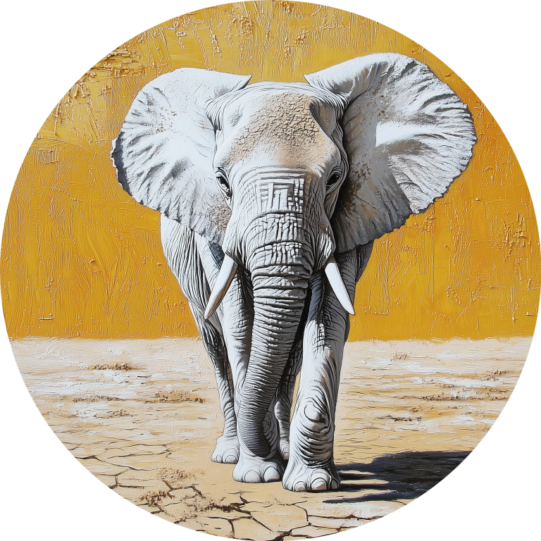 Elephant Desert toont een majestueuze olifant die standvastig doorheen een uitgedroogd landschap wandelt, waarbij de gebarsten aarde onder zijn poten de kracht van de natuur symboliseert. De imposante verschijning van het dier contrasteert prachtig met de warme, gouden achtergrond die de atmosfeer van de Afrikaanse savanne oproept. Elke rimpel en detail van de olifantshuid is zorgvuldig weergegeven, wat de waardigheid en wijsheid van dit iconische dier benadrukt. Dit krachtige kunstwerk brengt de grandeur van de wilde natuur direct in je leefruimte.