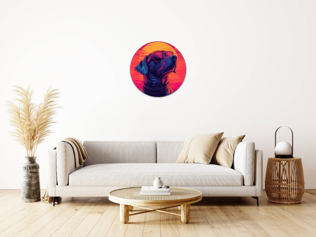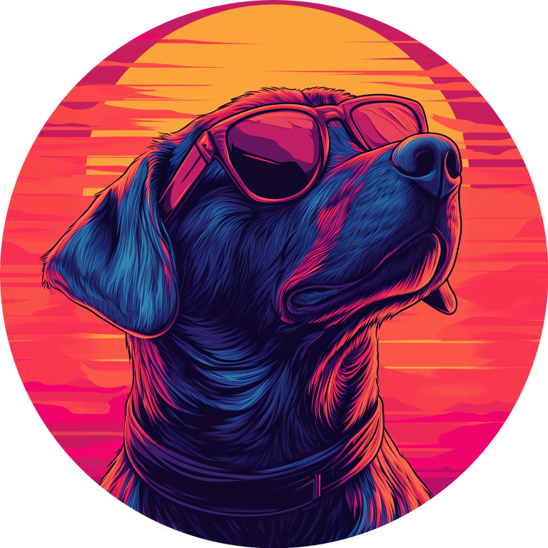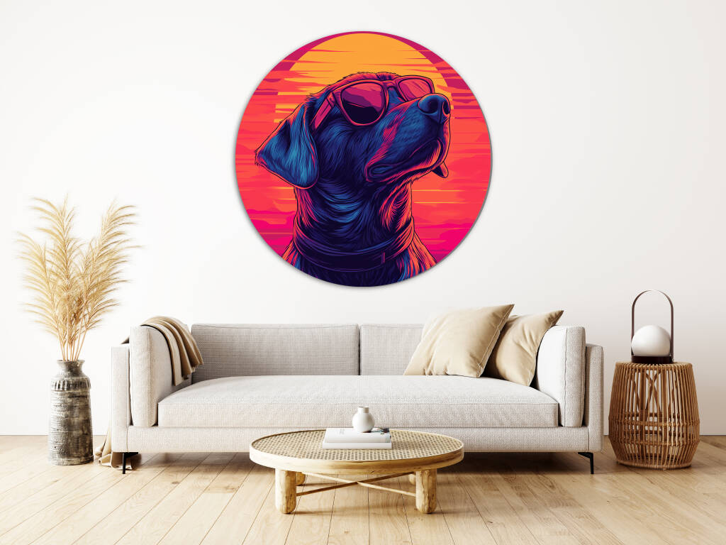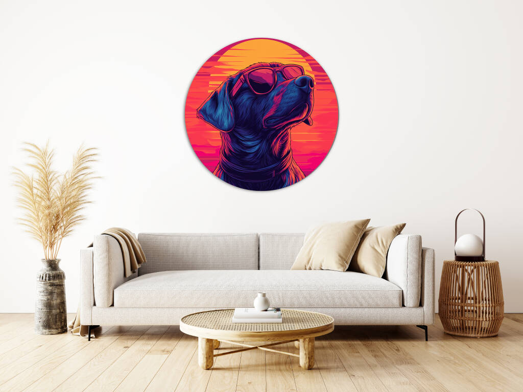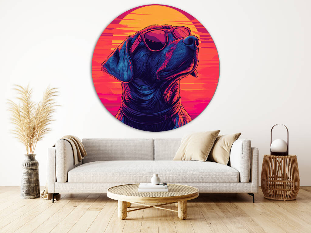Fluffbutt straalt pure coolheid uit met deze stoere hond die met zonnebril poseert tegen een spectaculaire retro zonsondergang. De levendige neon kleuren van roze, oranje en blauw creëren een nostalgische jaren 80 sfeer die instant een glimlach op je gezicht tovert. Dit humoristische portret combineert de trouwe blik van man’s beste vriend met hippe retro-wave esthetiek. Perfect voor hondenliefhebbers die houden van een vleugje humor en vintage flair in hun interieur.