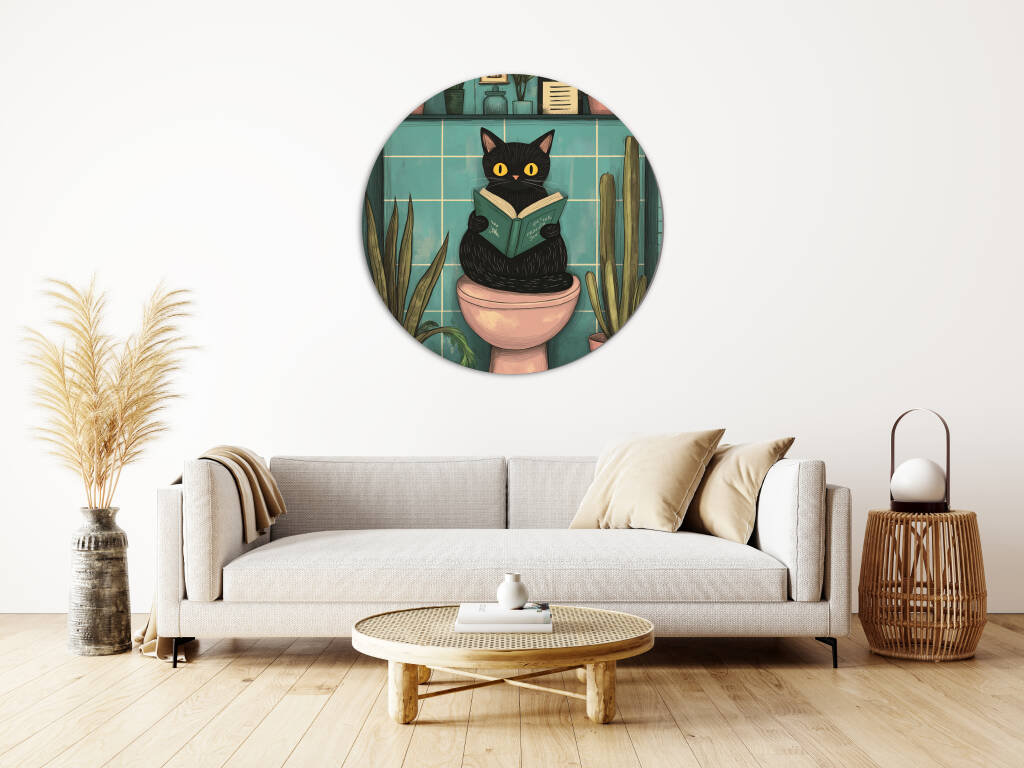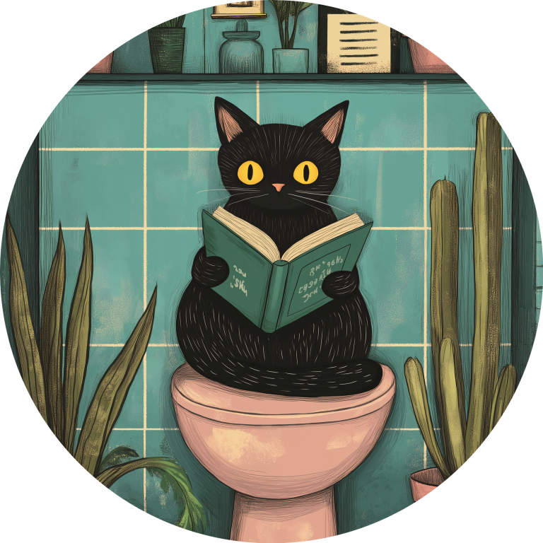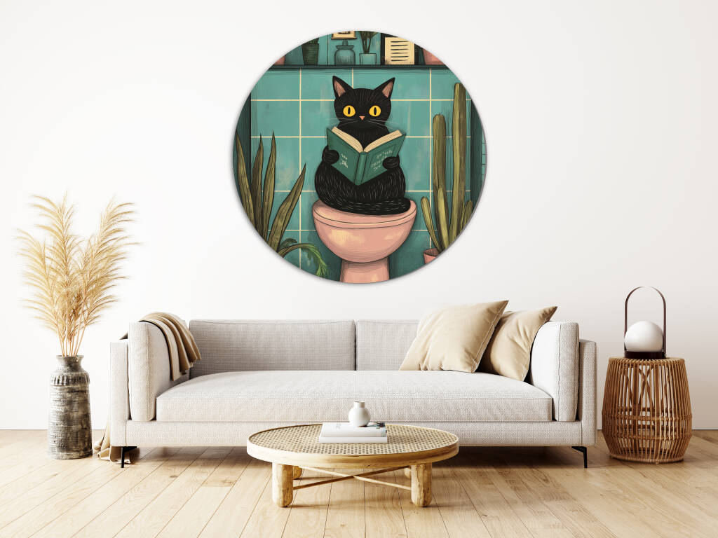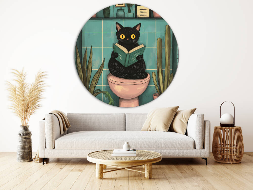 Occupied toont een charmante zwarte kat die zijn privémomentje heeft gekapt om rustig een boek te lezen in een prachtig ingerichte badkamer vol planten. De warme pastelkleuren en het speelse karakter maken dit een vrolijk en humoristisch kunstwerk dat elke ruimte instant gezelligheid geeft. De gedetailleerde illustratie met cactussen, vintage tegels en plantenpotten creëert een retro-moderne sfeer. Perfect voor liefhebbers van katten, humor en eigenzinnige decoratie.
