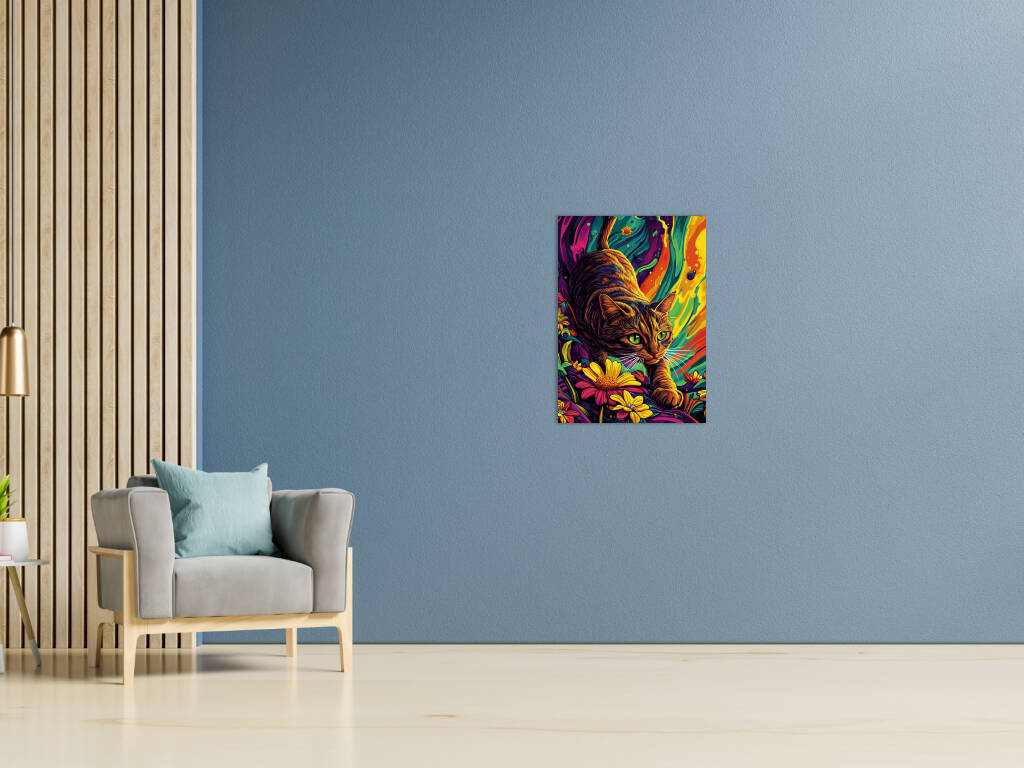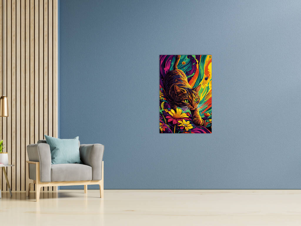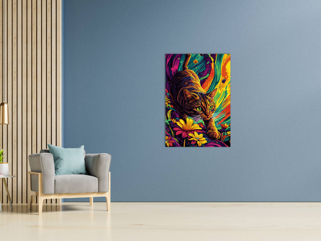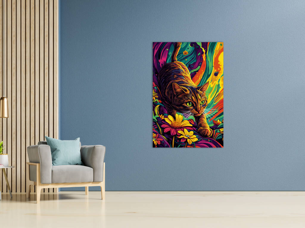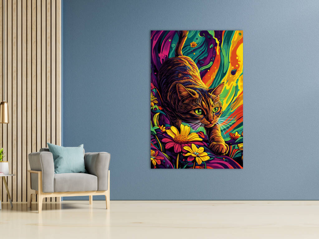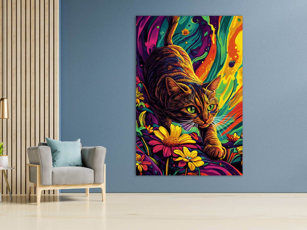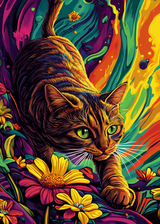 Een levendig en kleurrijk kunstwerk waarin een kat centraal staat. De kat beweegt sierlijk tussen felgekleurde bloemen, met haar ogen gefocust en alert. De achtergrond heeft een psychedelische uitstraling met vloeiende patronen en een mix van intense kleuren zoals oranje, geel, blauw en paars. De combinatie van realisme en abstractie geeft het schilderij een dromerige en dynamische sfeer, waardoor het zowel speels als mysterieus aanvoelt. Perfect voor liefhebbers van kunst en katten!