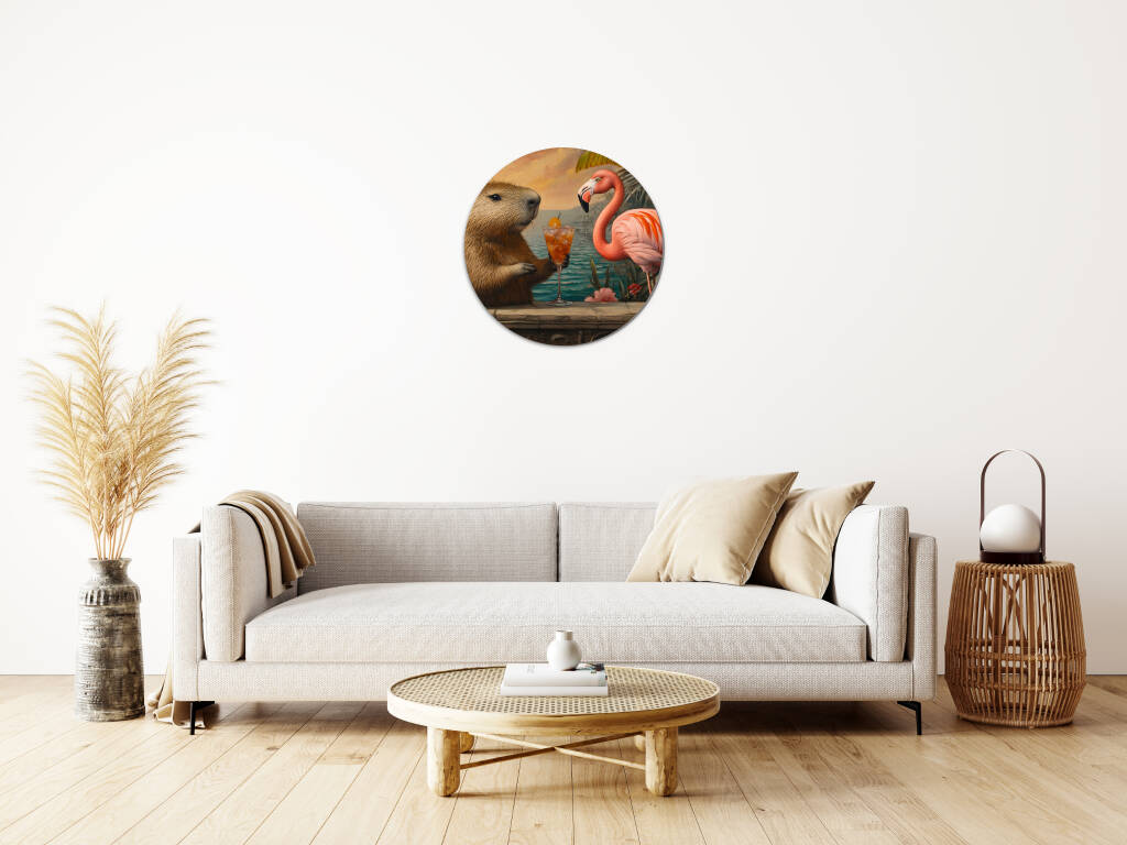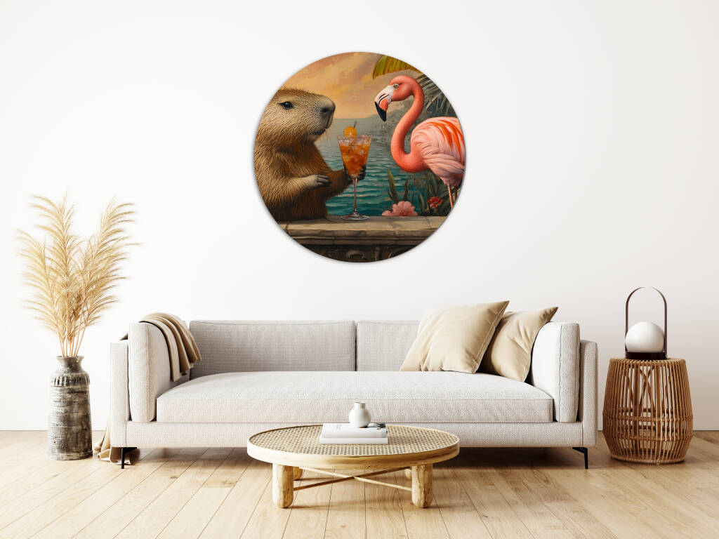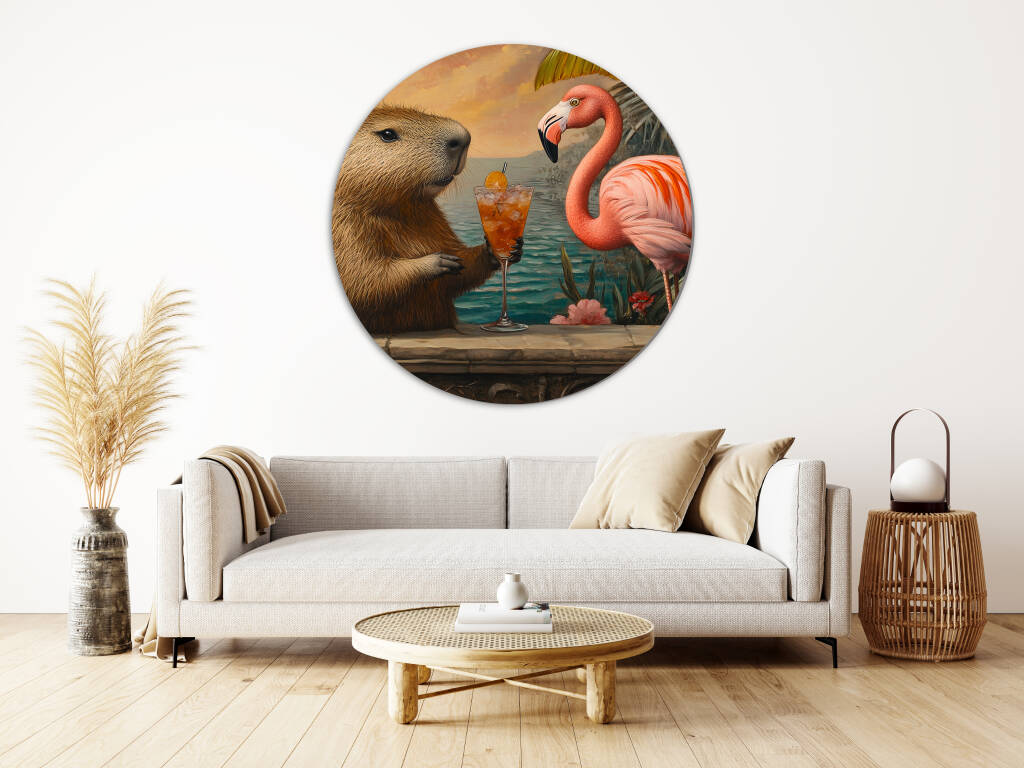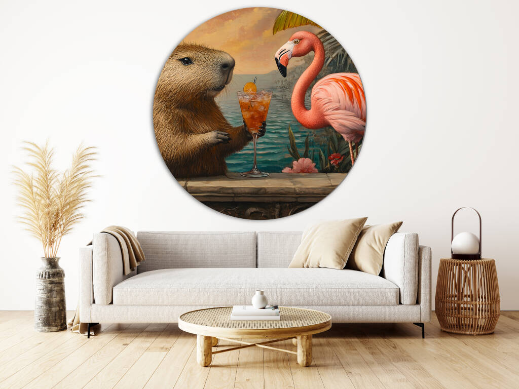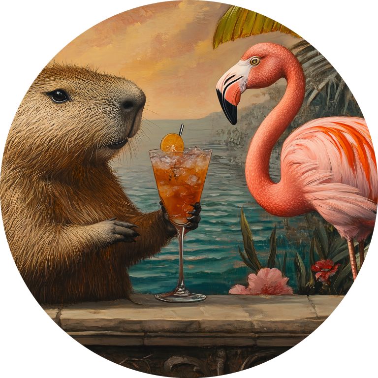 Your Drink, Madam presenteert een charmante ontmoeting tussen een galante capybara-barkeeper en een elegante flamingo-dame in een tropisch paradijs. De warme zonsondergangkleuren en luxueuze details van het terras creëren een sfeer van verfijnde ontspanning en humor. Dit speelse kunstwerk combineert vintage glamour met dierlijke charme op een manier die zowel kinderen als volwassenen doet glimlachen. Perfect voor wie houdt van eigenzinnige kunst met een vleugje humor en exotische flair.