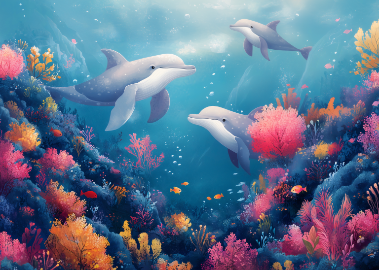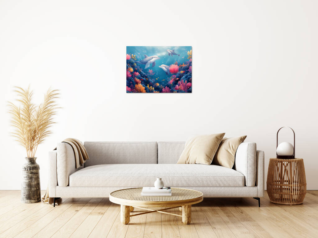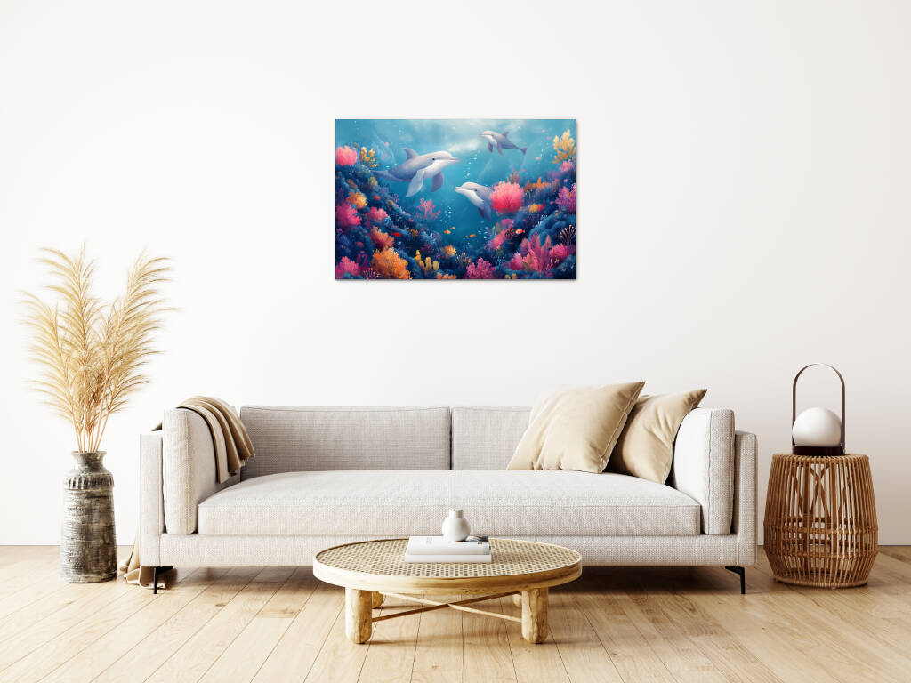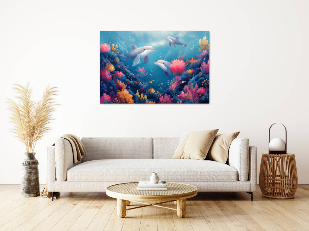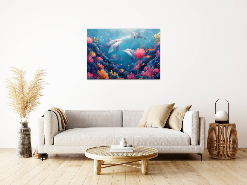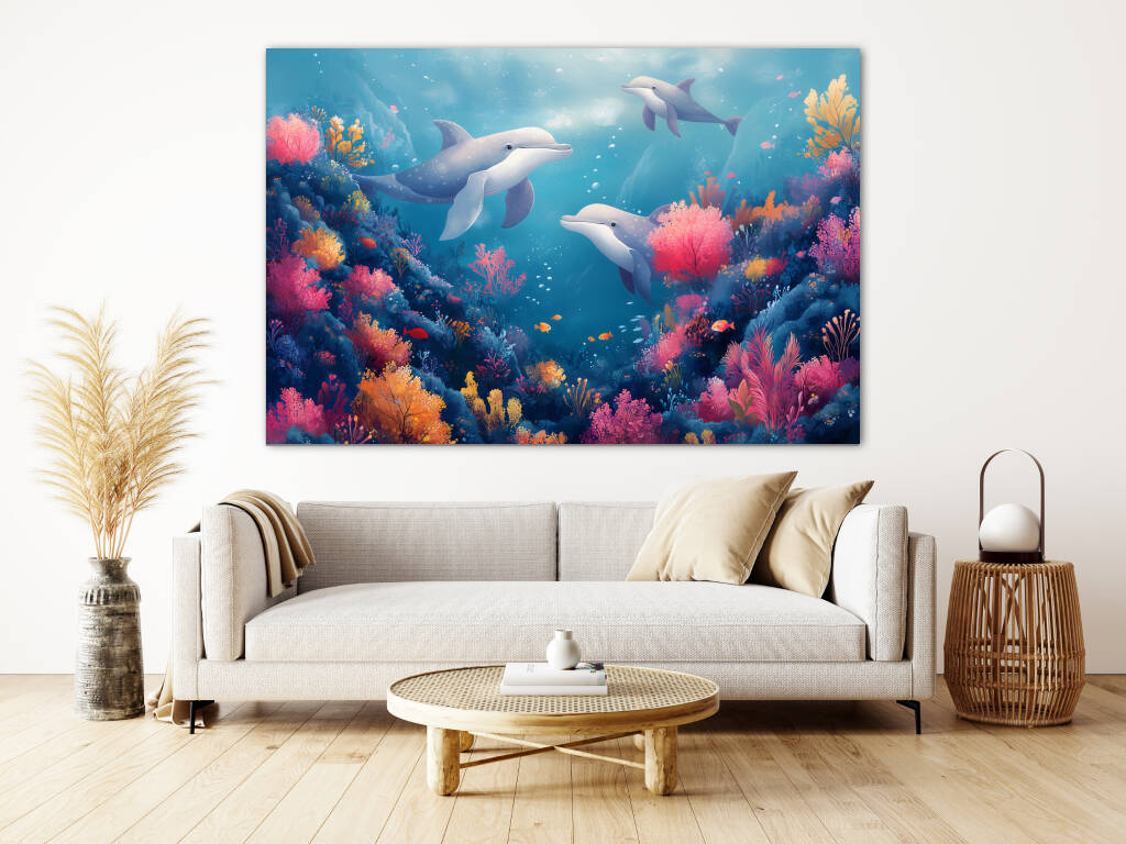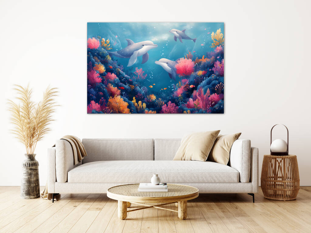 In dit betoverende onderwaterlandschap zweven drie speelse dolfijnen sierlijk door een levendig koraalrif. Omringd door een explosie van kleuren – met tinten roze, oranje, geel en blauw – straalt de scène een gevoel van rust en magie uit. Het kristalheldere water, gevuld met kleine luchtbelletjes en nieuwsgierige tropische vissen, nodigt de kijker uit om zich onder te dompelen in deze serene en dromerige oceaanwereld. De zachte gloed van het zonlicht dat door het water filtert, geeft de afbeelding een sprookjesachtige sfeer. Dit kunstwerk vangt niet alleen de schoonheid van de zee, maar ook de speelse en intelligente aard van dolfijnen, waardoor het een ware blikvanger is in iedere ruimte.