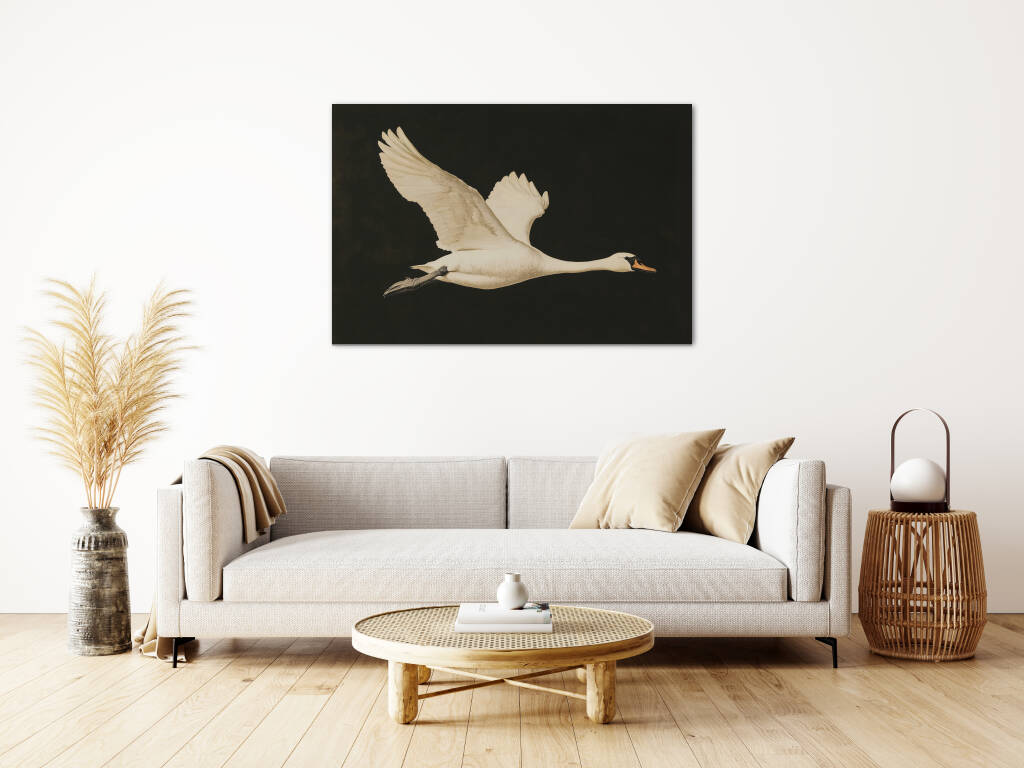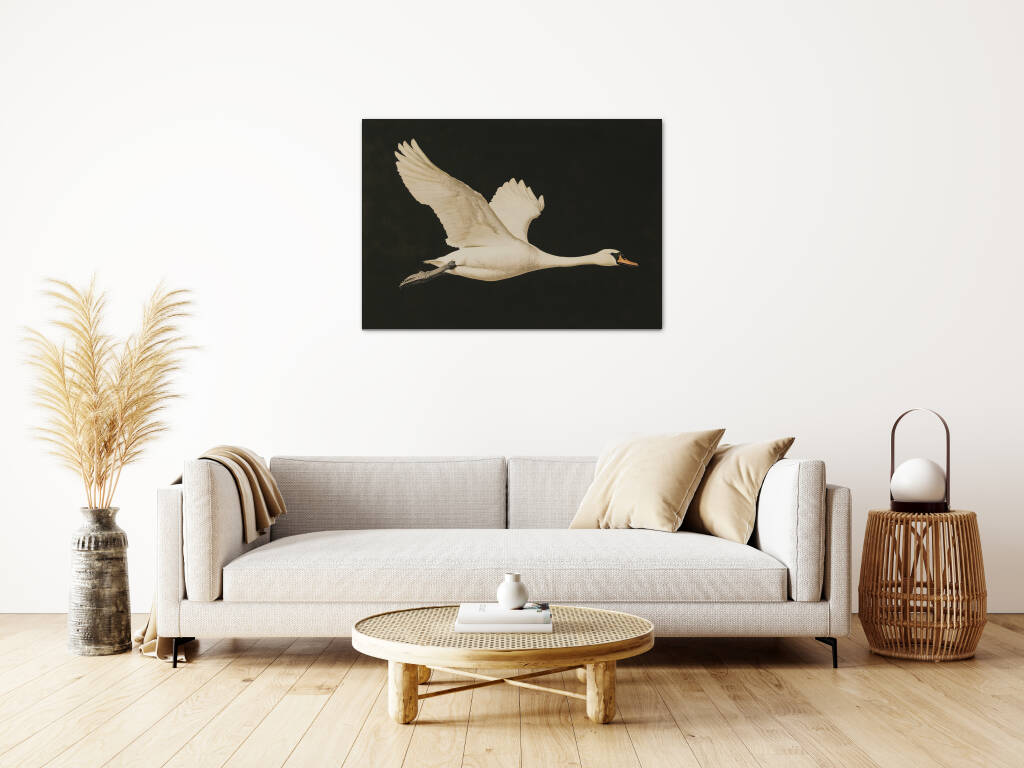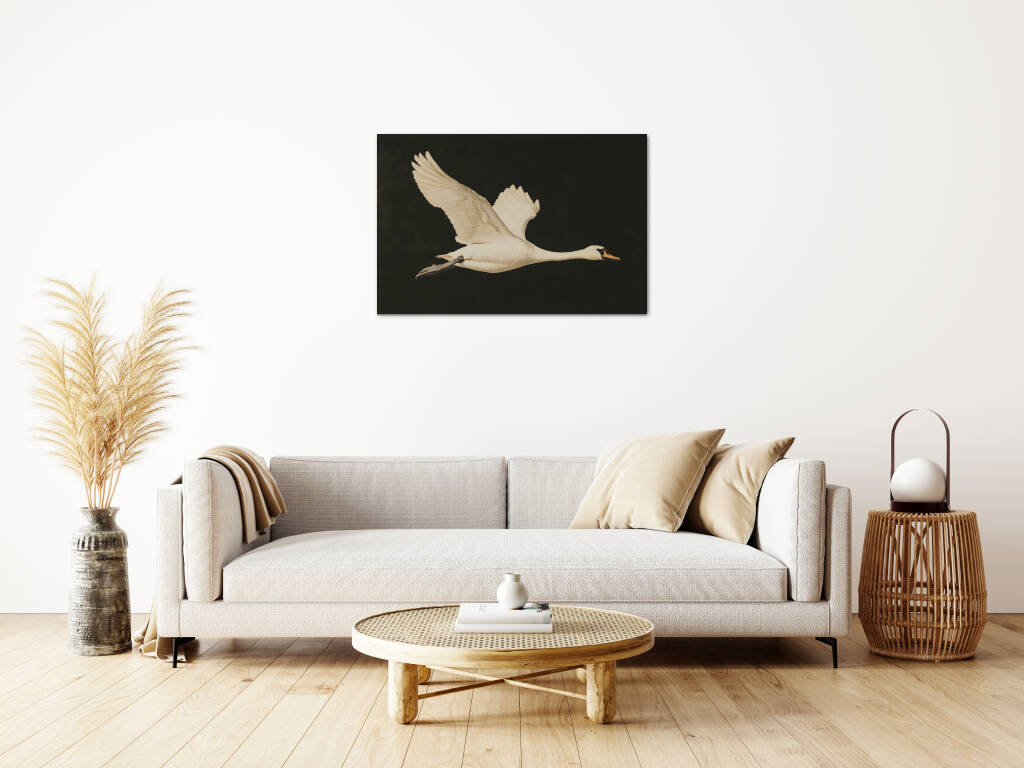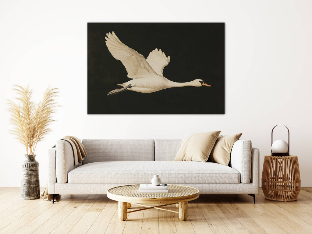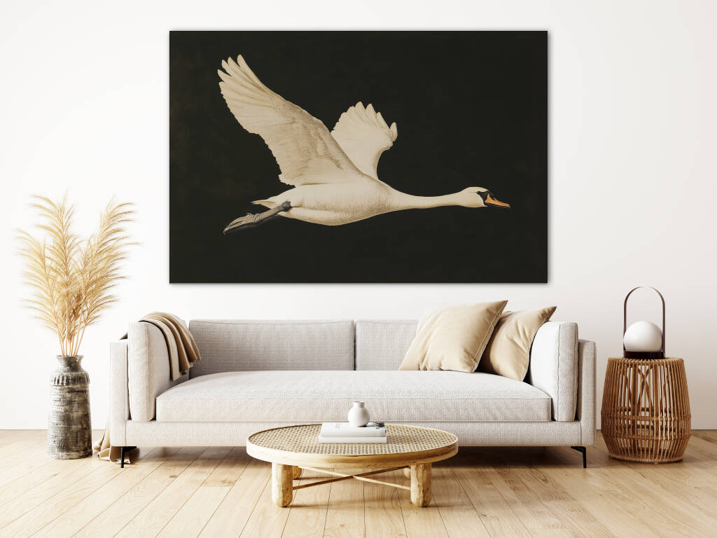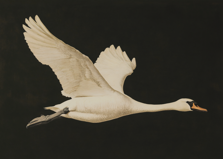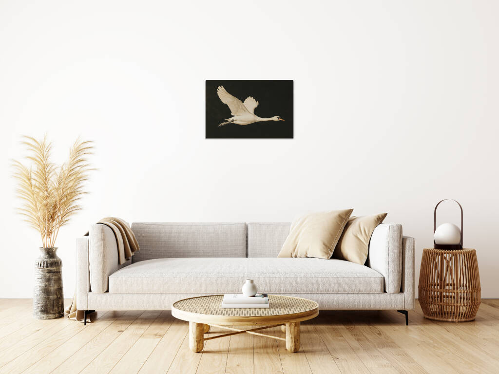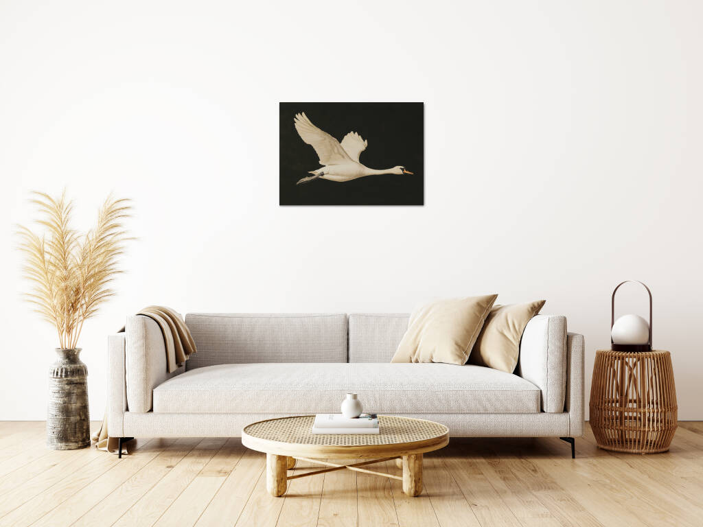 Flying Swan vangt de pure elegantie van een zwaan in volle vlucht tegen een diepe, mysterieuze achtergrond. De zachte crèmetinten van de gespreide vleugels contrasteren prachtig met het donkere decor, waardoor elke veer en beweging tot leven komt. Dit tijdloze beeld van gratie en vrijheid straalt natuurlijke schoonheid uit in zijn meest verfijnde vorm. Perfect voor liefhebbers van klassieke natuurfotografie die rust en sereniteit zoeken in hun interieur.