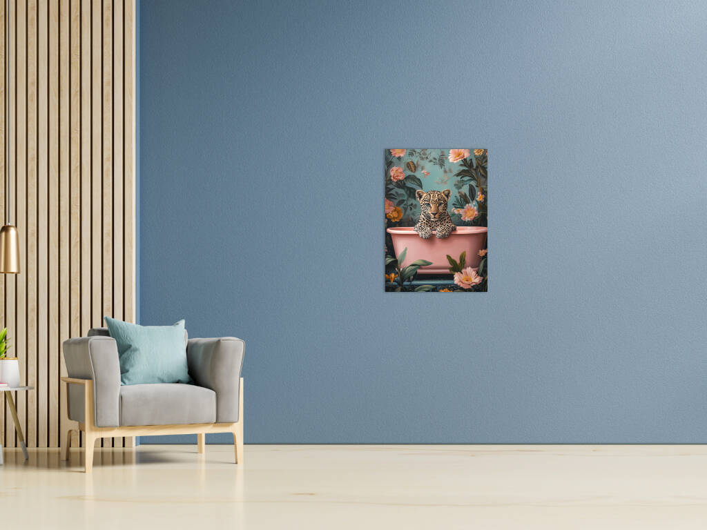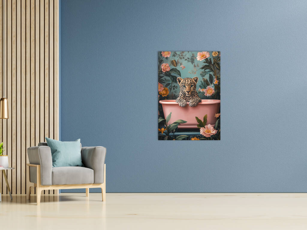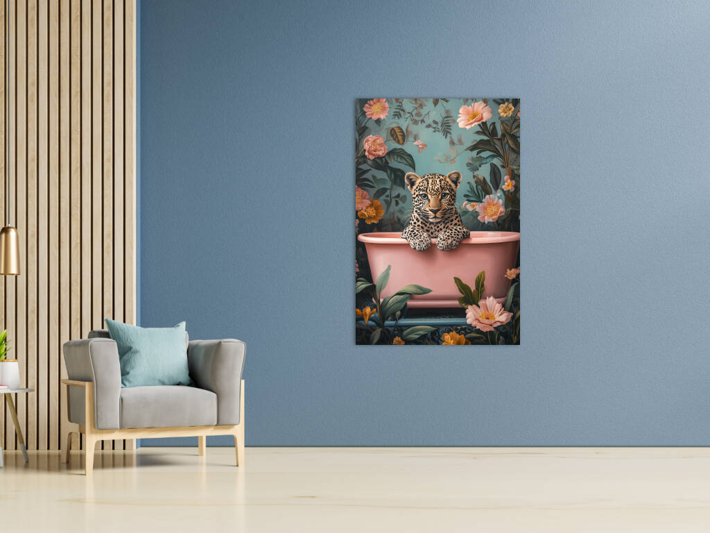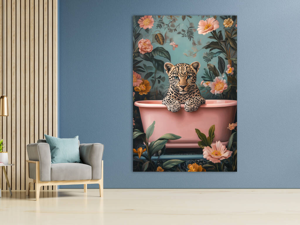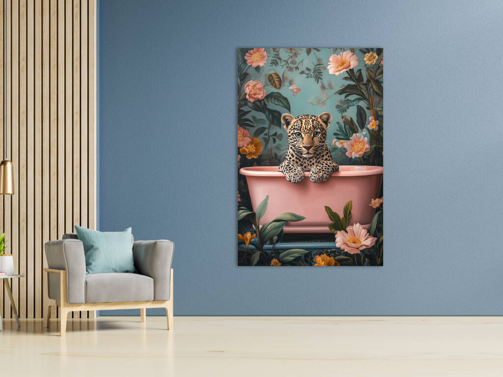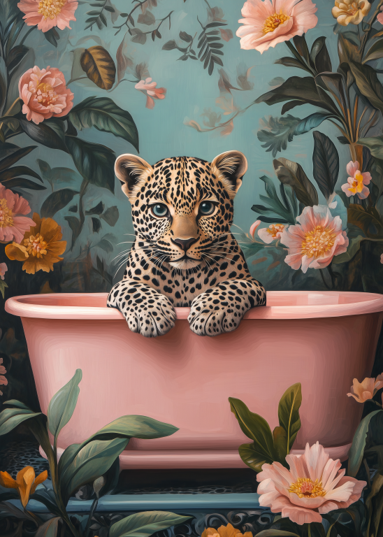 Een jonge luipaard zit nieuwsgierig in een roze badkuip te midden van een levendig, botanisch decor. De achtergrond is gevuld met weelderige bloemen in warme tinten van roze, geel en groen, die contrasteren met de turquoise muur. Het luipaard kijkt speels maar zelfverzekerd, wat een combinatie van charme en mysterie toevoegt aan het tafereel. De compositie straalt een mix van elegantie en speelse fantasie uit, waarbij het natuurlijke en het surrealistische op harmonieuze wijze samenkomen.