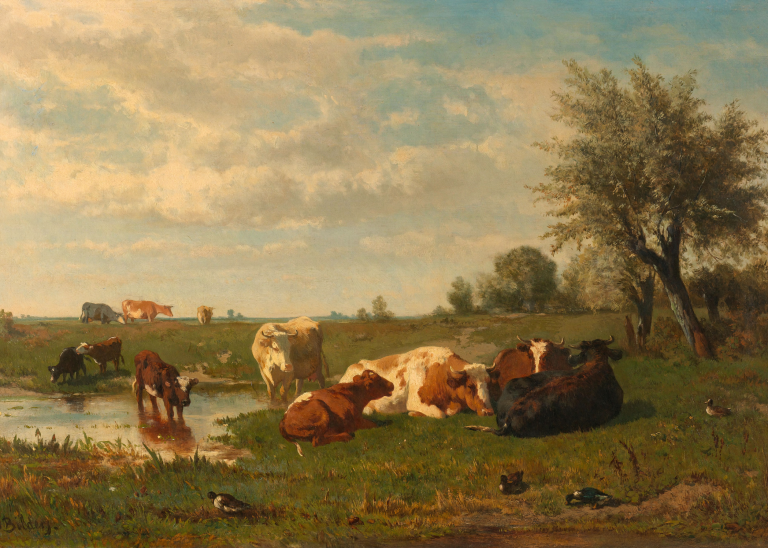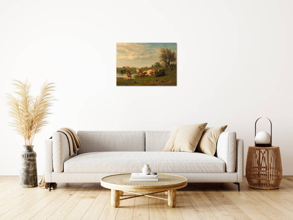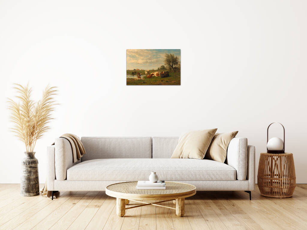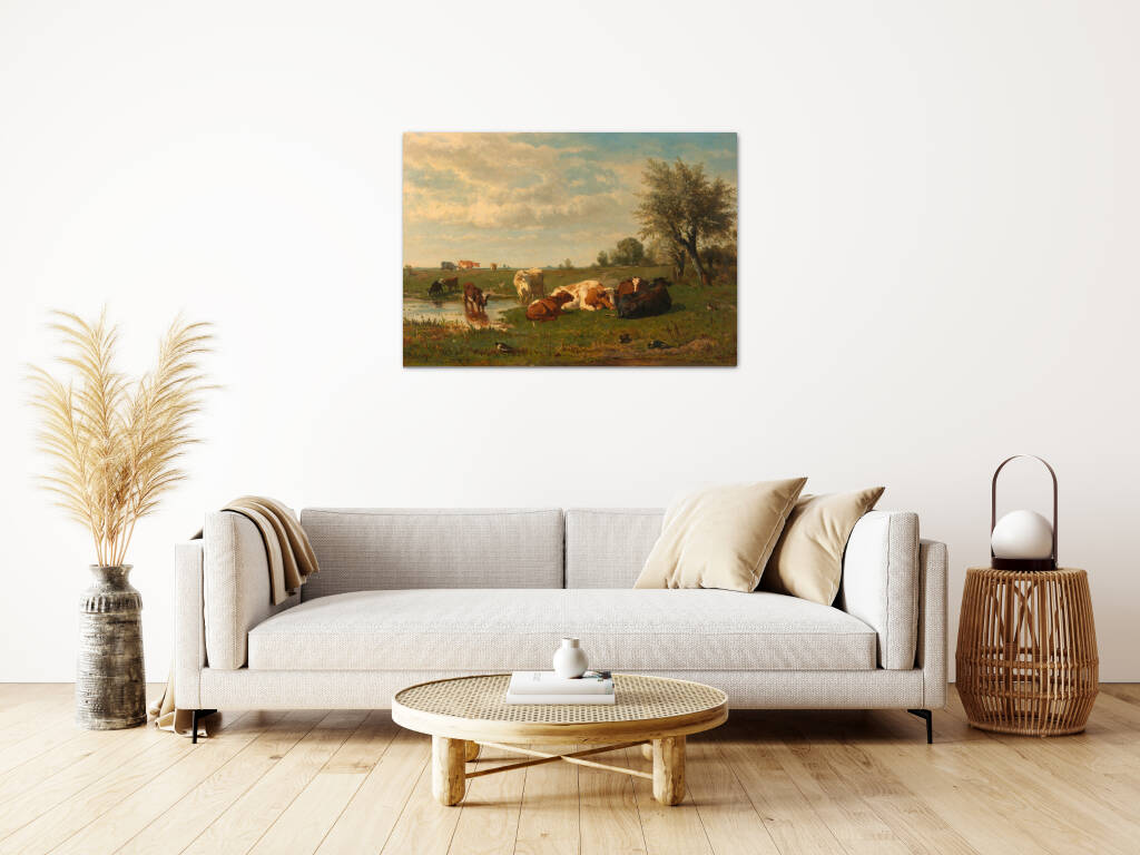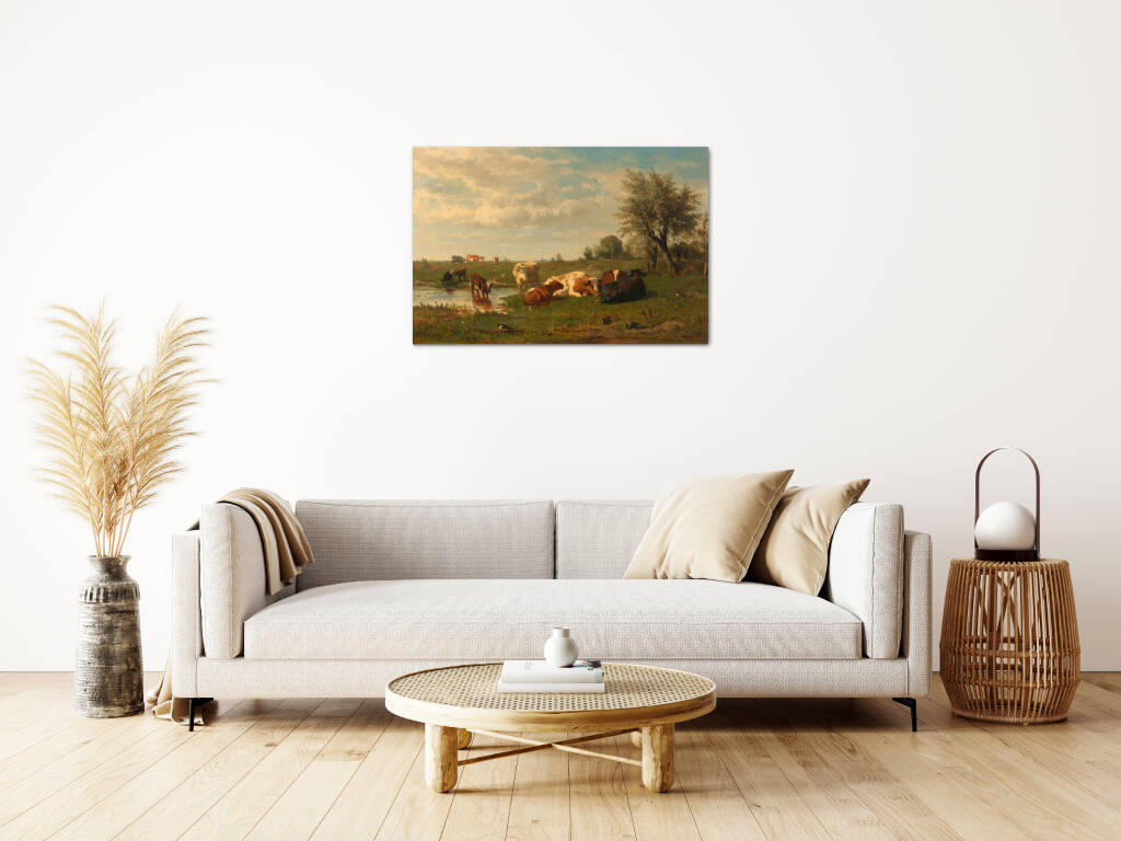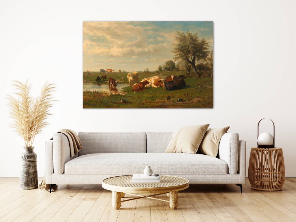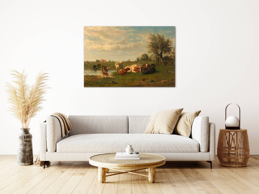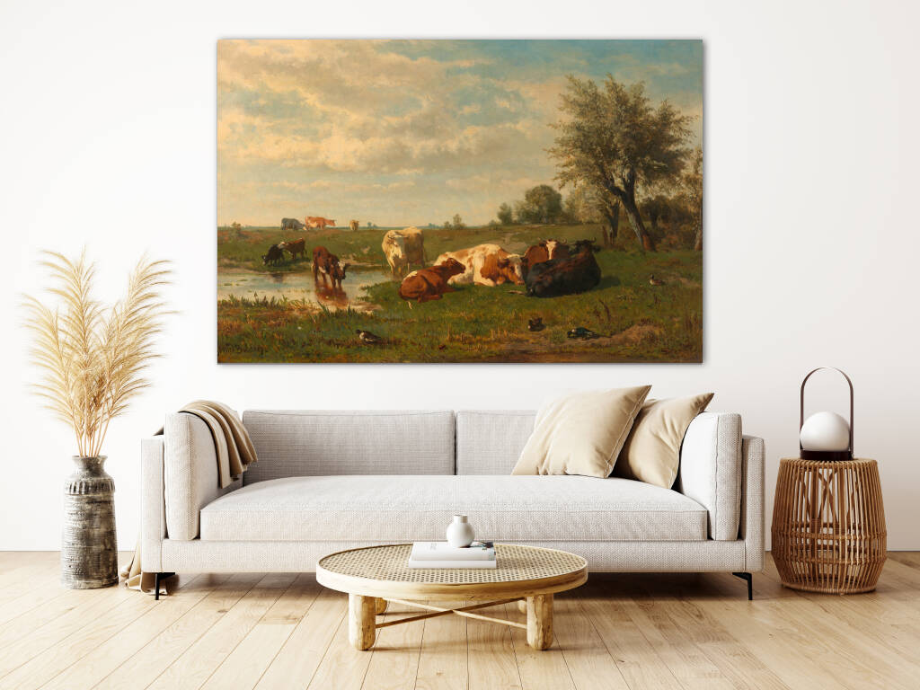Koeien in de Weide brengt de tijdloze schoonheid van het Nederlandse platteland tot leven met grazende koeien aan een waterpartij onder een wijde Hollandse hemel. De warme aardtinten en het zachte licht vangen de vredige sfeer van een zomerse middag waarbij de dieren rust vinden bij het water. Dit klassieke landschapstafereel ademt de romantische traditie van de Hollandse meesters. Ideaal voor liefhebbers van pastorale scènes en de rustgevende kracht van het Nederlandse landschap.