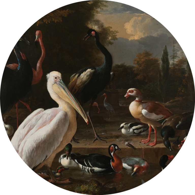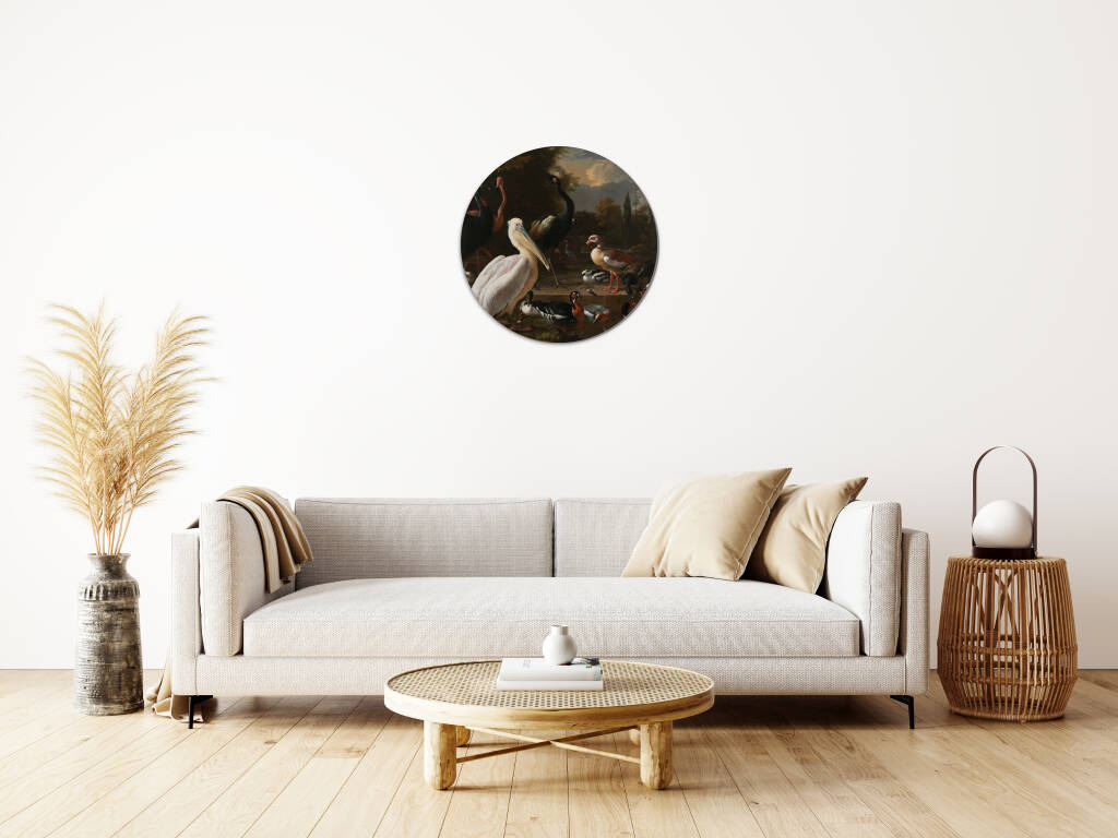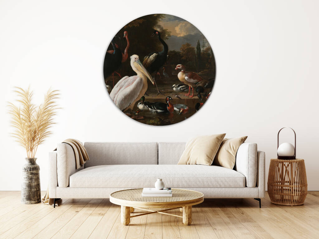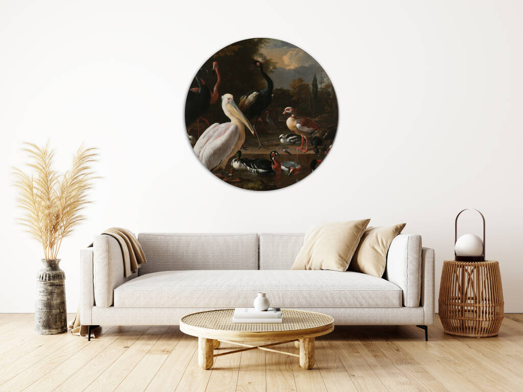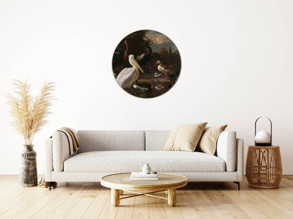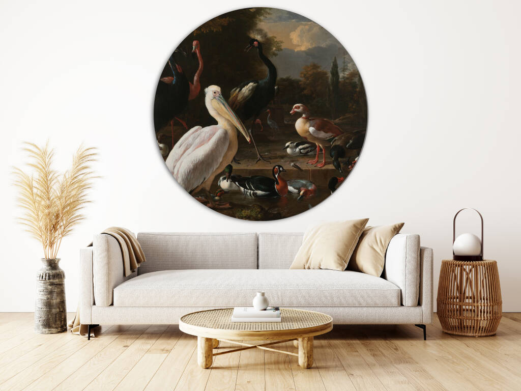 Het Drijvend Veertje toont een levendige verzameling watervogels in hun natuurlijke habitat, waarin een majestueuze pelikaan centraal staat omgeven door zwanen, eenden en andere waterdieren. Het klassieke schilderij ademt de sfeer van de Gouden Eeuw met zijn rijke aardtinten en de minutieuze aandacht voor natuurdetails. De serene compositie en de harmonische groepering van de dieren creëren een gevoel van vrede en natuurlijke schoonheid. Dit meesterwerk brengt de tijdloze elegantie van klassieke natuurschilderkunst en de fascinatie voor het dierenrijk in je interieur.