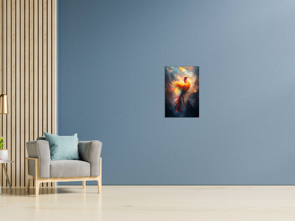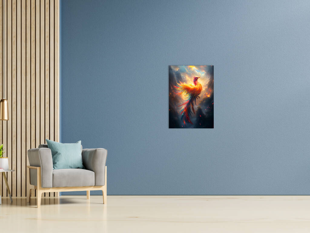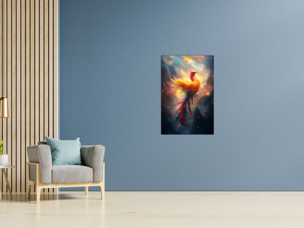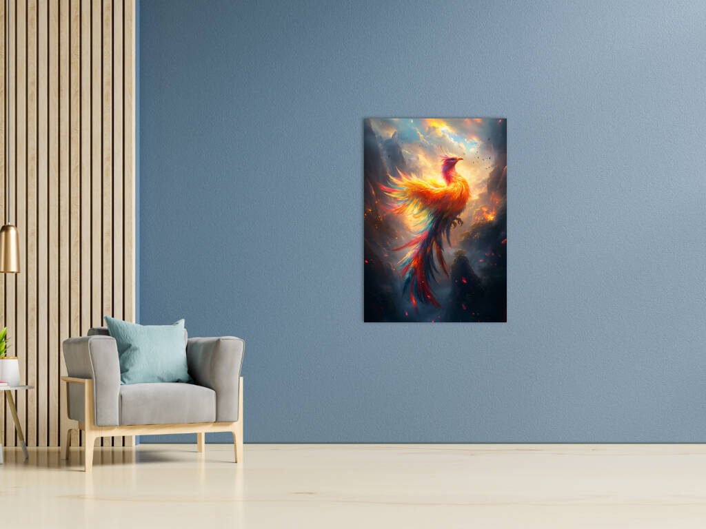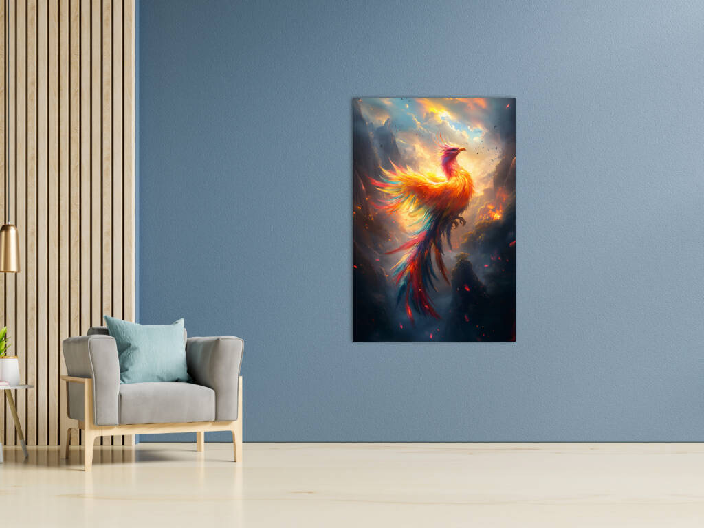 Mystical Phoenix rijst op uit vuur en as in een spectaculaire explosie van gouden en oranje vlammen tegen een dramatische hemelachtergrond. De majestueuze vogel straalt kracht en wedergeboorte uit, waarbij elke veer lijkt te dansen in het vuur van transformatie. Dit epische fantasiekunstwerk symboliseert hoop, vernieuwing en de onverwoestbare kracht van de geest. Perfect voor wie gelooft in tweede kansen en de magie van mythische wezens koestert.