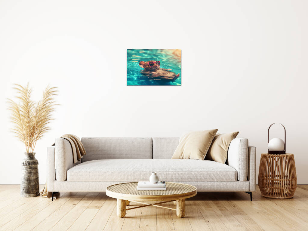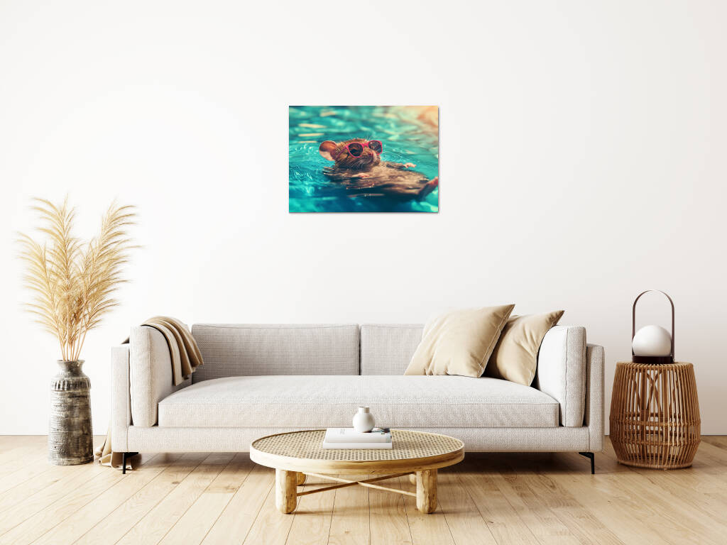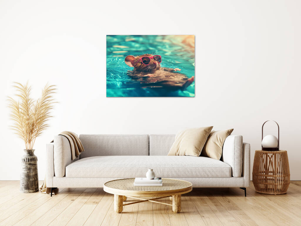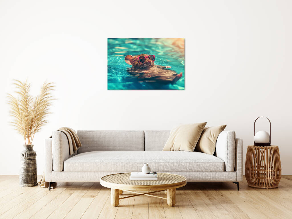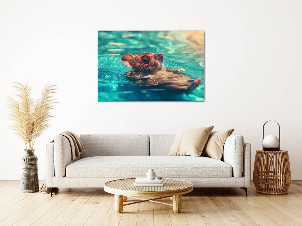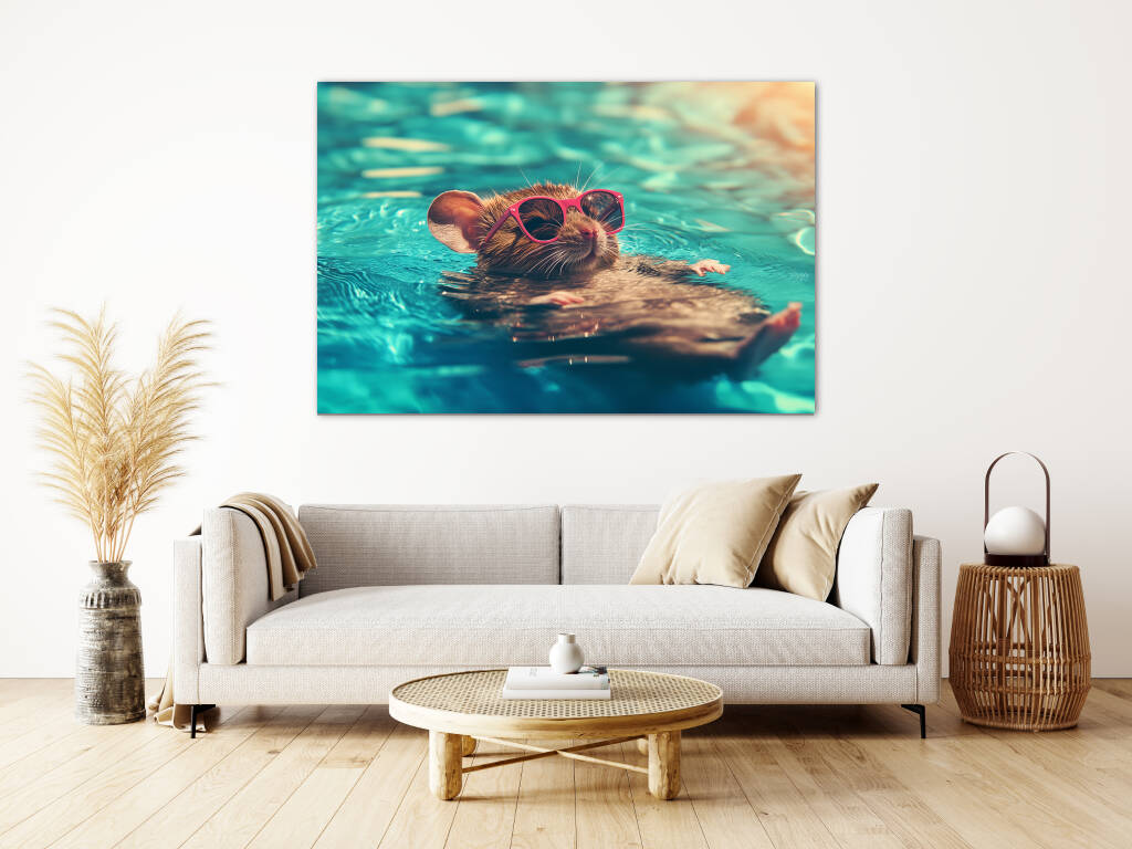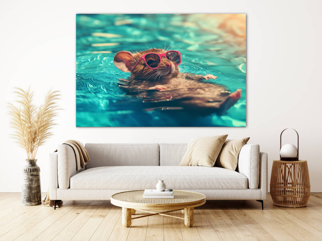 Relaxing Mouse toont een ontroerend moment waarin een kleine muis met coole zonnebril geniet van een verfrissende duik in kristalhelder turquoise water. De hyperrealistische weergave en de speelse combinatie van natuurlijke schoonheid met humoristische elementen maken dit tot een uniek kunstwerk dat zowel kinderen als volwassenen doet glimlachen. De zomerse sfeer en de vrolijke uitstraling van dit relaxte muisje brengen instant positiviteit en vrolijkheid in elke ruimte.