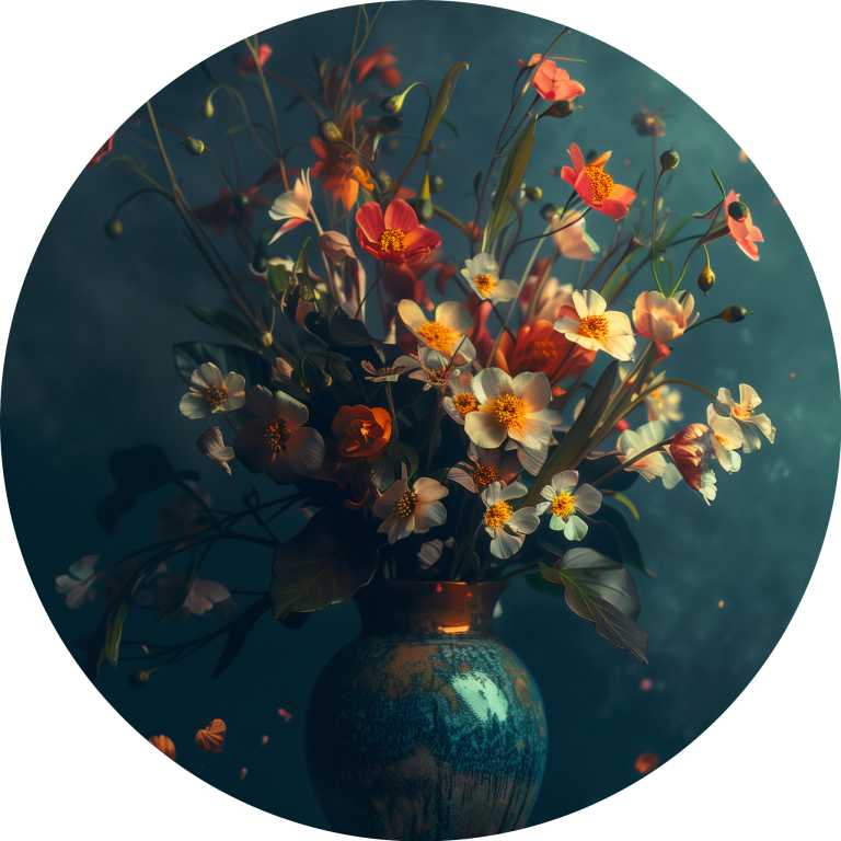 Summerly Bouquet is een sfeervol kunstwerk dat een weelderig boeket bloemen in een elegante vaas toont, met warme zomertinten die harmoniëren met een dromerige achtergrond in diep blauwgroen. De bloemen lijken bijna tot leven te komen door het subtiele licht, terwijl los dwarrelende bloemblaadjes een dynamisch en poëtisch effect creëren. De verfijnde details en het rijke kleurgebruik roepen een gevoel van rust en romantiek op, waardoor het schilderij de essentie van een warme zomerdag vastlegt.