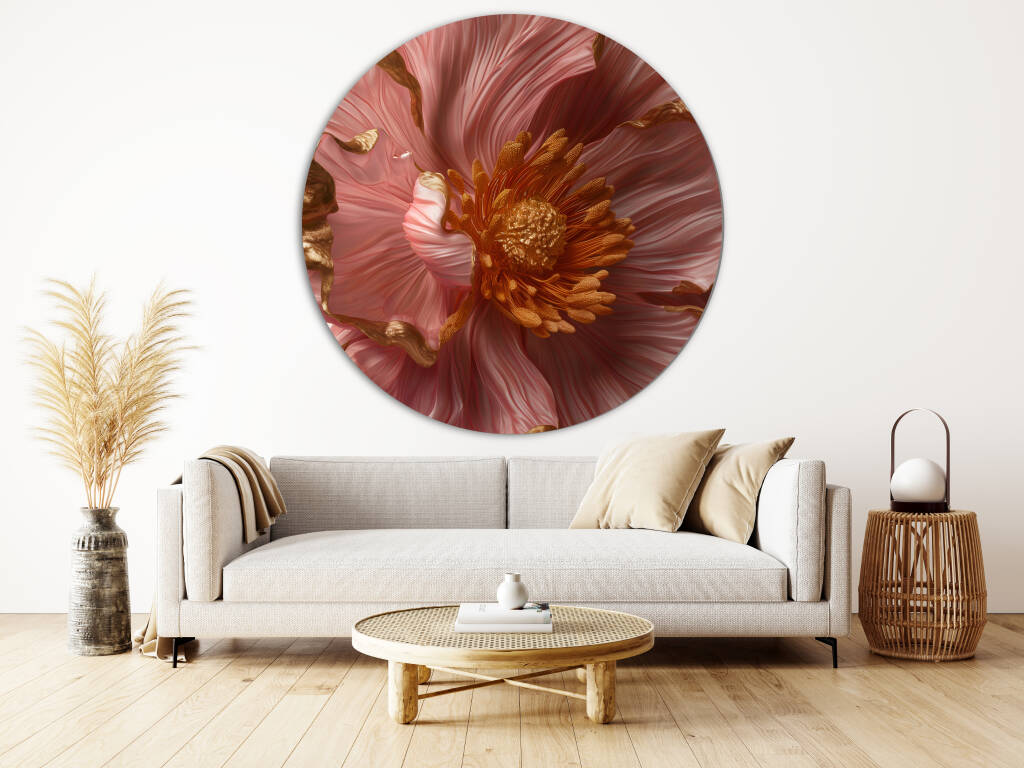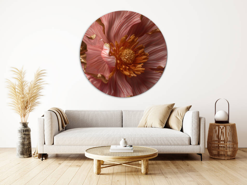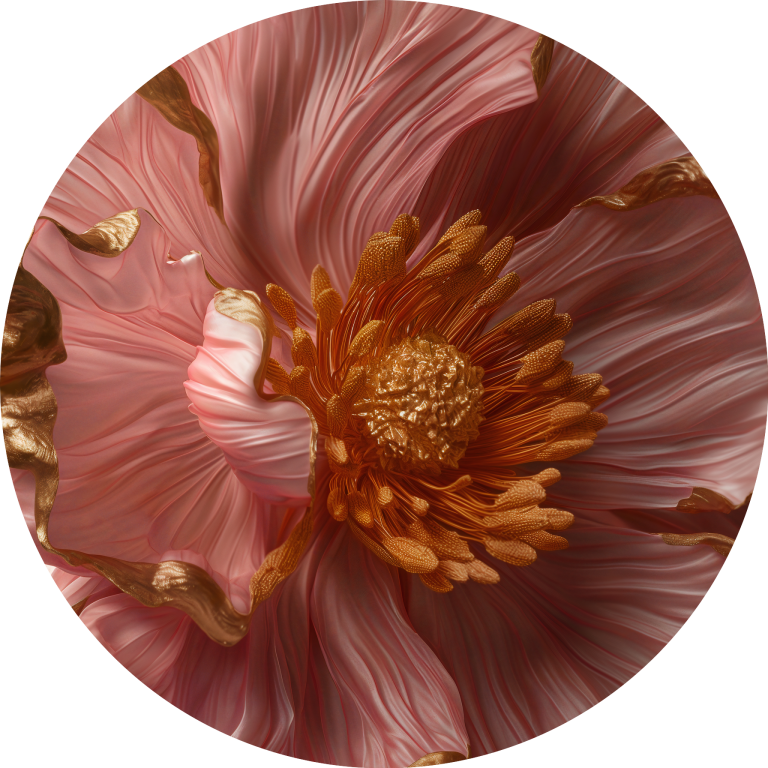 Pinkgold Flower toont een weelderige bloem met elegante, golvende bloemblaadjes in een zachte roze tint, verfijnd met luxueuze gouden randen. De gedetailleerde textuur en subtiele glans geven de compositie een sculpturaal effect, waardoor de bloem een driedimensionale uitstraling krijgt. Het hart van de bloem straalt warmte uit met zijn rijke, goudoranje tinten, wat een harmonieuze balans creëert tussen zachtheid en luxe. Dit kunstwerk ademt elegantie en verfijning, perfect voor een chique en stijlvolle interieursetting.