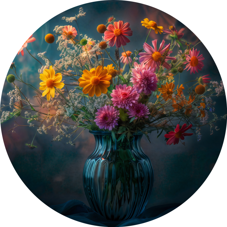 Wildflower Bouquet straalt een dromerige, romantische sfeer uit. In een elegante, geribbelde glazen vaas staat een weelderig boeket van wilde bloemen in volle bloei. Gele en oranje bloemen stralen warmte uit, terwijl de roze en paarse bloemen een zachte, speelse charme toevoegen. De fijne, witte bloemen van het gipskruid en groene stelen brengen luchtigheid in het arrangement. De achtergrond is mysterieus en artistiek vervaagd met zachte tinten blauw, paars en rood, wat de bloemen laat oplichten als de sterren van de compositie. Dit stuk ademt rust en natuurlijke schoonheid — perfect voor een sfeervolle, elegante ruimte.
