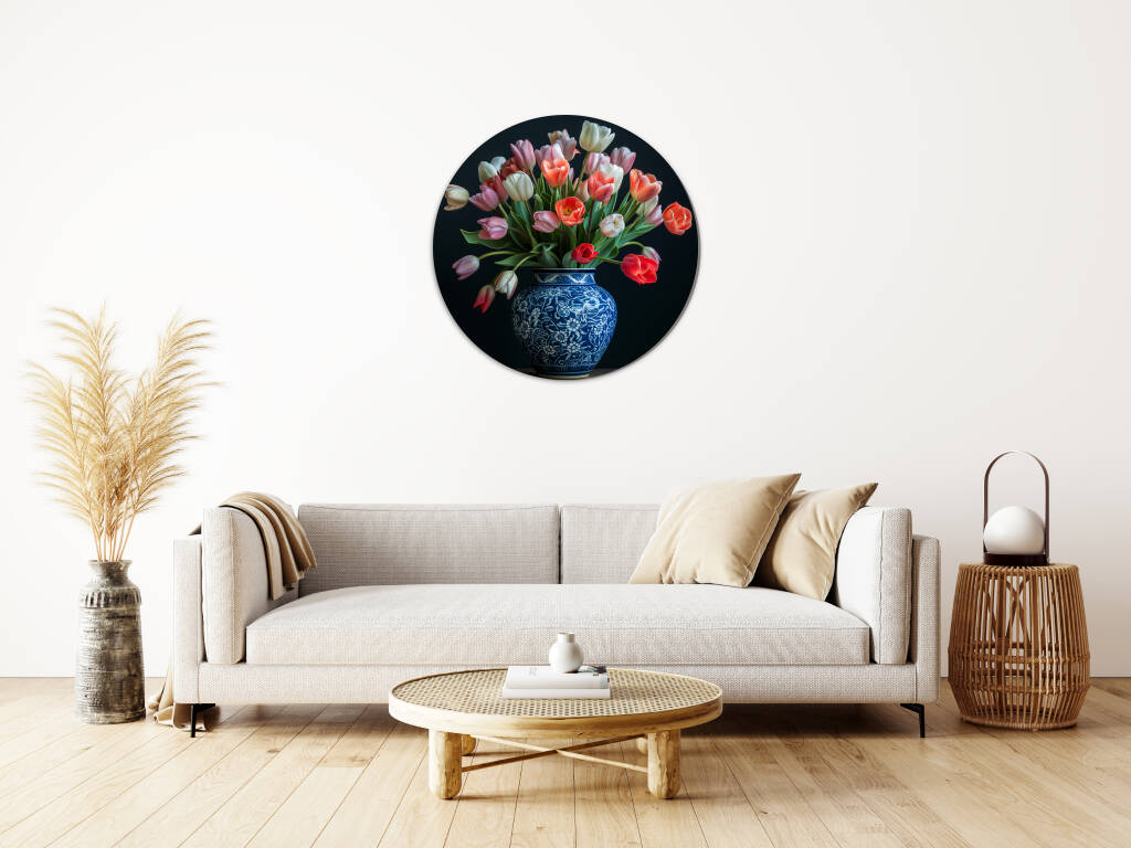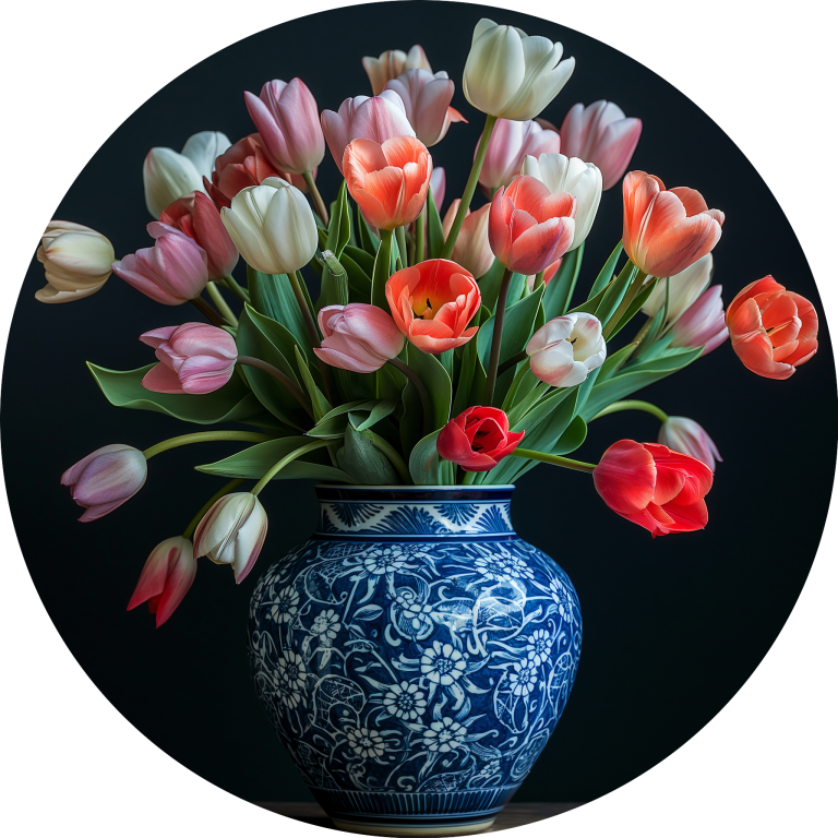 Dutch Glory eert de Nederlandse bloementraditie met een prachtige collectie tulpen in een klassieke Delfts blauwe vaas. De kleurrijke tulpen variëren van zachte pasteltinten tot levendige rood- en rozetinten, waarbij elke bloem zorgvuldig gepositioneerd is om de natuurlijke schoonheid te benadrukken. De traditionele vaas met zijn verfijnde blauwe patronen vormt een perfecte harmonie tussen Nederlandse geschiedenis en bloempracht. Dit tijdloze kunstwerk brengt de essentie van de Nederlandse Gouden Eeuw en de beroemde tulpenliefde tot leven in je interieur.