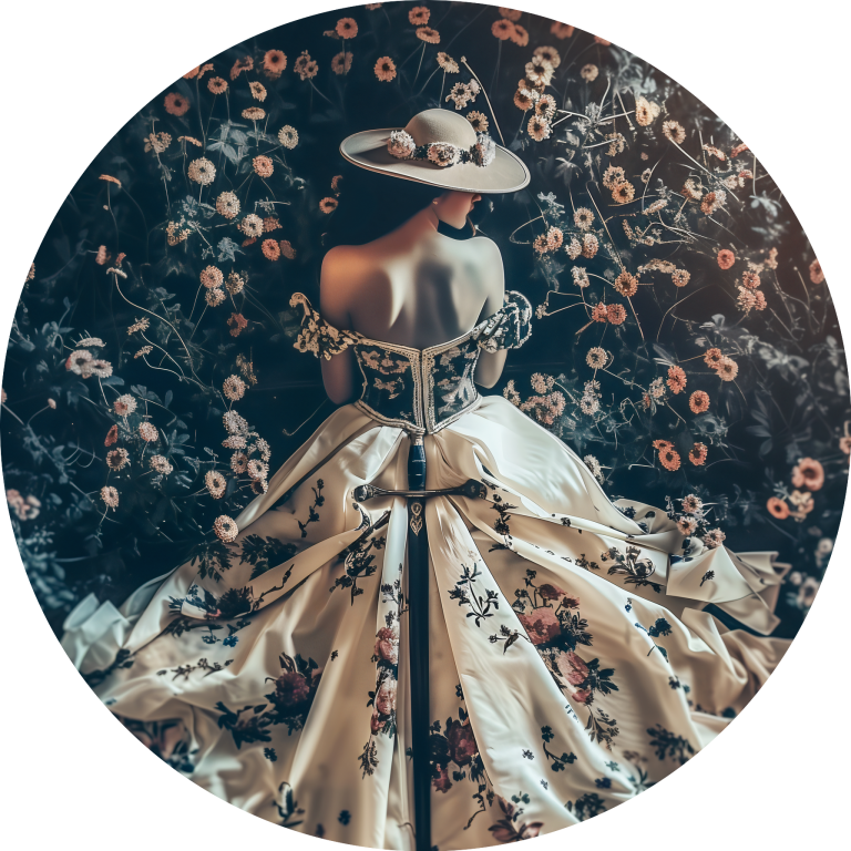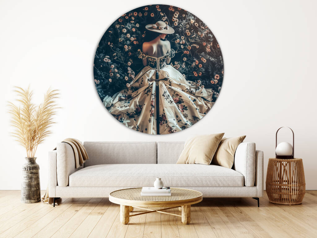 Een betoverende compositie waarin een vrouw wordt afgebeeld te midden van een weelderig veld vol bloemen. Haar elegante jurk, rijkelijk versierd met een bloemmotief, ligt uitgestrekt over de grond, terwijl haar houding en hoed een dromerige, bijna sprookjesachtige sfeer oproepen. De gedempte kleuren en het zachte licht creëren een harmonieus samenspel tussen de vrouw en haar omgeving, die zowel romantiek als melancholie uitstraalt. Het tafereel voelt als een stil moment uit een verhaal vol mysterie en schoonheid.