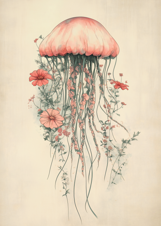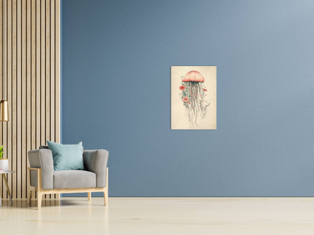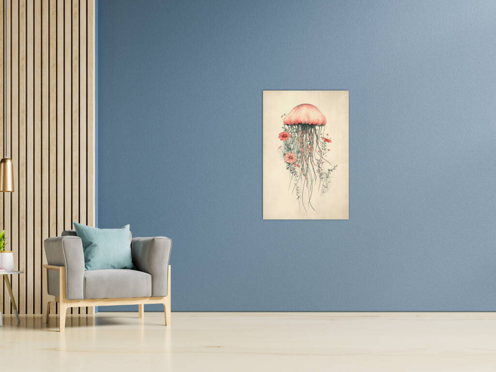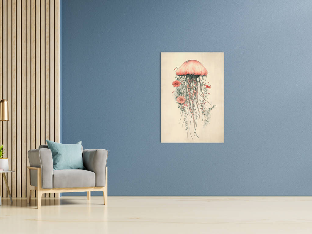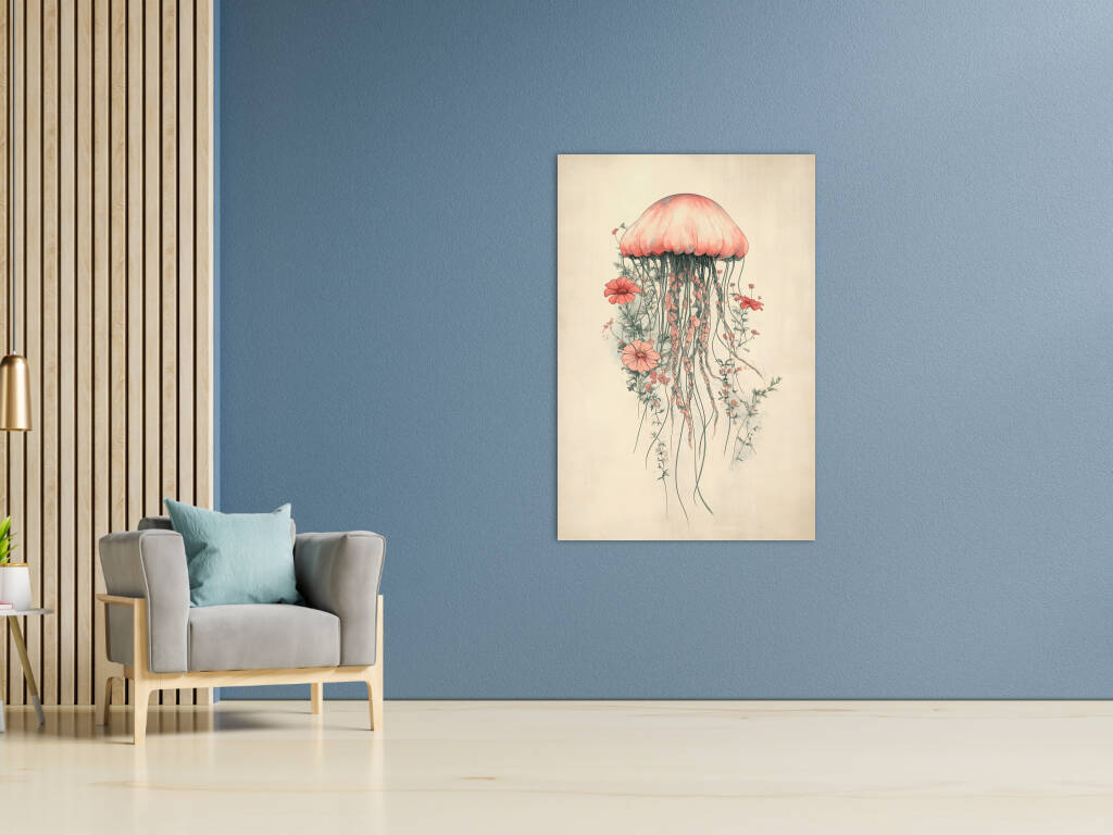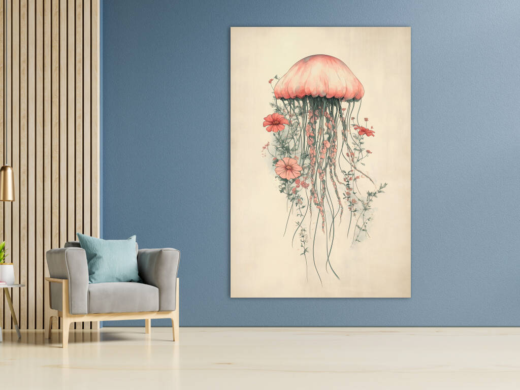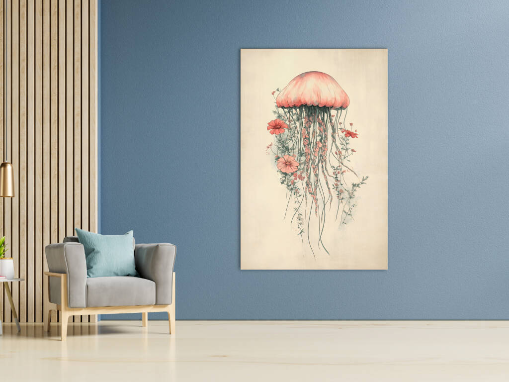 Floral Jellyfish toont een dromerige fusie van zee en land waar een kwal getransformeerd is tot een zwevende bloementuin. De zachtroze tentakels zijn versierd met delicate bloemen in pastelkleuren, waardoor een poëtisch beeld ontstaat van natuurlijke harmonie. Dit fantasierijke kunstwerk combineert botanische schoonheid met maritieme mystiek op een betoverende manier. Perfect voor dromerige zielen die houden van zachte kleuren en fantasievolle natuurinterpretaties.