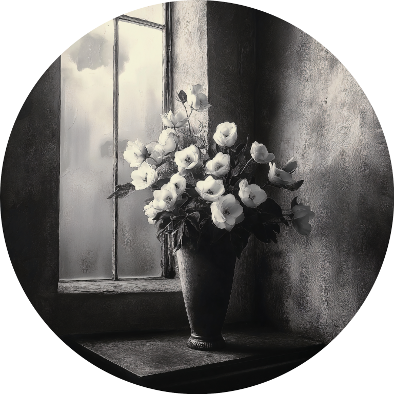 Monochrome Bouquet toont een verstild stilleven waar delicate witte bloemen het zachte licht vangen dat door een raam naar binnen valt. De klassieke zwart-wit compositie en het subtiele spel van licht en schaduw creëren een sfeer van tijdloze elegantie en melancholie. Dit poëtische beeld herinnert aan de schoonheid van eenvoud en de kracht van monochrome fotografie. Perfect voor liefhebbers van klassieke stillevens en de serene schoonheid van zwart-wit kunst.