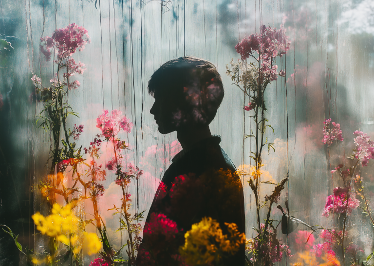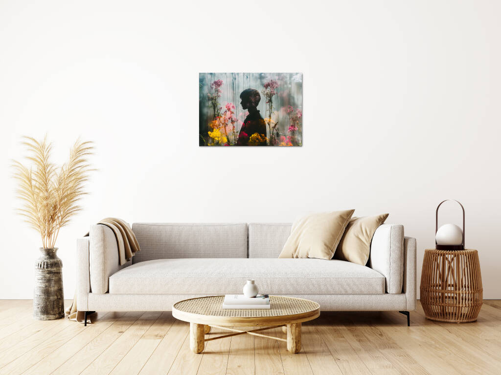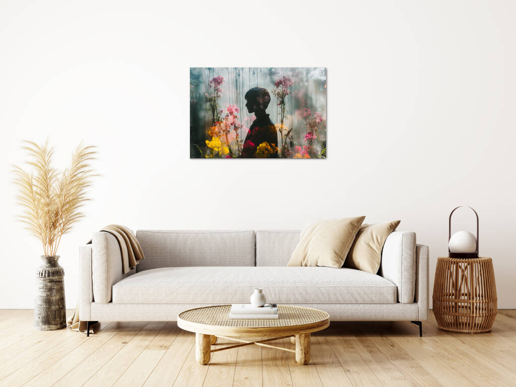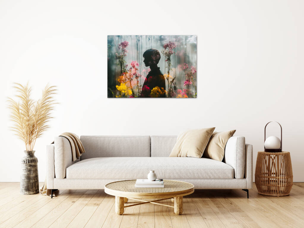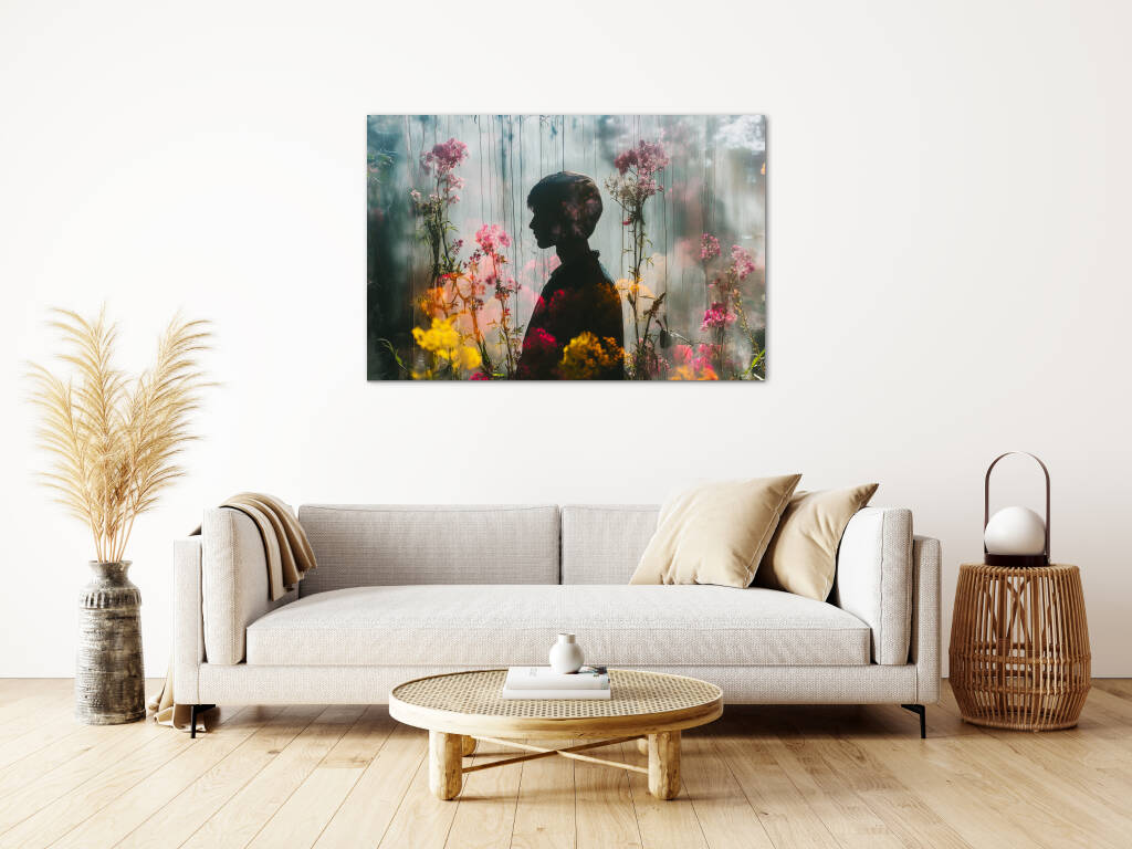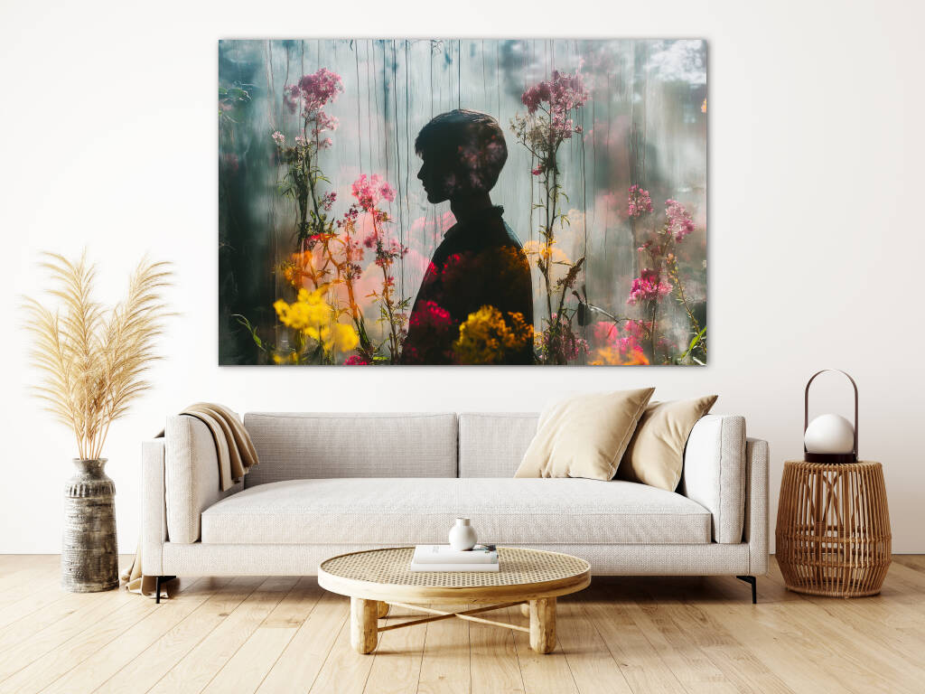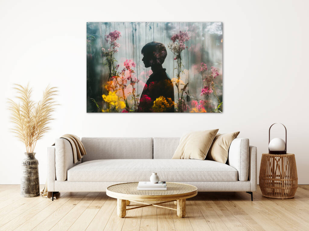 Floral Exposure toont een poëtische dubbele belichting waarin het silhouet van een persoon samenvloeit met een bloemrijke tuin vol kleurrijke bloemen. De artistieke techniek creëert een dromerige, surrealistische compositie waarbij de natuur en de menselijke vorm een harmonieuze eenheid vormen. De zachte kleuren en de delicate overgangen tussen figuur en flora geven het kunstwerk een meditatieve en romantische uitstraling. Dit contemplatieve meesterwerk symboliseert de diepe verbinding tussen mens en natuur.