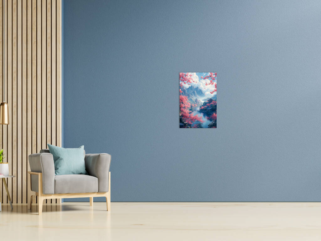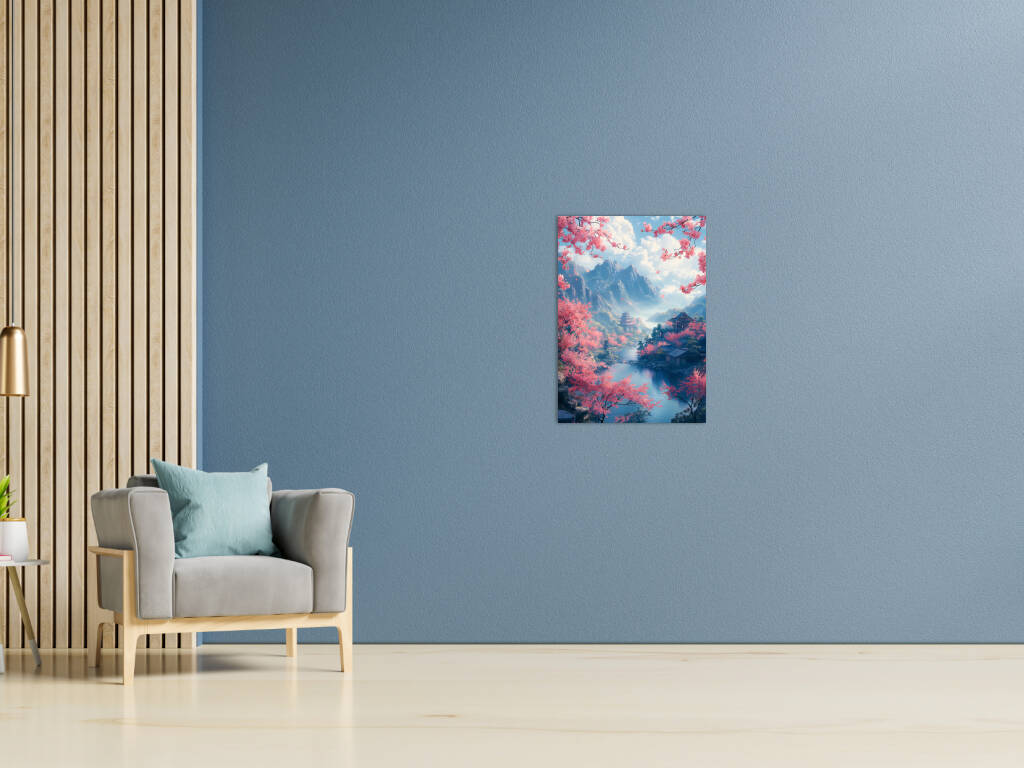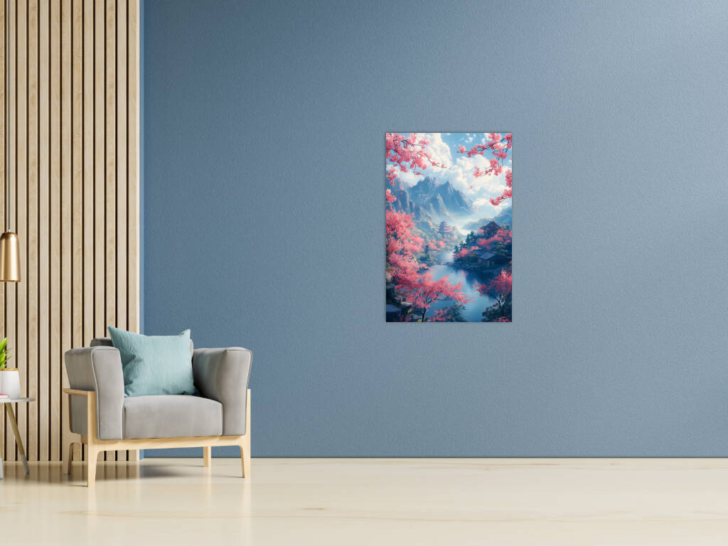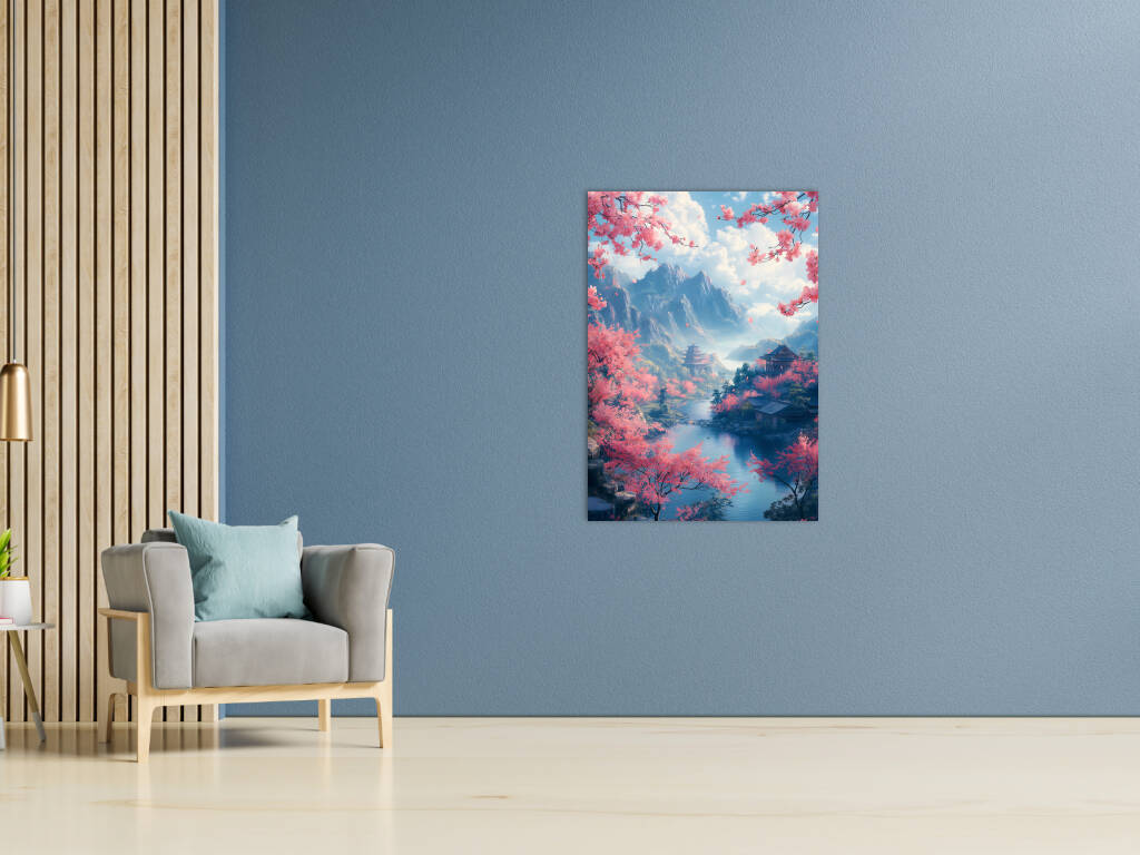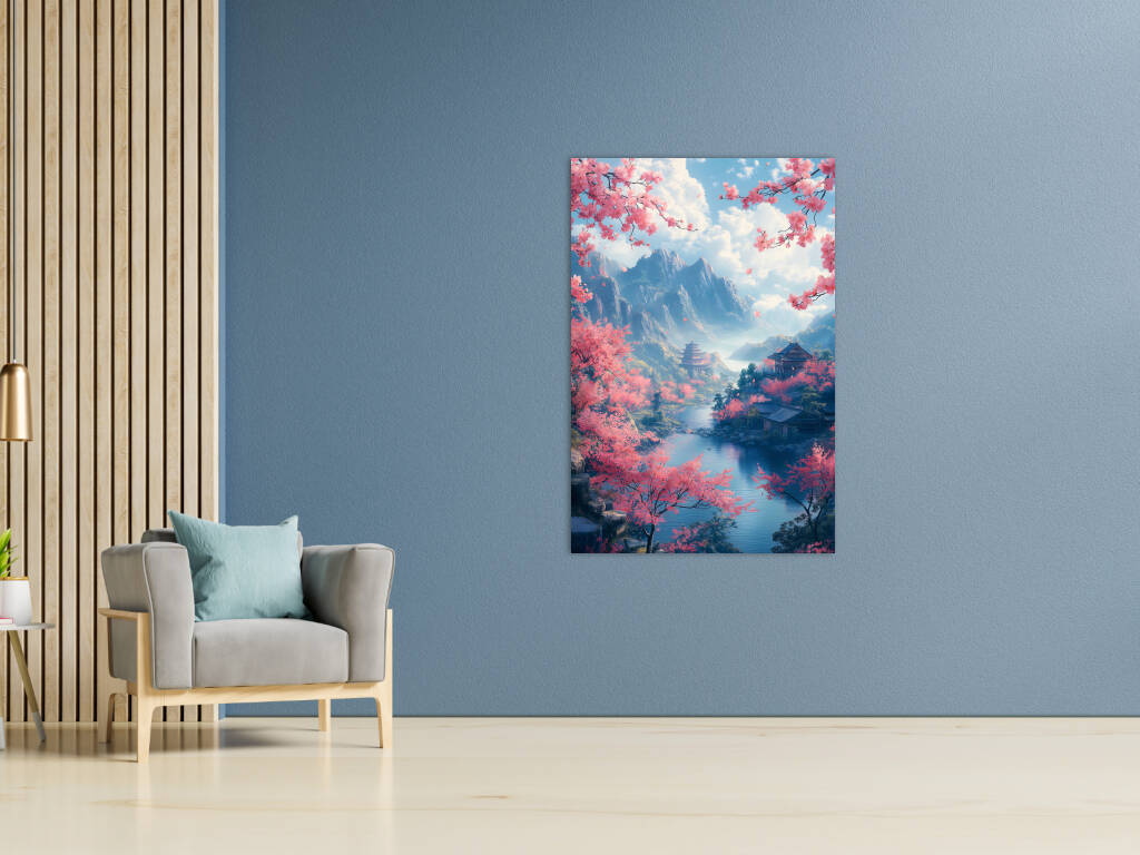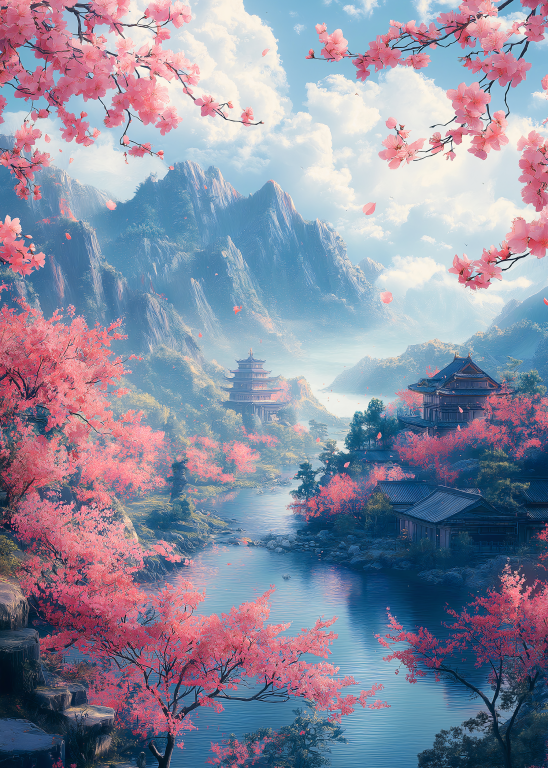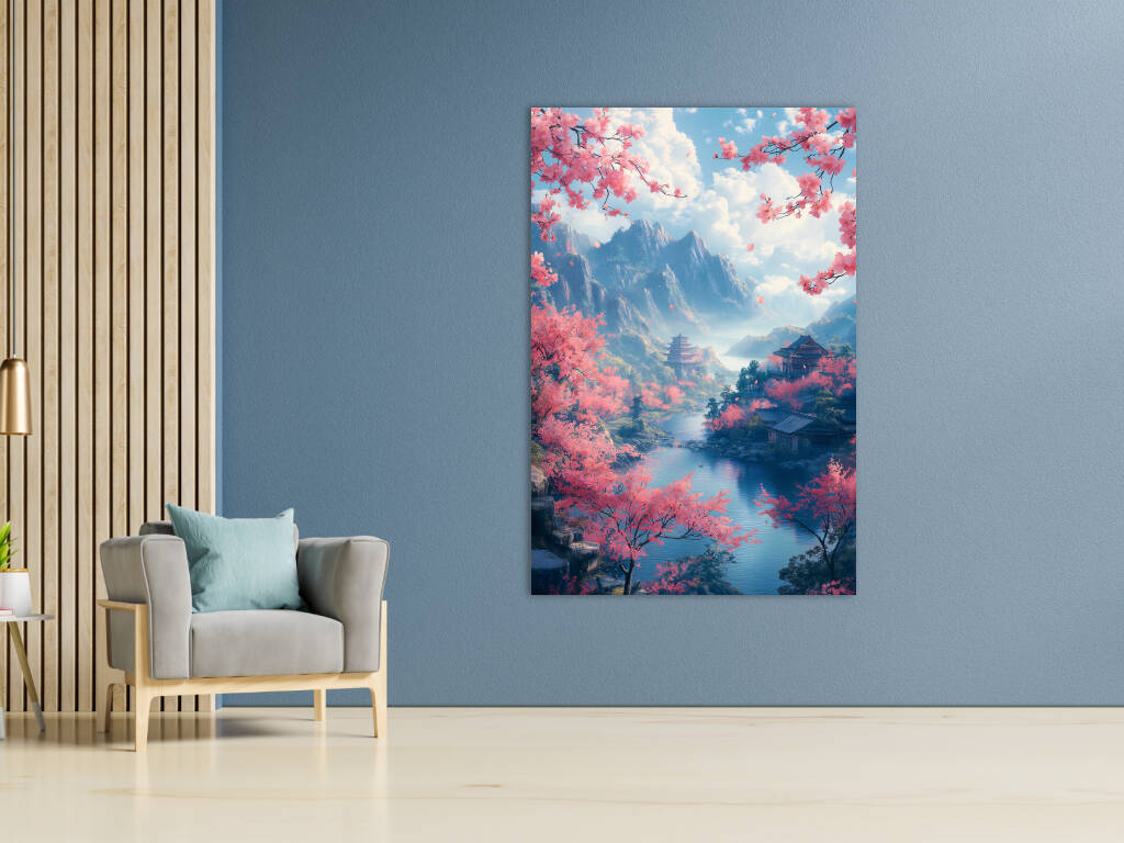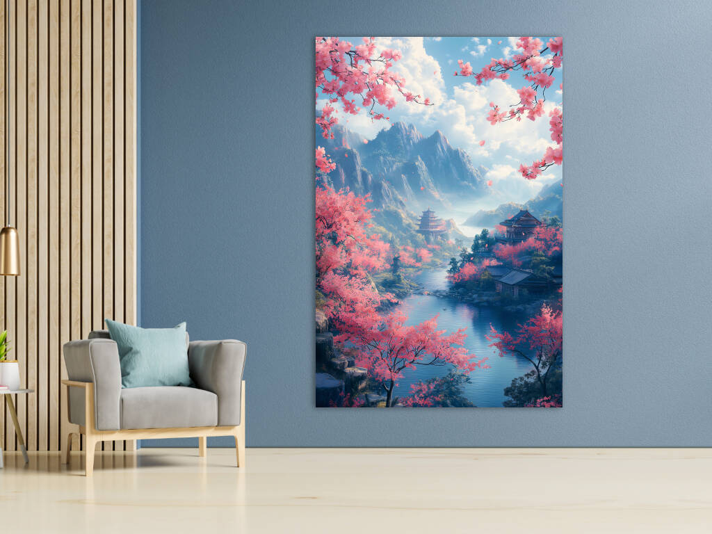Peaceful Valley toont een betoverend Aziatisch landschap waarin een serene rivier zich slingert door een vallei vol roze kersenbloesems. De traditionele tempels en paviljoens nestelen zich harmonieus tussen de bloeiende bomen, terwijl majestueuze bergen zich verheffin in de mistige verte. De zachte pastelkleuren en de dromerige atmosfeer creëren een gevoel van pure tranquilliteit en spirituele rust. Dit poëtische kunstwerk brengt de tijdloze schoonheid van de Oosterse natuur en architectuur in een perfect evenwicht van sereniteit en elegantie.