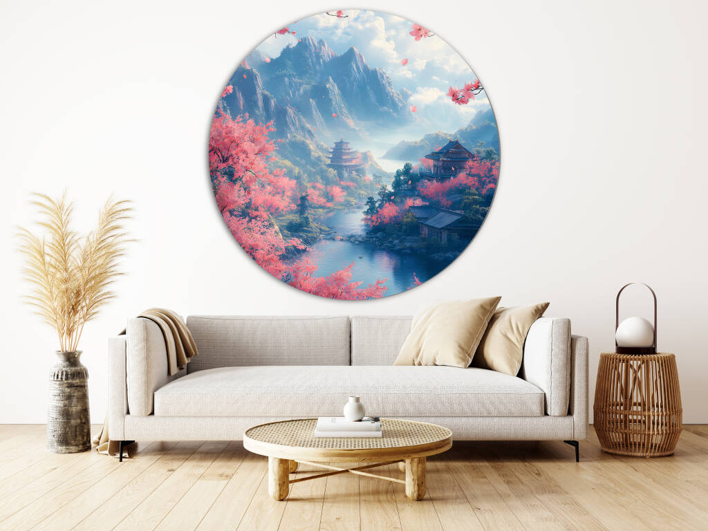 Peaceful Valley toont een betoverend Aziatisch landschap waarin een serene rivier zich slingert door een vallei vol roze kersenbloesems. De traditionele tempels en paviljoens nestelen zich harmonieus tussen de bloeiende bomen, terwijl majestueuze bergen zich verheffin in de mistige verte. De zachte pastelkleuren en de dromerige atmosfeer creëren een gevoel van pure tranquilliteit en spirituele rust. Dit poëtische kunstwerk brengt de tijdloze schoonheid van de Oosterse natuur en architectuur in een perfect evenwicht van sereniteit en elegantie.