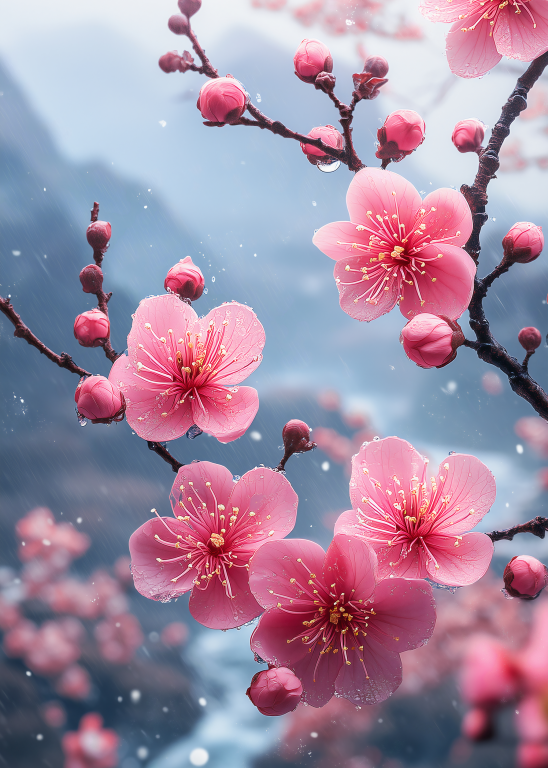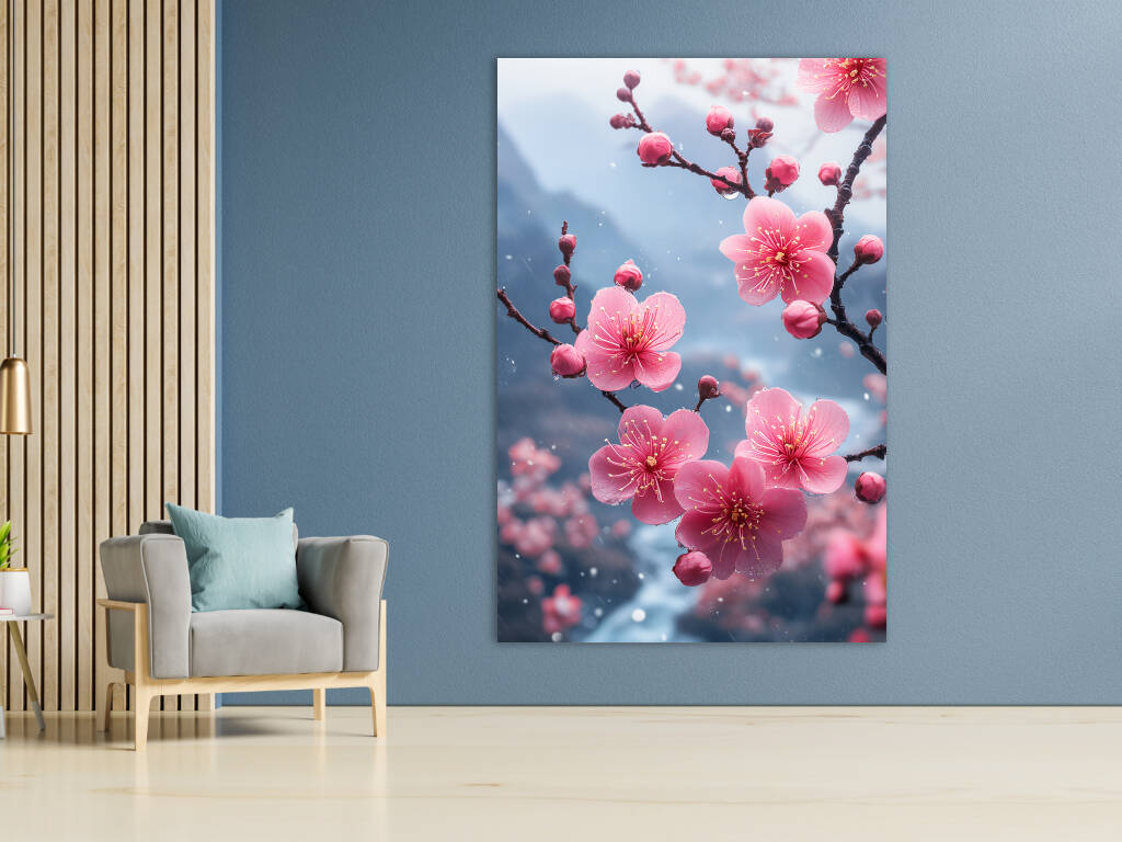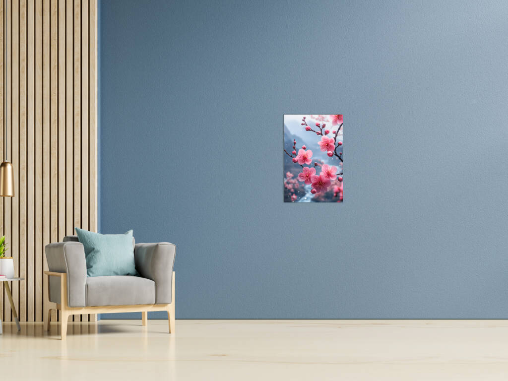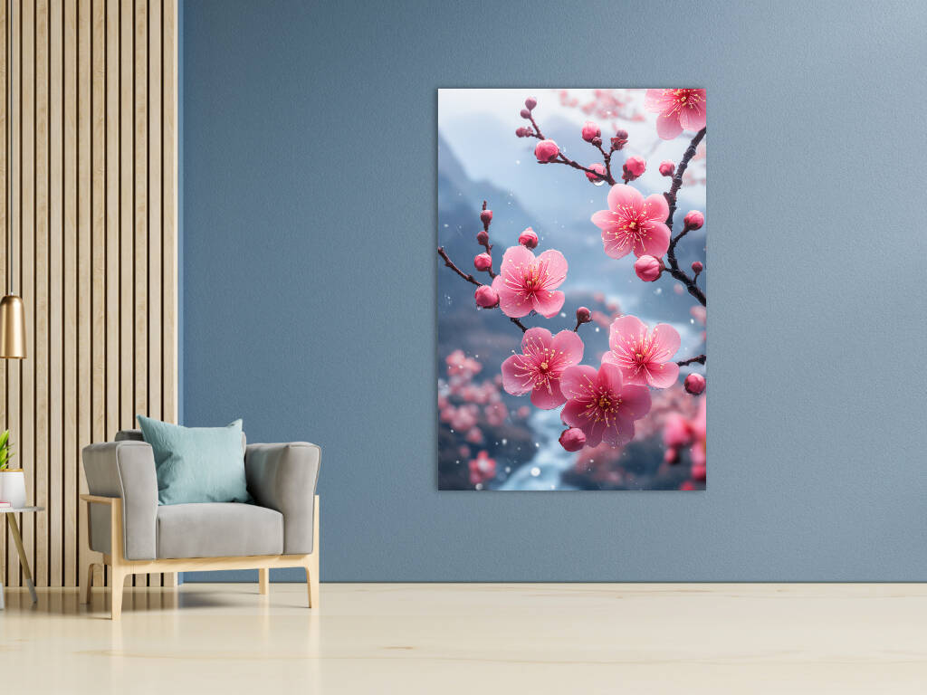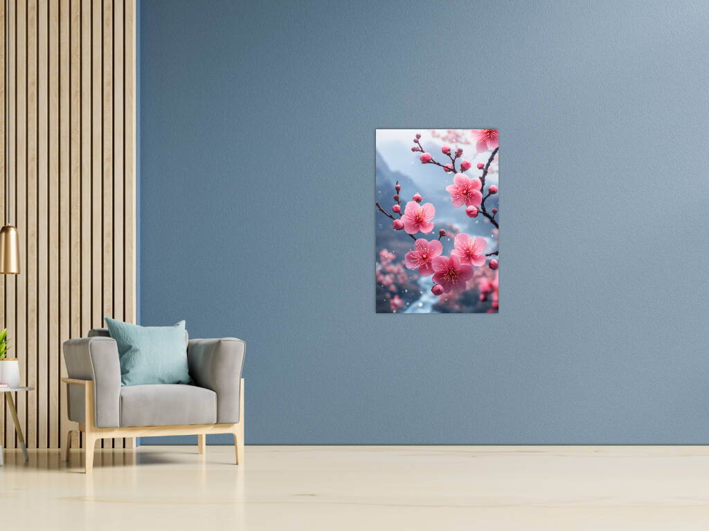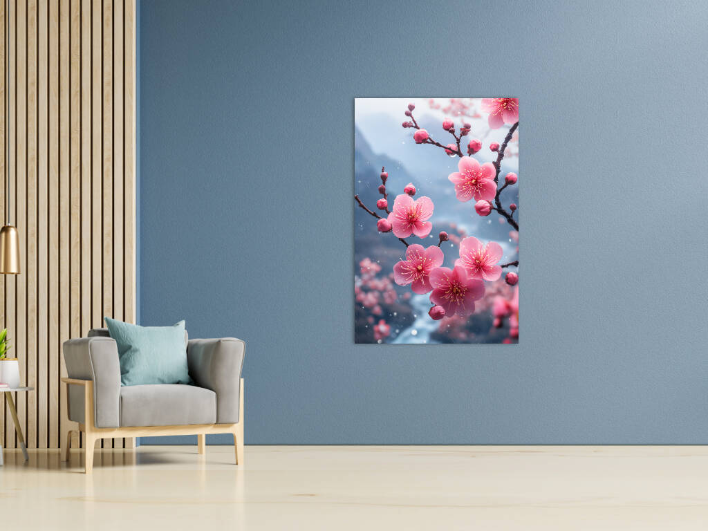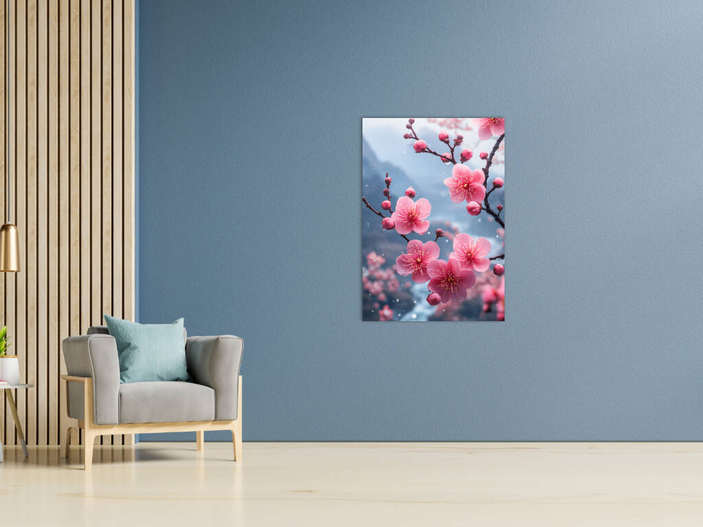 Mountain Flower toont de delicate schoonheid van kersenbloesems tegen een mystiek berglandschap. Roze bloemen ontvouwen zich in volle pracht op donkere takken, terwijl zachte sneeuwvlokken neerdwarrelen in een serene dans. De wazige bergen op de achtergrond creëren een gevoel van diepte en afzondering, alsof deze bloesems bloeien in een verborgen vallei ver van de bewoonde wereld. Het contrast tussen de kwetsbare bloemblaadjes en het ruige berglandschap symboliseert de kracht van schoonheid in adversiteit. De zachte kleurgradiënten van roze naar blauwgrijs roepen een sfeer op van vredige contemplatie. Dit werk viert de vluchtige maar overweldigende schoonheid van de lente in bergachtige streken, waar elk bloemetje een klein wonder is.