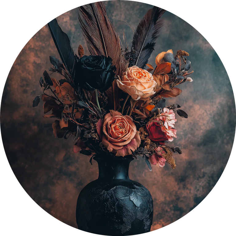 Withering Bouquet toont de poëtische schoonheid van vergankelijkheid waar verwelkende bloemen hun laatste dans uitvoeren in een donkere, klassieke vaas. De warme amber- en koperkleuren contrasteren prachtig met de mysterieuze achtergrond, terwijl de dramatische belichting elke roos en veer tot leven brengt. Dit melancholieke meesterwerk spreekt tot de ziel en herinnert ons aan de kostbare schoonheid van elk moment. Een indrukwekkende keuze voor liefhebbers van romantische en gotische esthetiek.