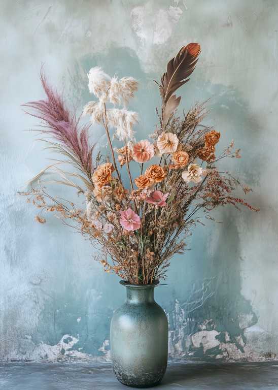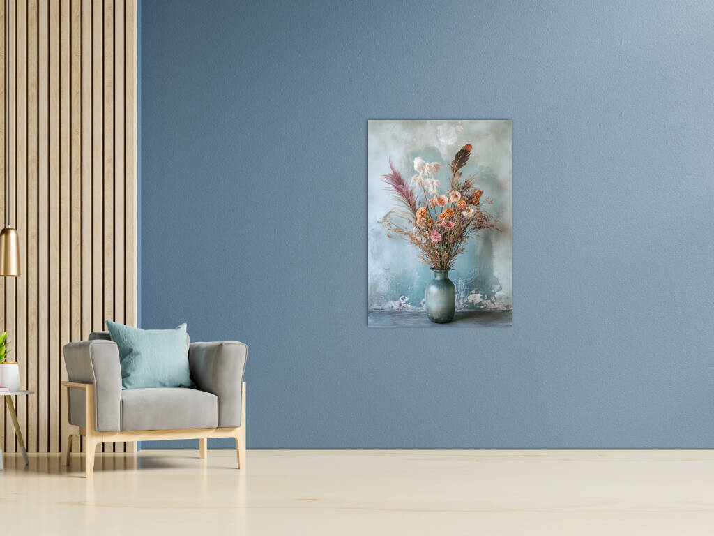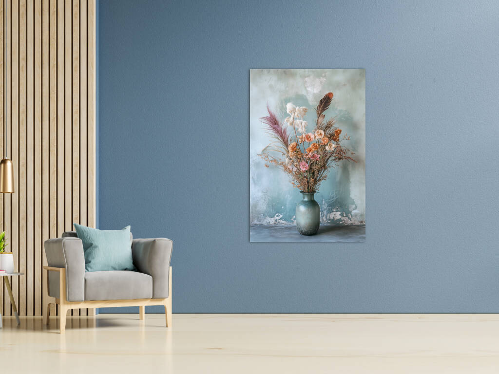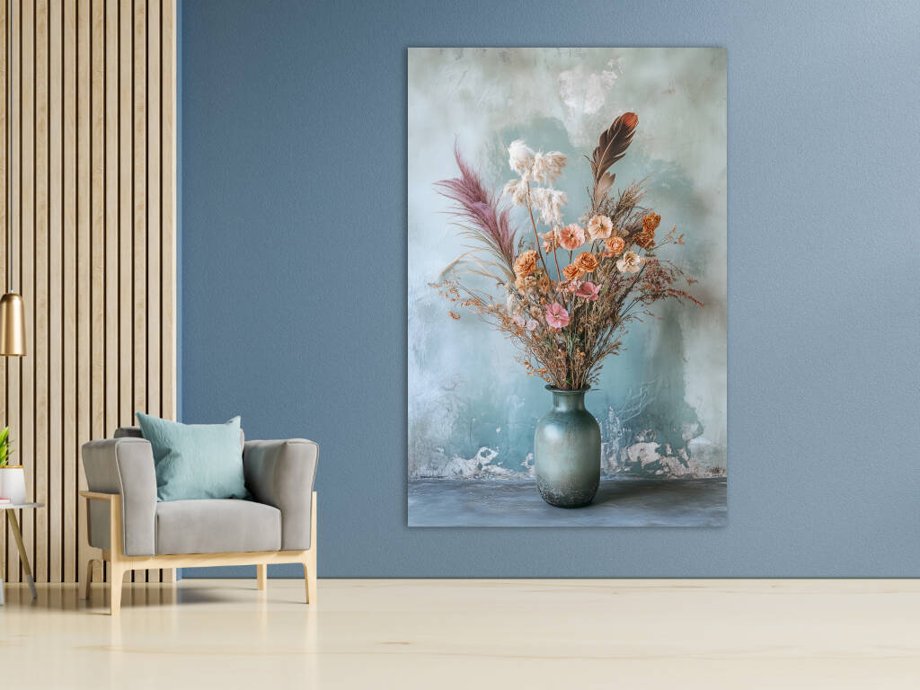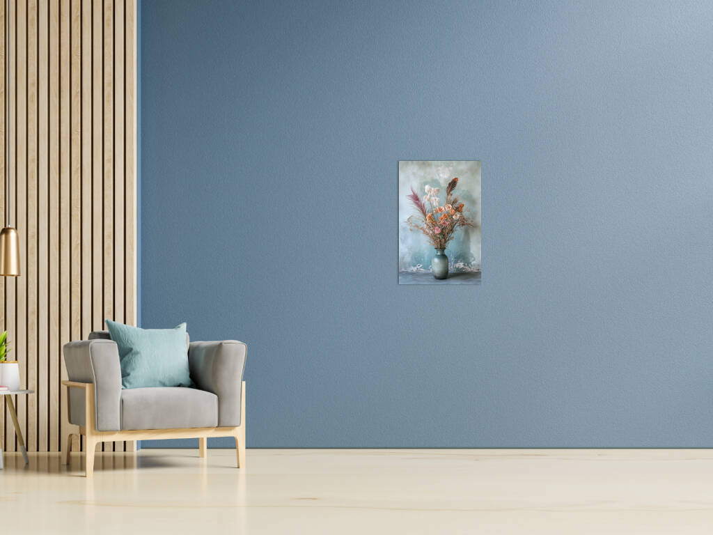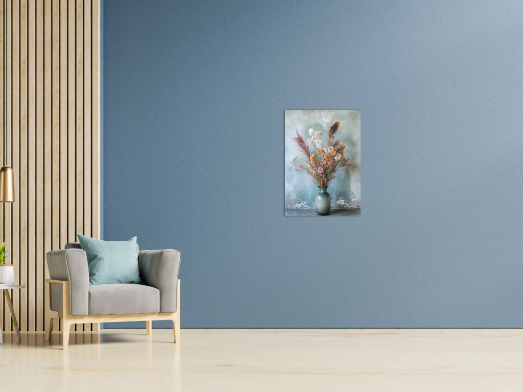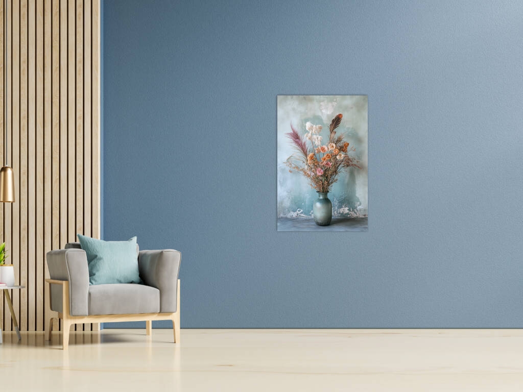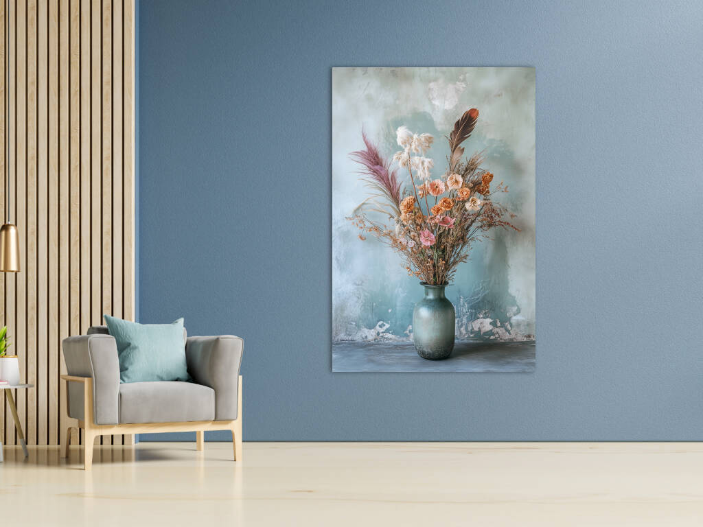 Dried Bouquet toont een nostalgische stilleven compositie waarin gedroogde bloemen en siergrassen zijn samengebracht in een elegante vaas. De zachte beige en bruine tinten van de gedroogde botanische elementen contrasteren subtiel met de verweerde blauwe achtergrond, die de charme van vergane tijd uitstraalt. De delicate texturen van pampagras en gedroogde bloemen creëren een gevoel van rustieke elegantie en natuurlijke schoonheid. Dit tijdloze kunstwerk brengt de serene sfeer van een landelijk interieur direct in je leefruimte.