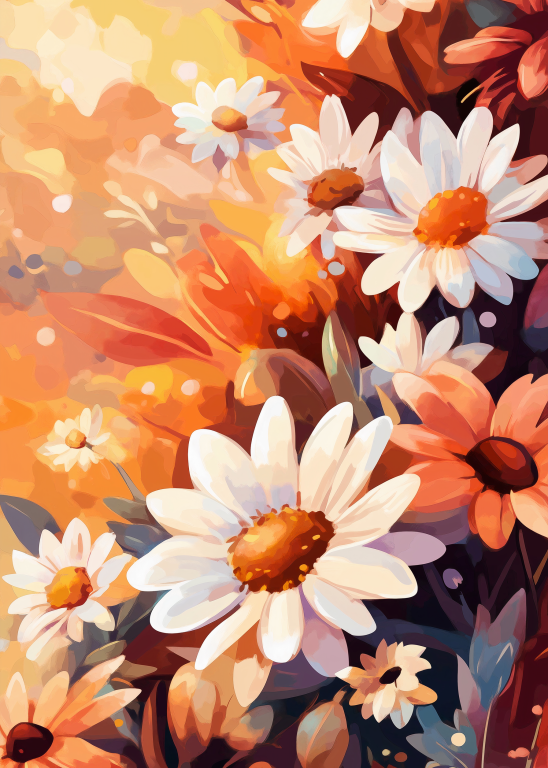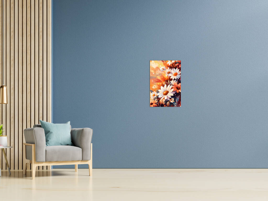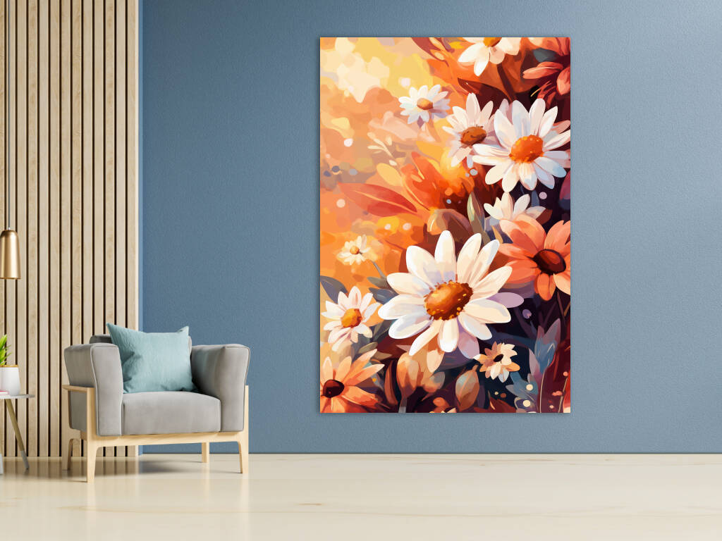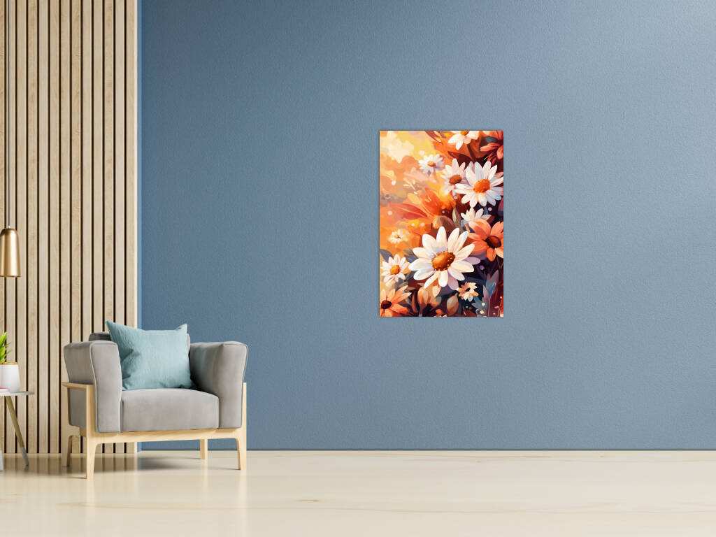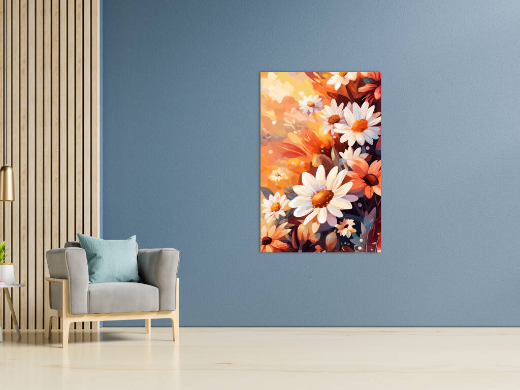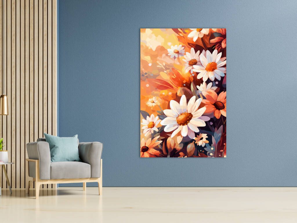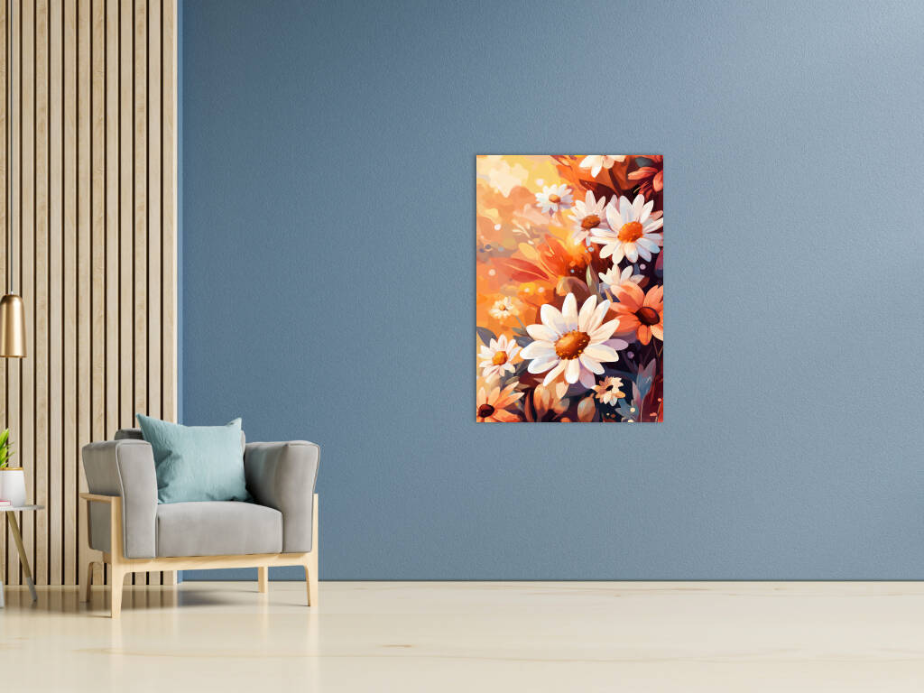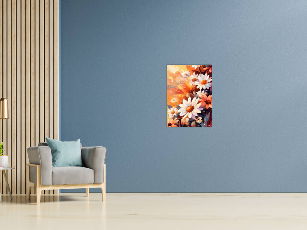 Daisies toont een levendige collectie van witte madeliefjes die baden in warm zonlicht en omgeven worden door een symfonie van oranje en gouden tinten. De bloemen lijken te dansen in een zachte bries, waarbij hun witte blaadjes en goudgele hartjes een vrolijk contrast vormen met de warme, herfstachtige achtergrond. De impressionistische stijl en de zachte overgangen tussen de kleuren creëren een gevoel van pure vreugde en natuurlijke schoonheid. Dit opwekkende kunstwerk brengt de frisheid van een bloemenveld direct in je interieur.