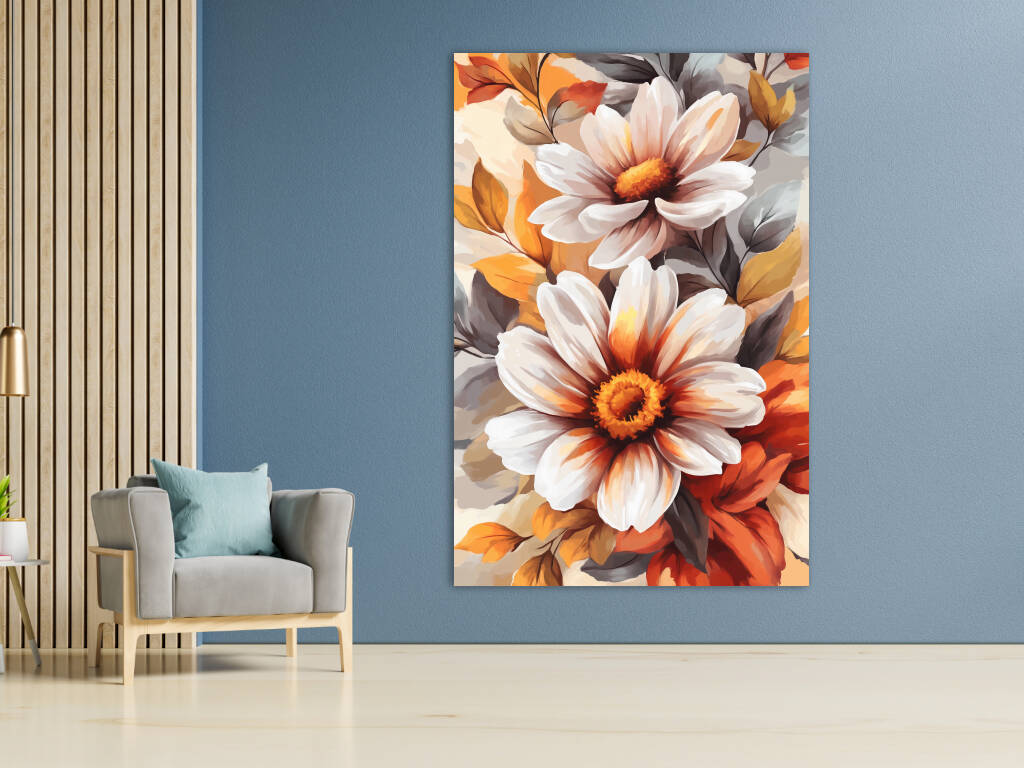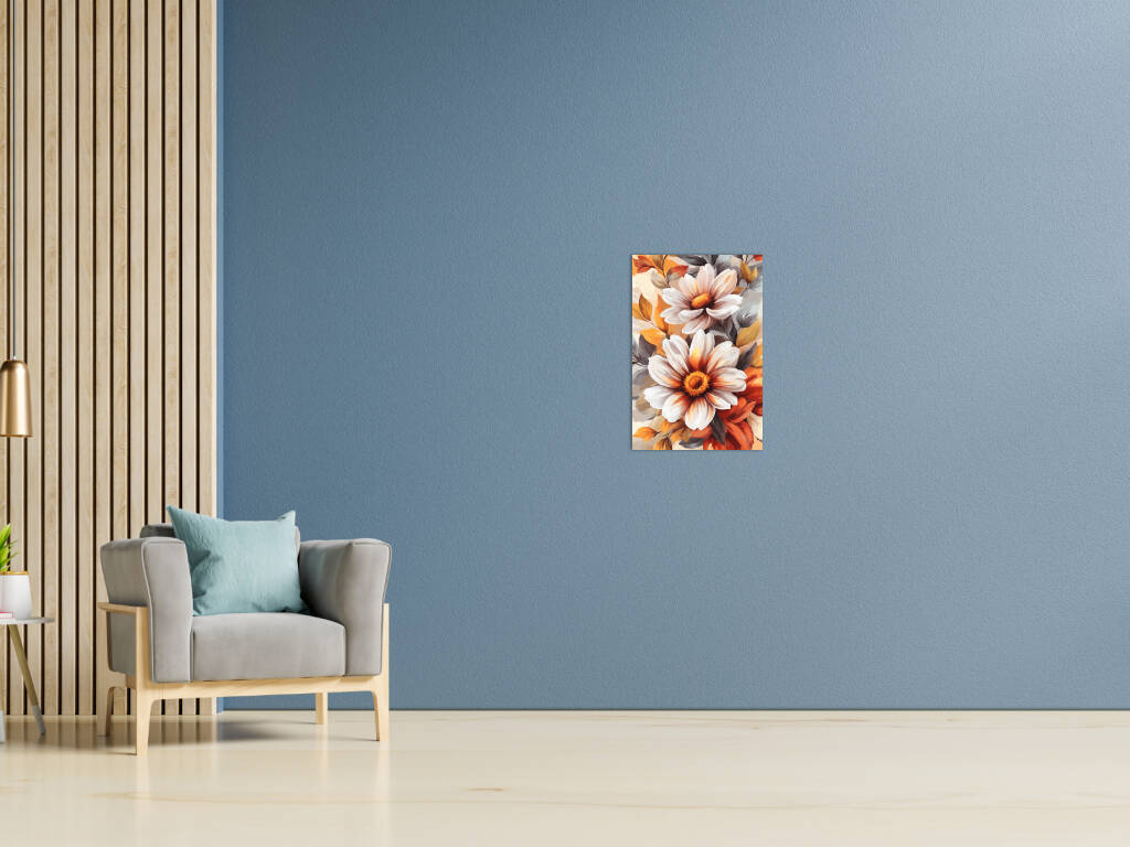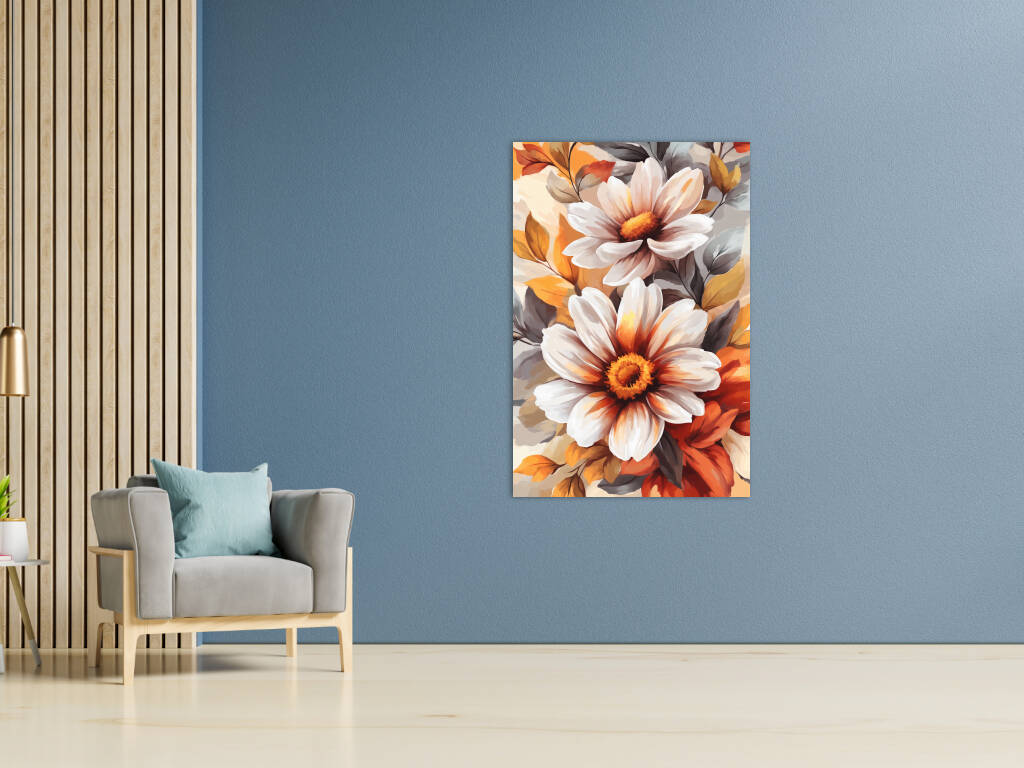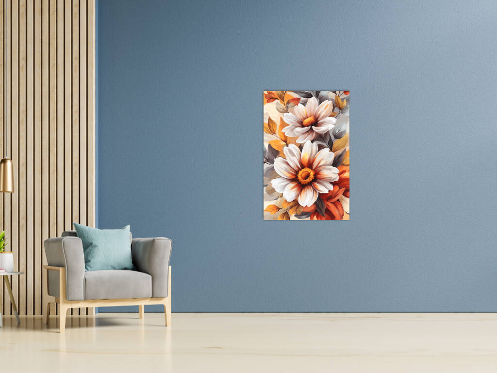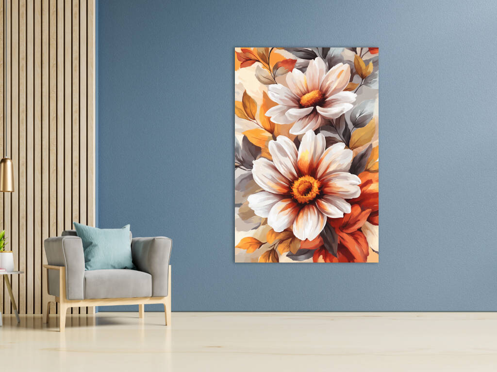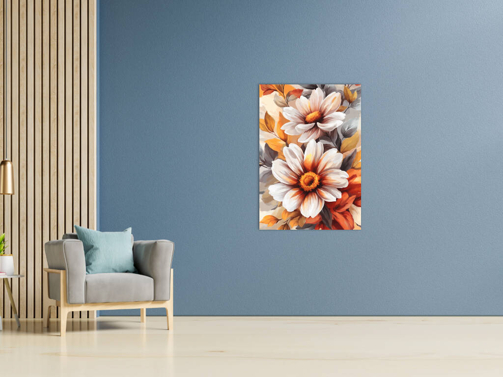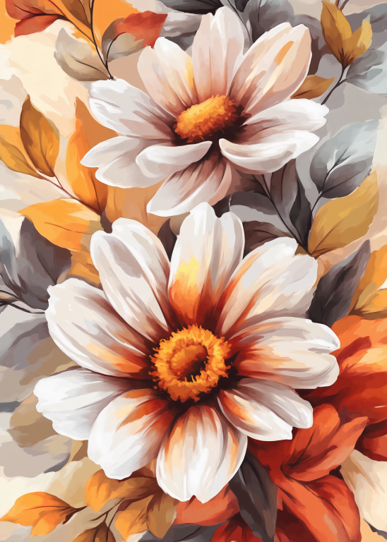 Double Daisy toont een prachtige dubbele compositie van twee magnolia-achtige bloemen die centraal staan in een warm herfsttafereel. De witte bloemblaadjes met hun oranje accenten contrasteren schitterend met de rijke herfstkleuren van het omringende bladwerk. De gedetailleerde weergave van elke vezel en textuur, gecombineerd met de zachte natuurlijke overgangen tussen de tinten, creëert een gevoel van pure botanische schoonheid. Dit elegante kunstwerk brengt de tijdloze charme van een bloementuin direct in je interieur.