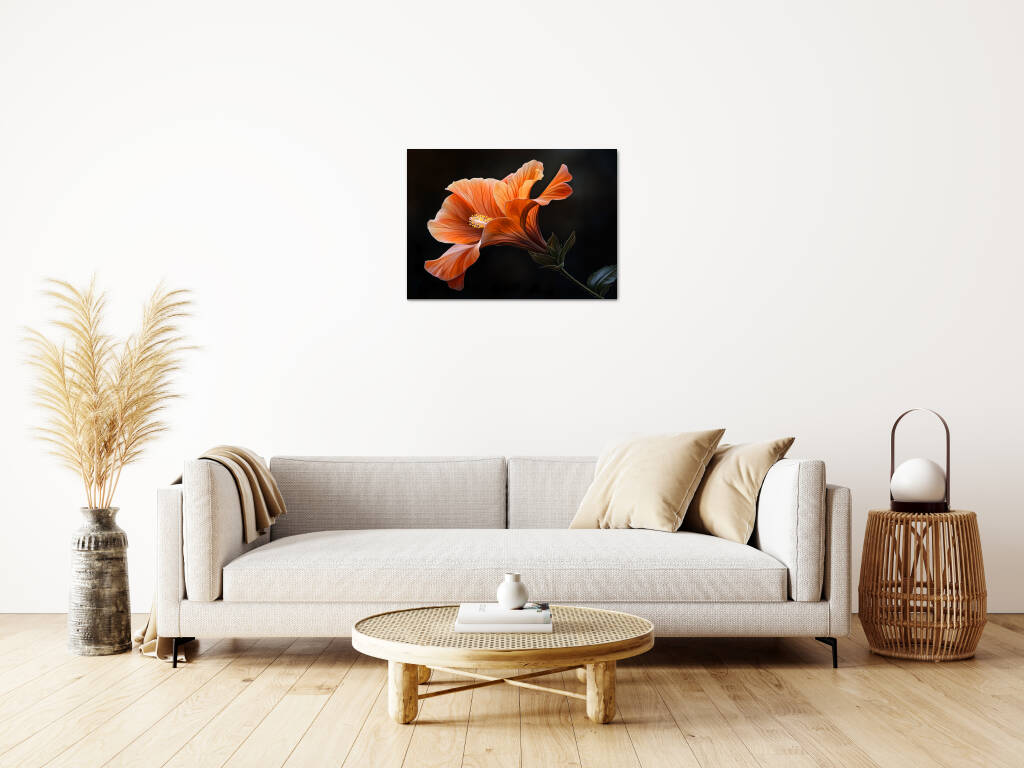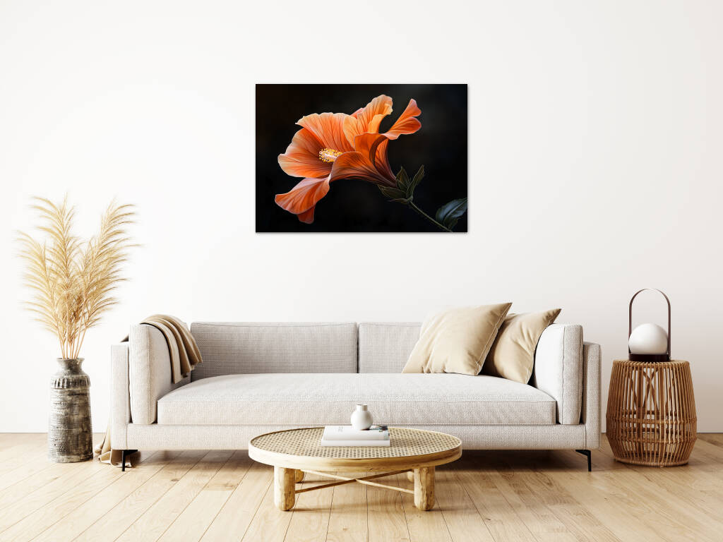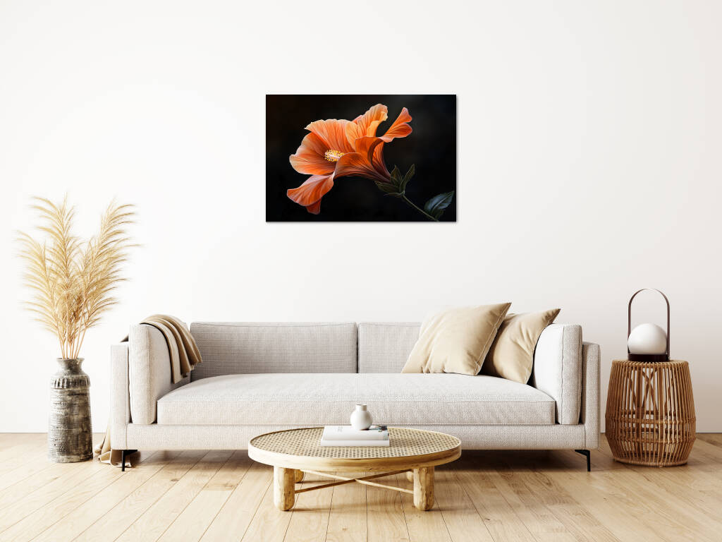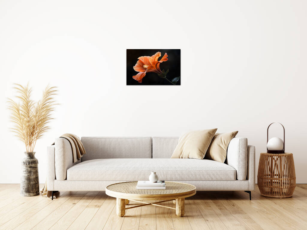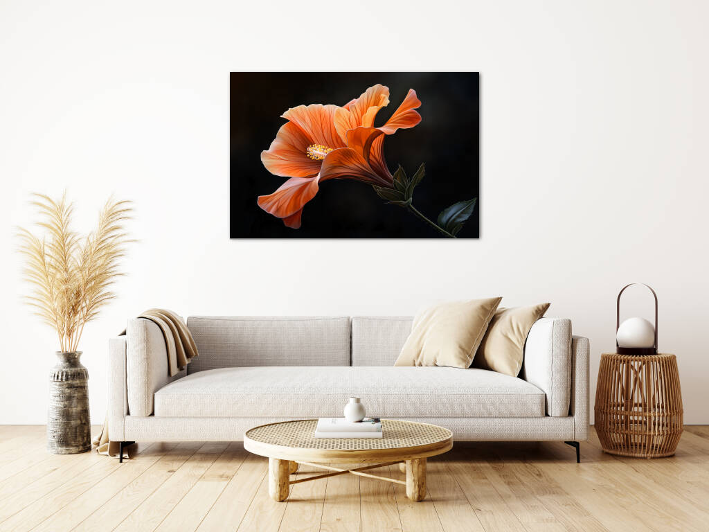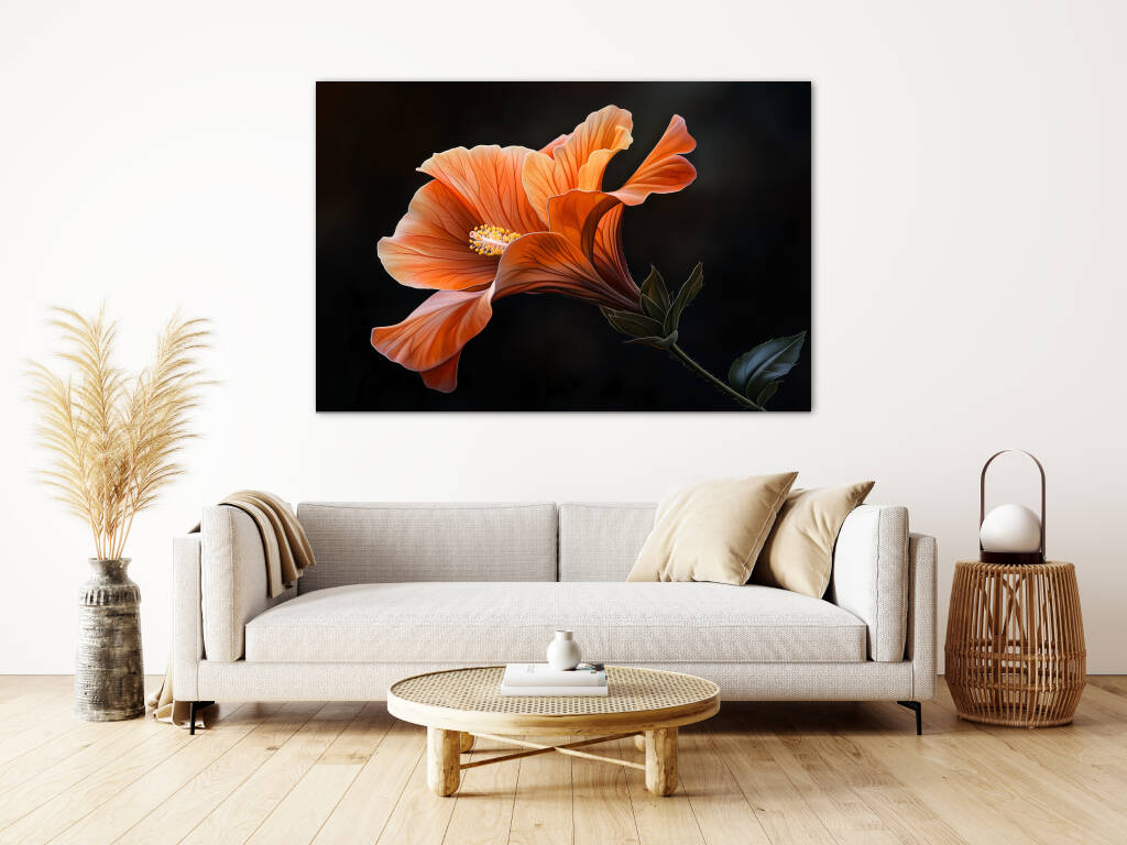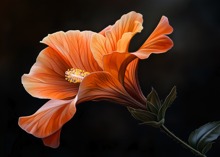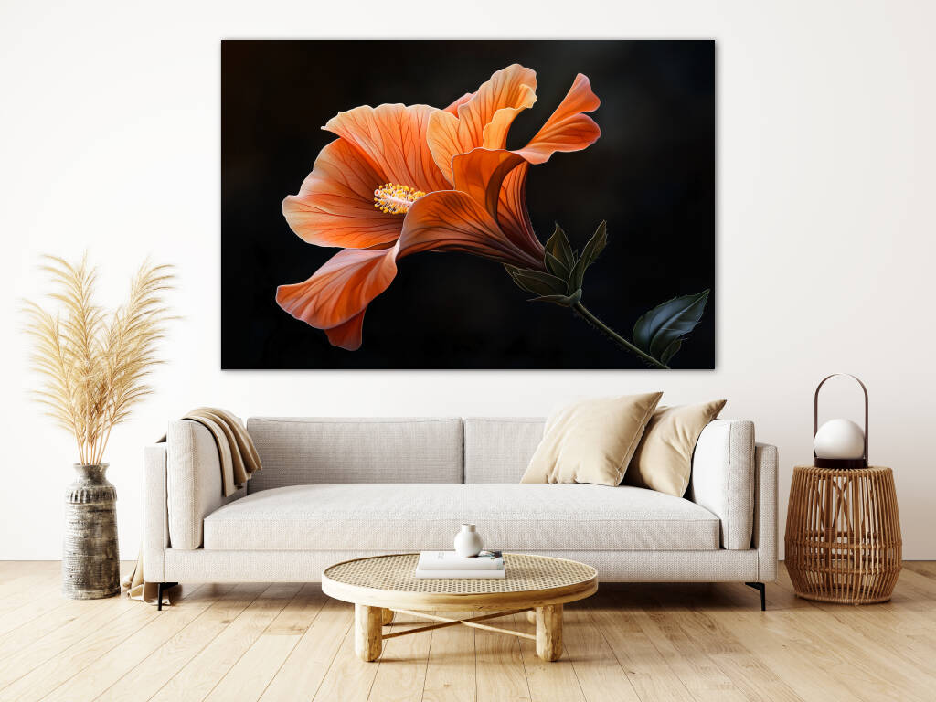 Orange Hibiscus toont de sublieme schoonheid van een bloeiende hibiscusbloem in warme oranje tinten tegen een dramatisch donkere achtergrond. De delicate bloemblaadjes met hun natuurlijke nervatuur en de gouden meeldraden creƫren een indrukwekkend spel van licht en schaduw. Deze botanische studie straalt tropische warmte en elegantie uit, waarbij elk detail van de bloem zorgvuldig is vastgelegd. Een verfijnde keuze voor liefhebbers van natuurfotografie en botanische kunst.