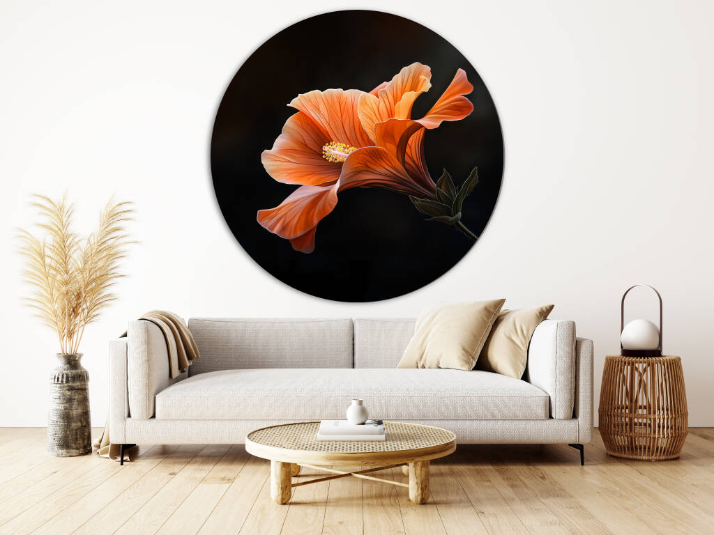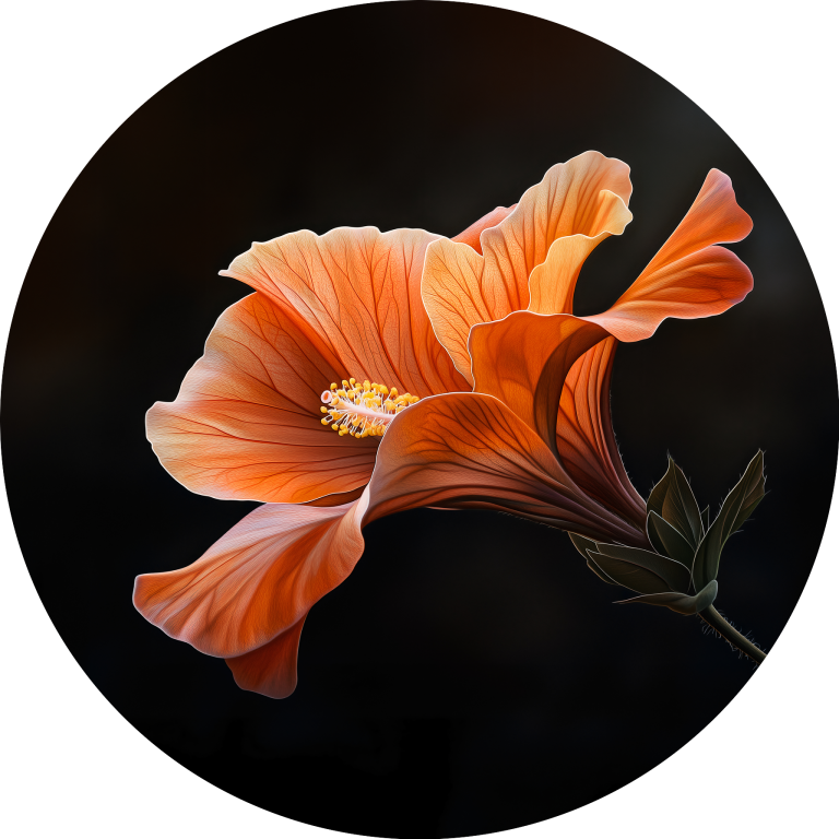 Orange Hibiscus toont de sublieme schoonheid van een bloeiende hibiscusbloem in warme oranje tinten tegen een dramatisch donkere achtergrond. De delicate bloemblaadjes met hun natuurlijke nervatuur en de gouden meeldraden creëren een indrukwekkend spel van licht en schaduw. Deze botanische studie straalt tropische warmte en elegantie uit, waarbij elk detail van de bloem zorgvuldig is vastgelegd. Een verfijnde keuze voor liefhebbers van natuurfotografie en botanische kunst.